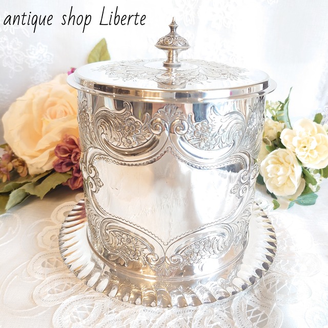 Size 高さ:20cm 幅:18.5cm 口径:13.5cm James Dixon & Sons silver plate antique biscuit box 立体的なモチーフが豪華な印象のシルバーのビスケットボックスです。 JD&Sのお得意の華やかなレリーフが大変素敵でゴージャスなお品です。 側面には経年による多少のスレや小傷がございますが、特記するような大きなダメージもなく、比較的綺麗なコンディションでございます。
