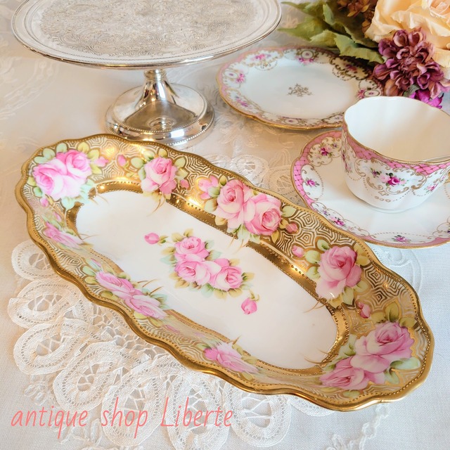 Size 27.8cm×13cm 高さ:4.2cm Old Noritake RC mark 1910年 オールドノリタケのピンクローズが美しい長皿です。 程よく深さもございますので、焼き菓子やマカロンなどを入れてお使い頂いても可愛らしいお品です アンティークのお品ですので、オールドノリタケの特性上、金彩の薄れ等一部に見られますが、使用感も少なめで比較的綺麗なコンディションでございます A8