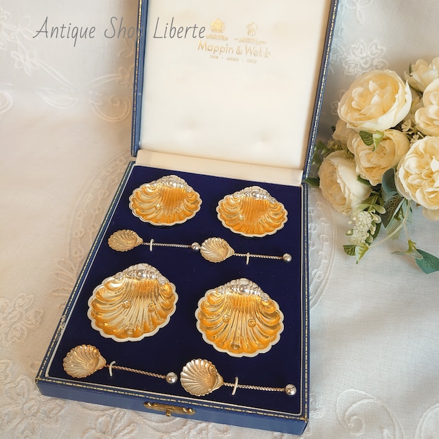 Size Dish:5cm×4.5cm 16.3g Spoon:6cm 2.6g Mappin&Webb Solt&Pepper Shell Dish Sterling Silver&Gold Plated 1986年 Sheffild マッピン&ウエッブ社のシェルディッシュです 薬味入れとしてお使い頂くお品で、お皿は貝殻の形をしております。 スプーンもシェルモチーフでとても可愛らしいデザインです 器、スプーンともに純銀です 内側は金メッキが施されております 4個セットで専用のケースに収納されております ケースも綺麗で全体的に非常に良いコンディションです おそらくデッドストック品かと思います