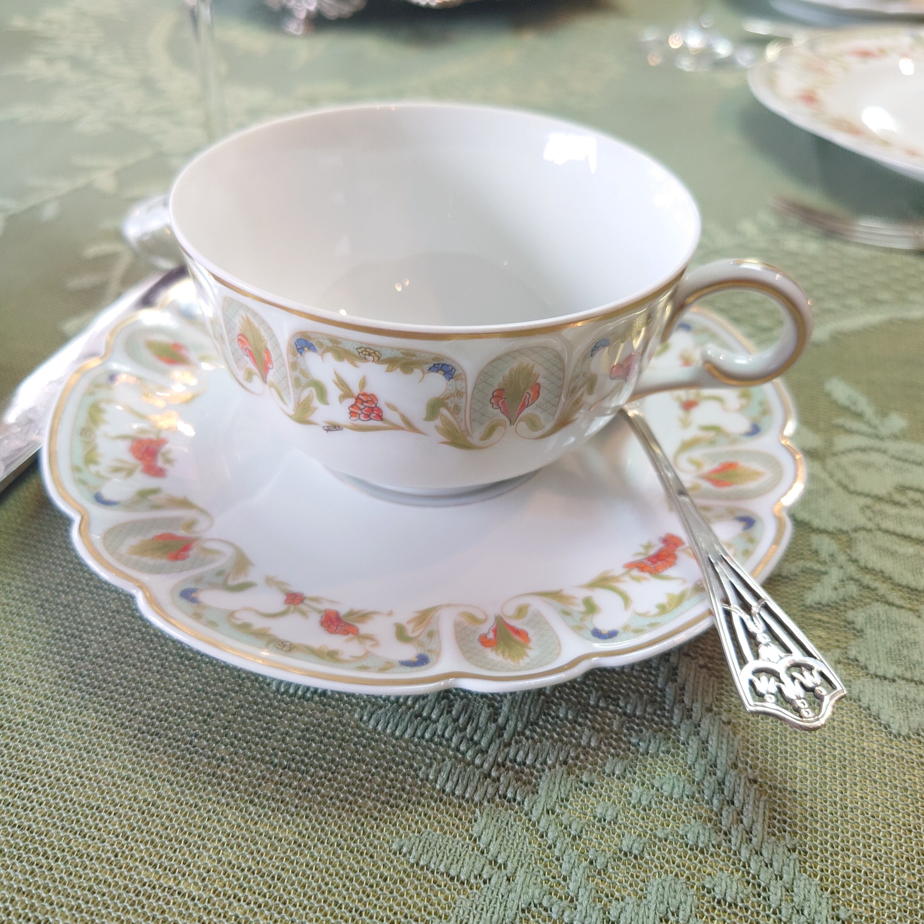 プレートやソーサーはお花型になっており、カップやプレートも単一なフラットではなく少し凹凸があり、立体感のある凝ったデザインのティーセットです