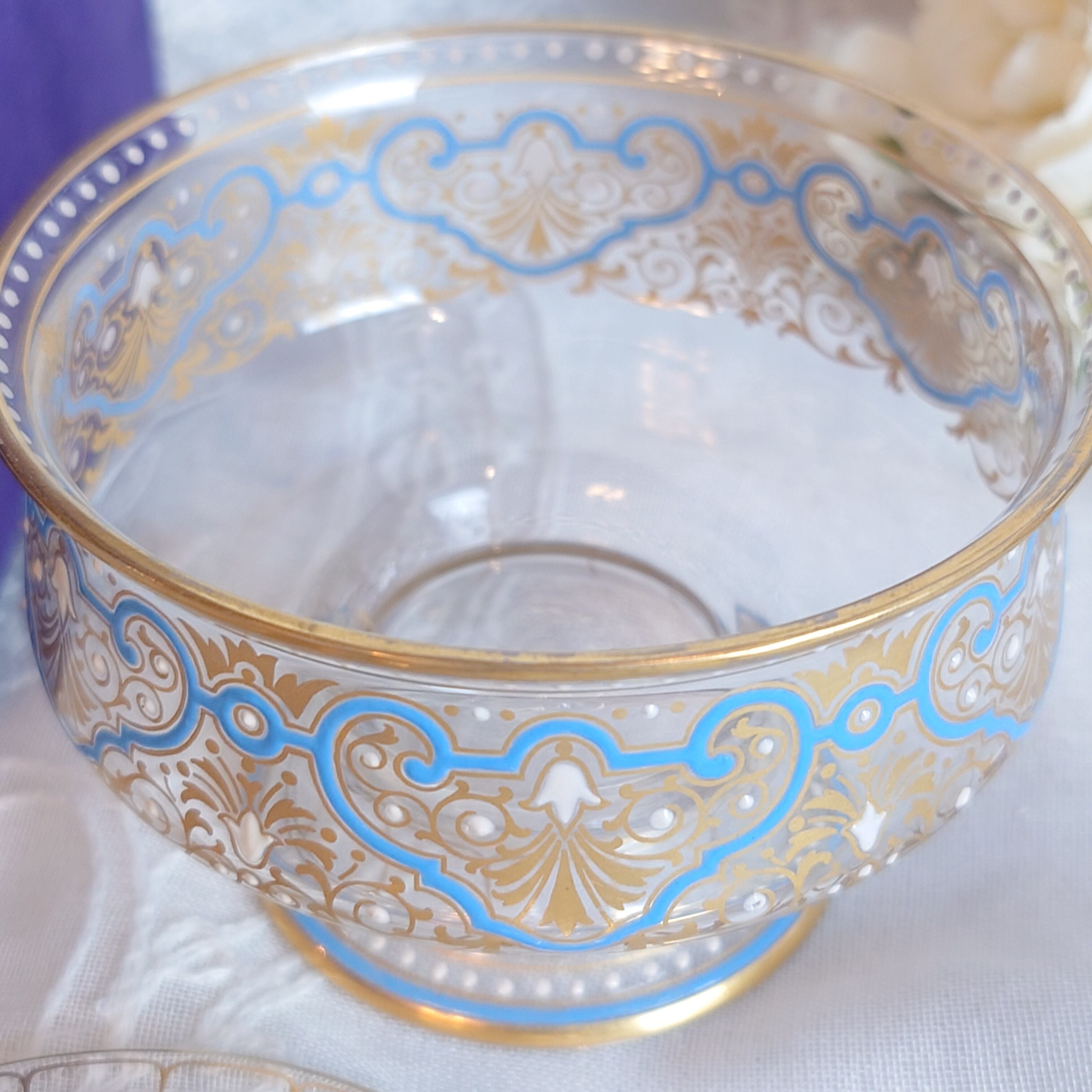 アンティークやヴィンテージガラスになりますので、多少のエナメルの薄れや金彩のスレはあるものとご理解下さいませ