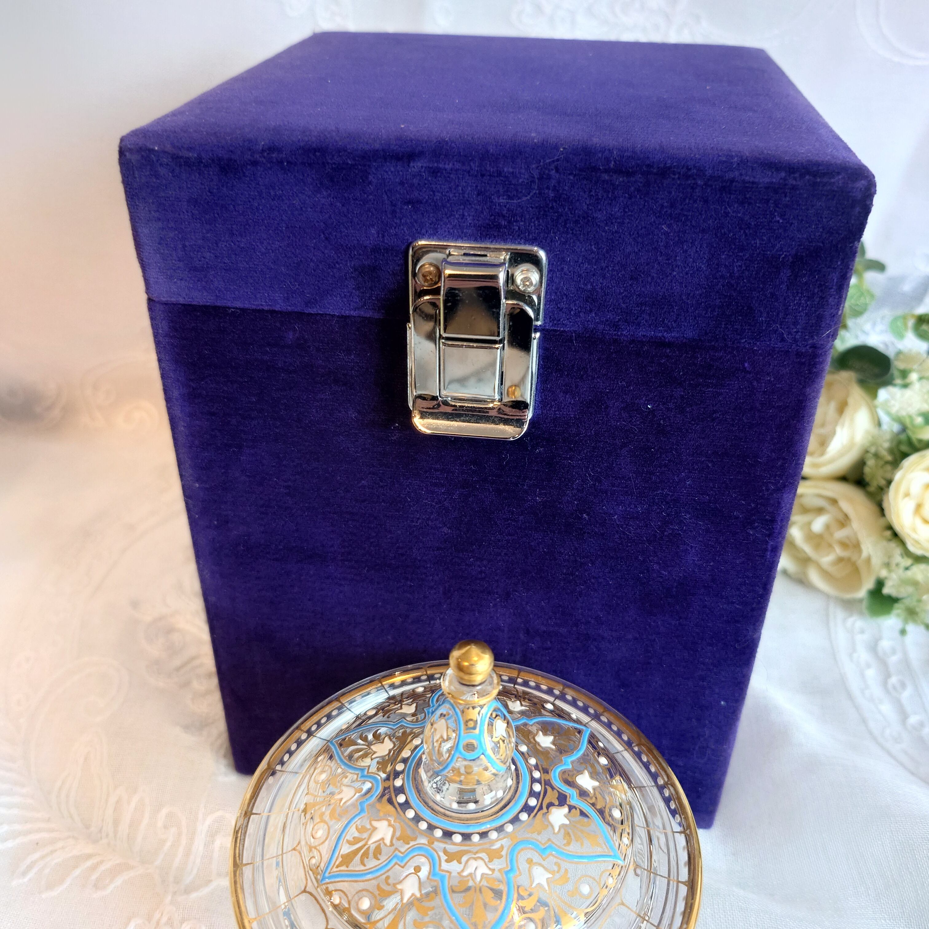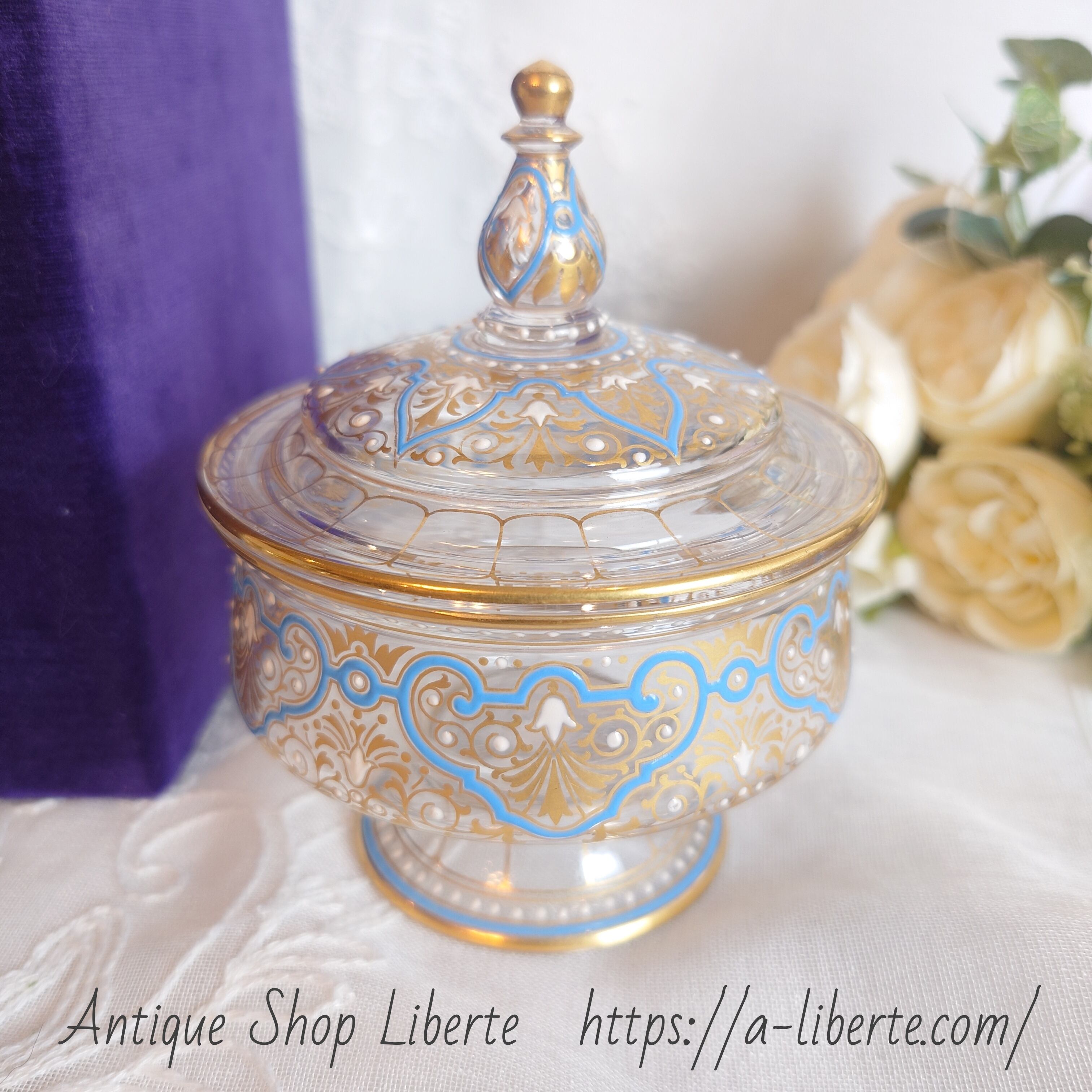 蓋付きのガラスの器で、色合いやデザインがオリエンタルな雰囲気です