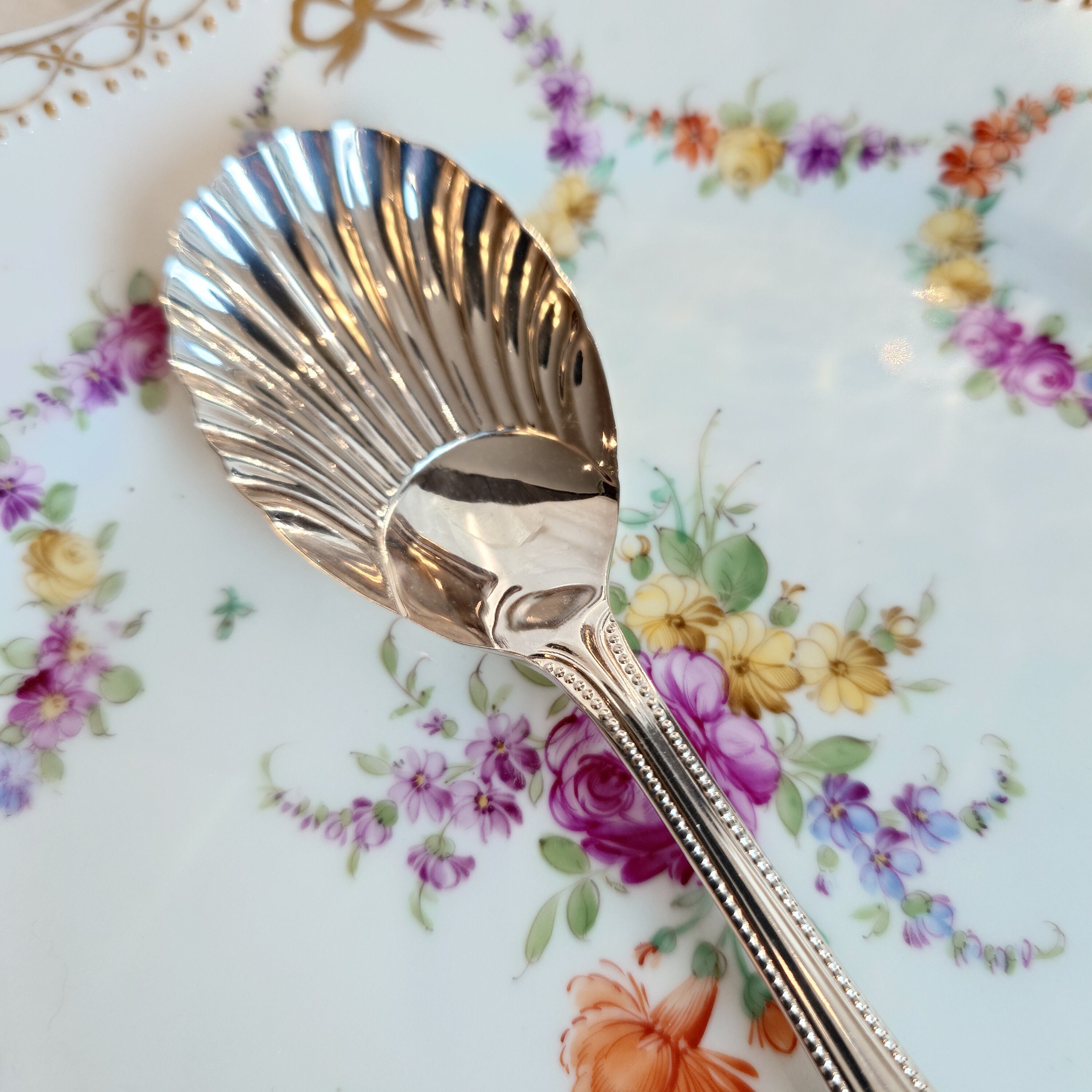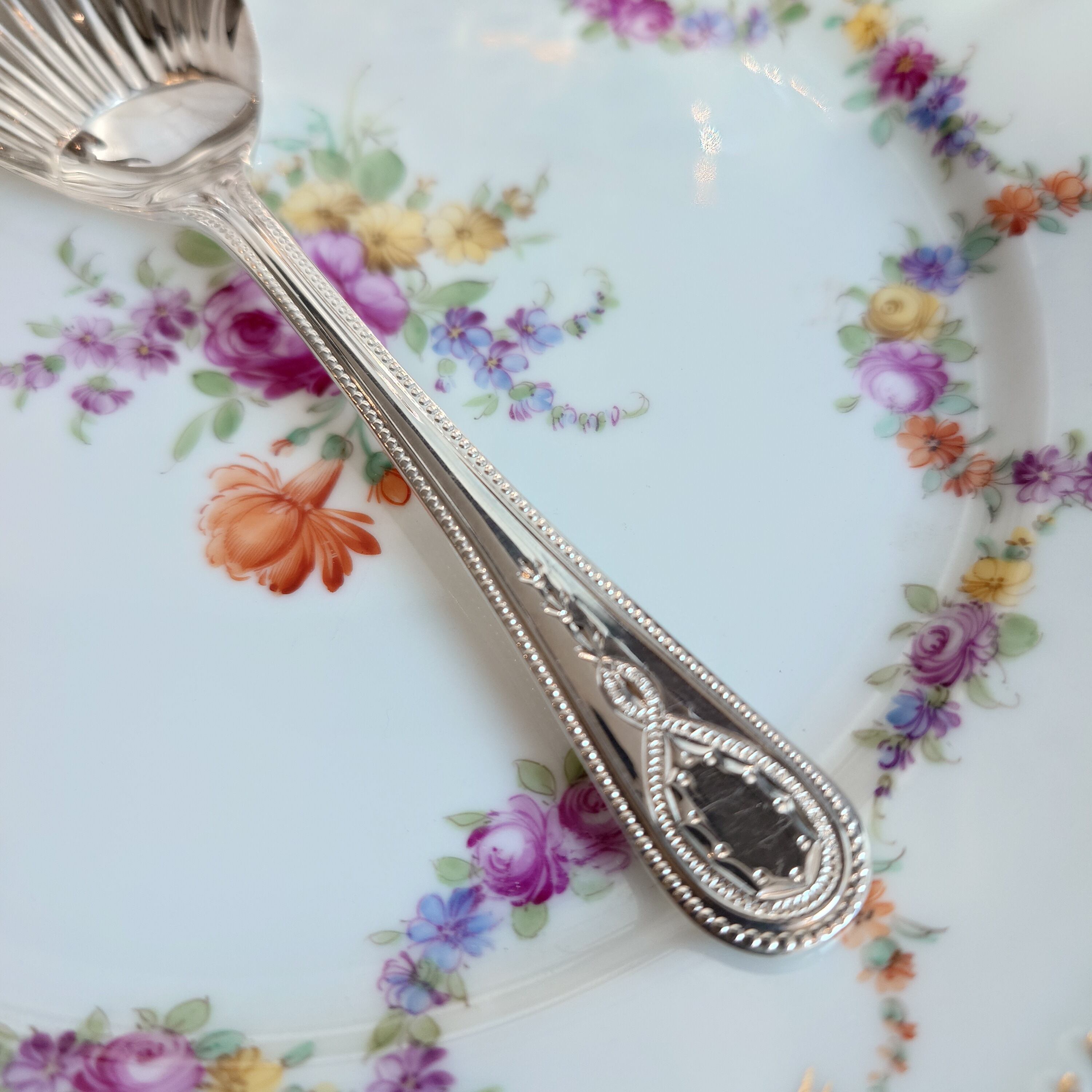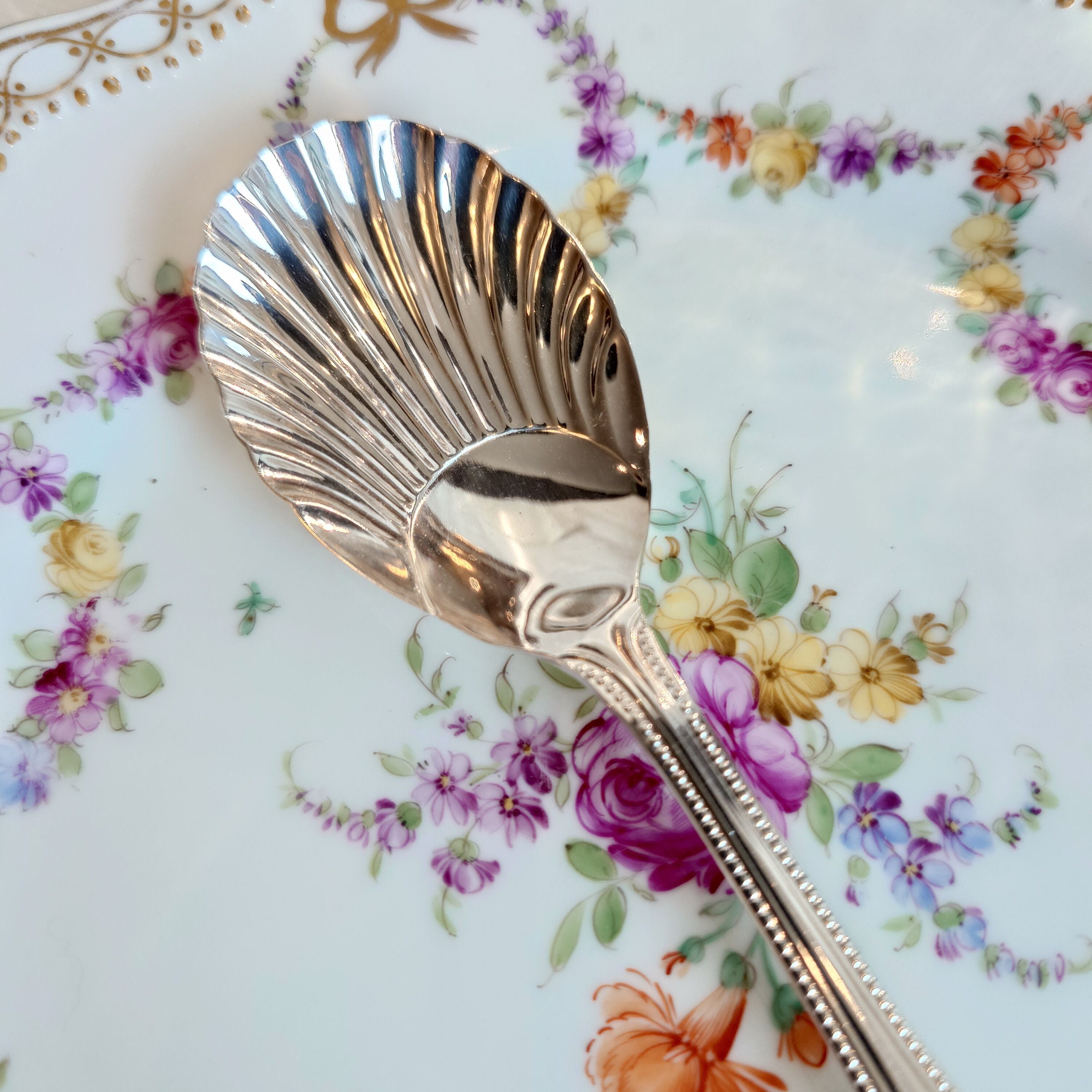 ボウル部分はシェルモチーフ、持ち手の縁はパール(ビーディング)のデザインにブライトカットでアクセントの模様が施されたクラシカルで上品なスプーンです