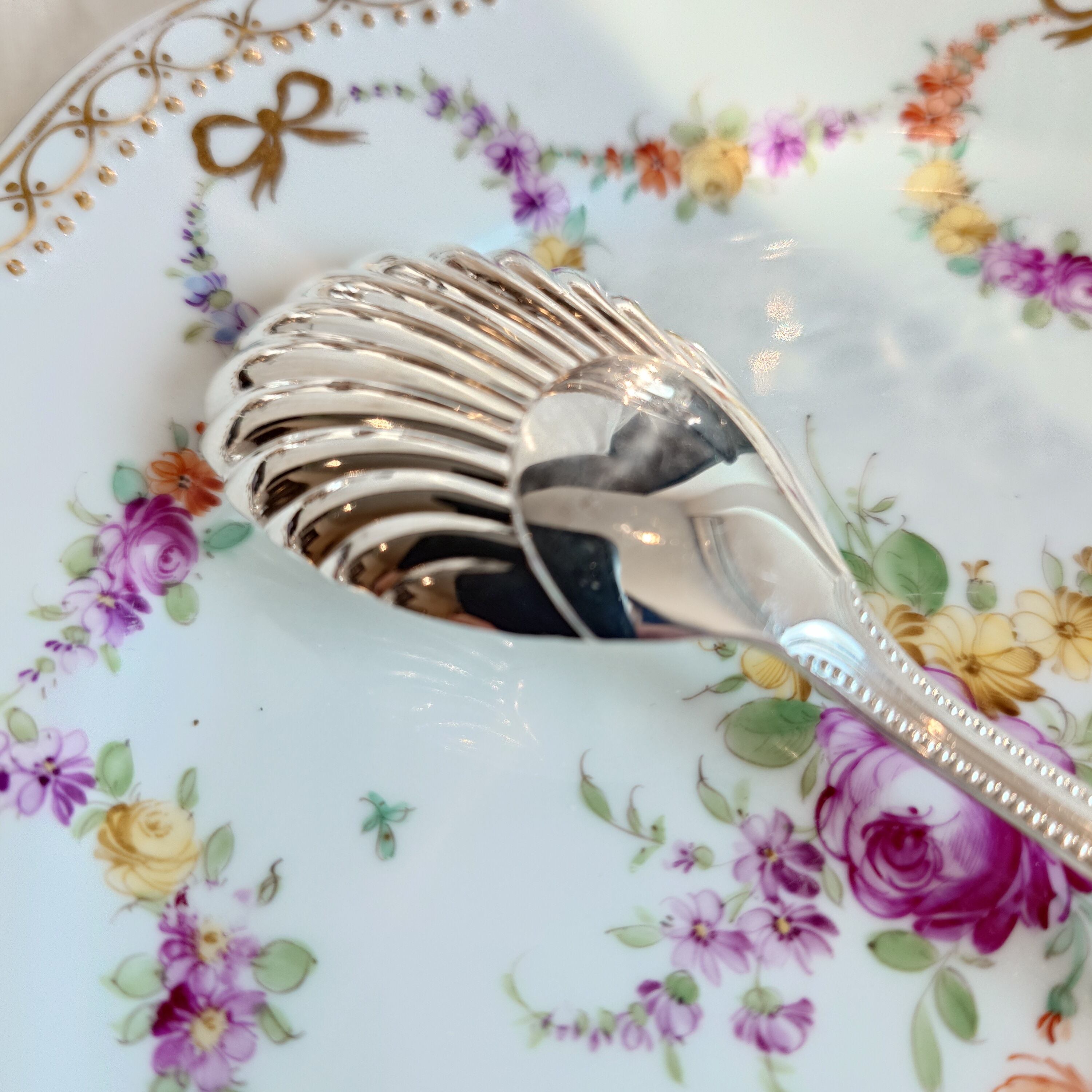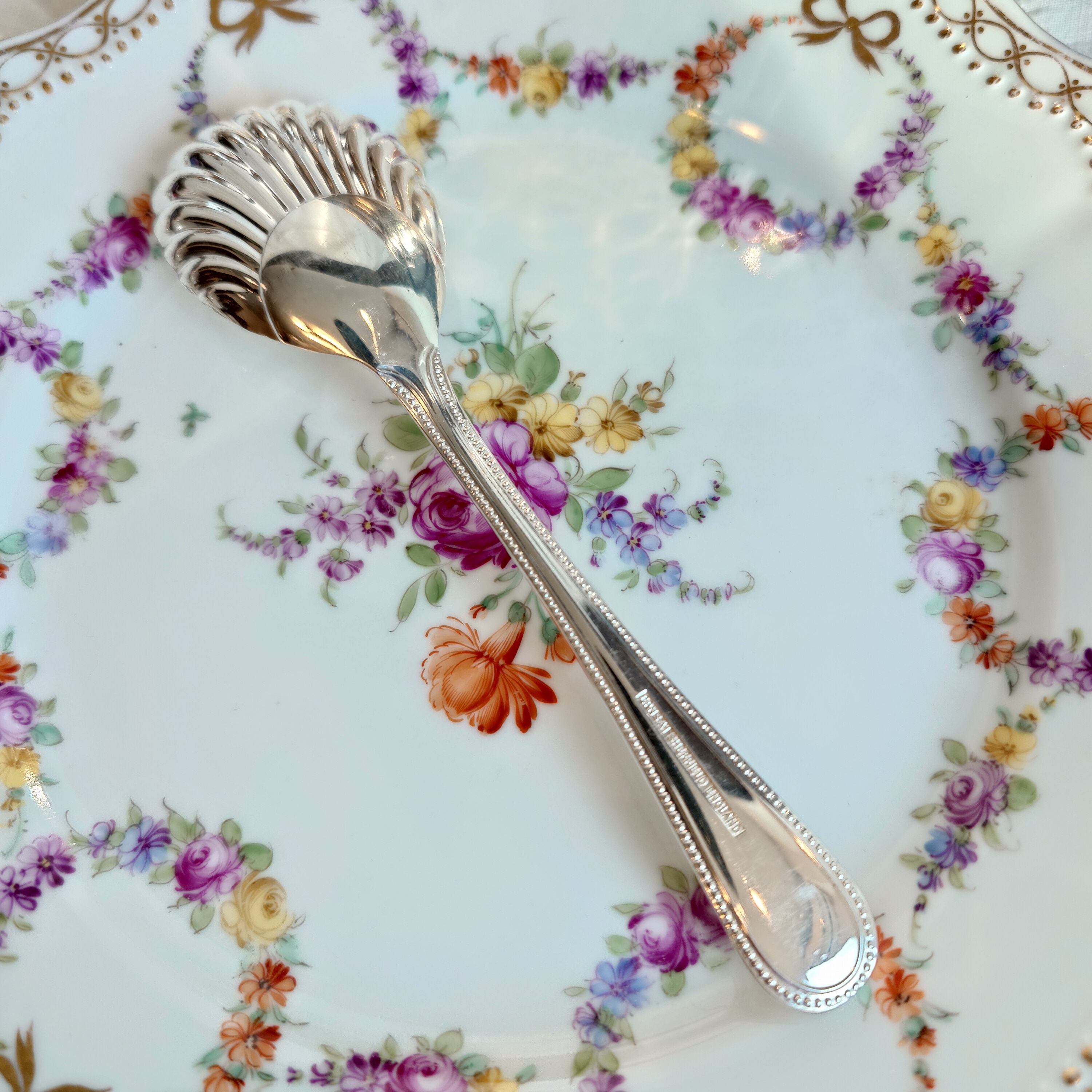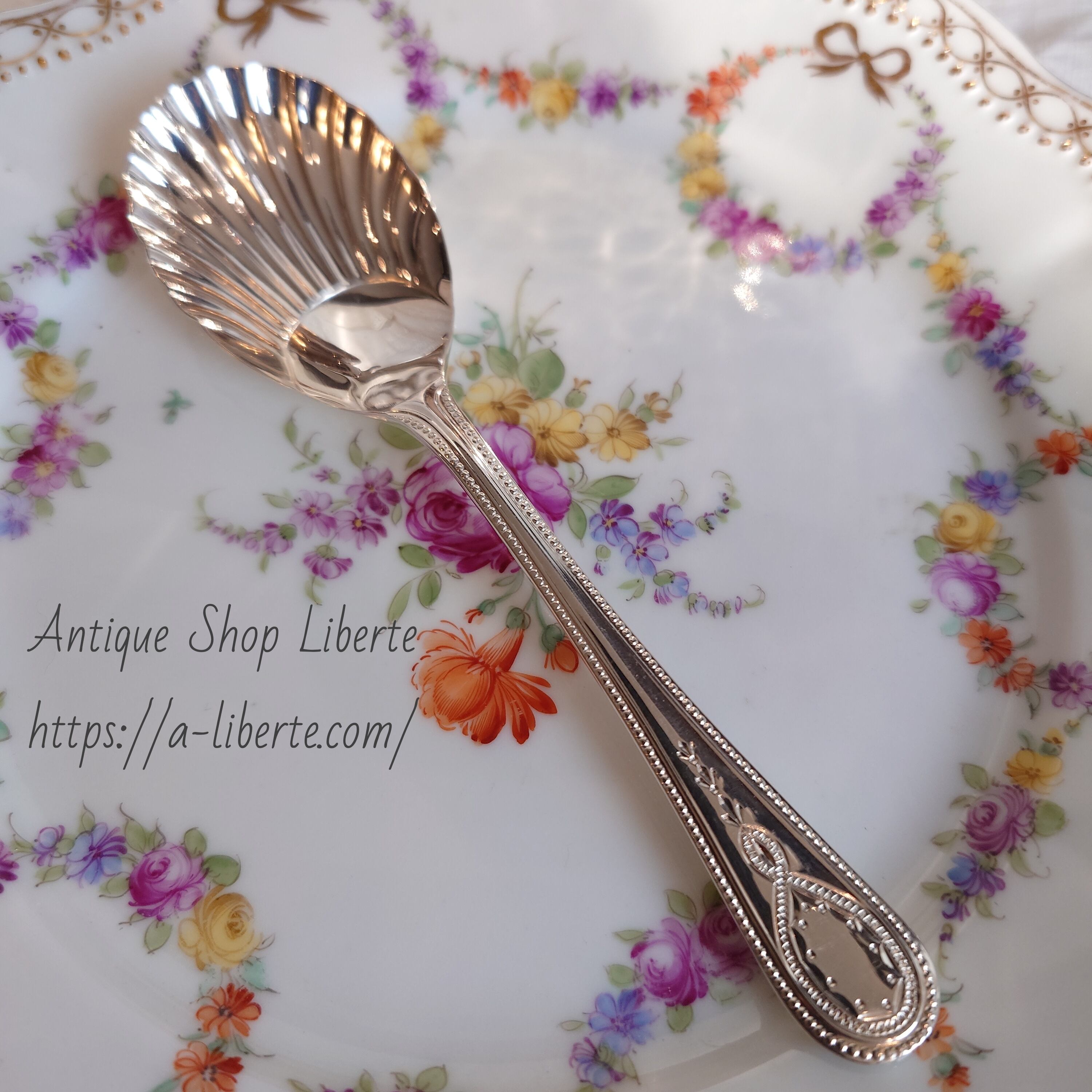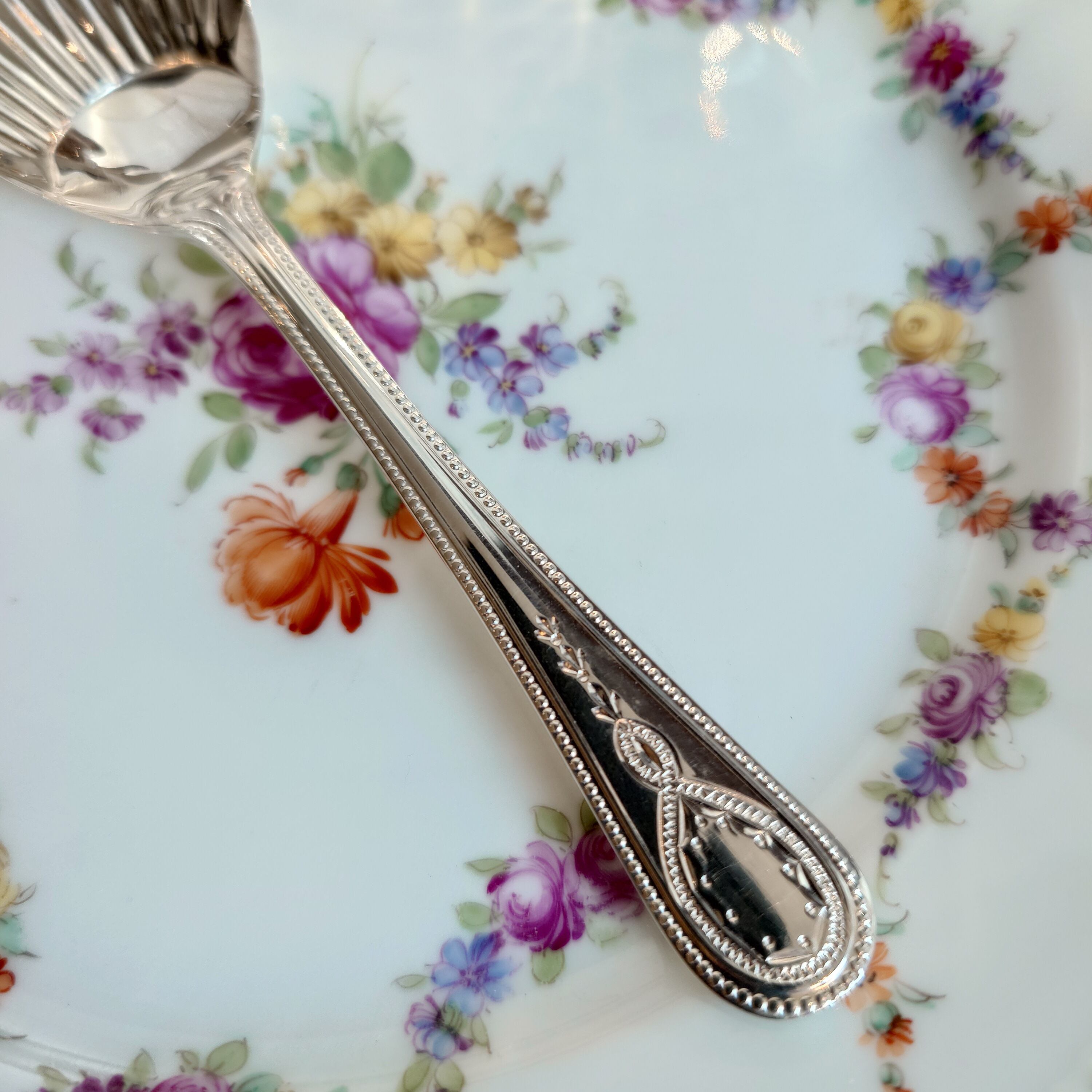 ボウル部分はシェルモチーフ、持ち手の縁はパール(ビーディング)のデザインにブライトカットでアクセントの模様が施されたクラシカルで上品なスプーンです