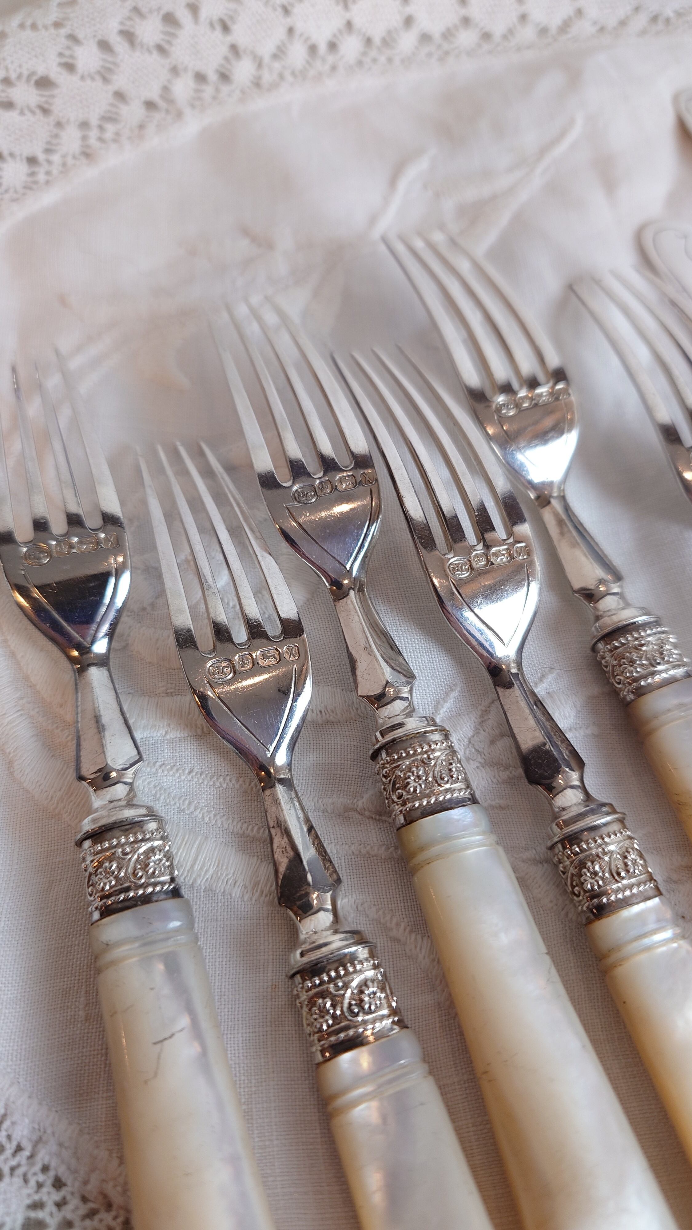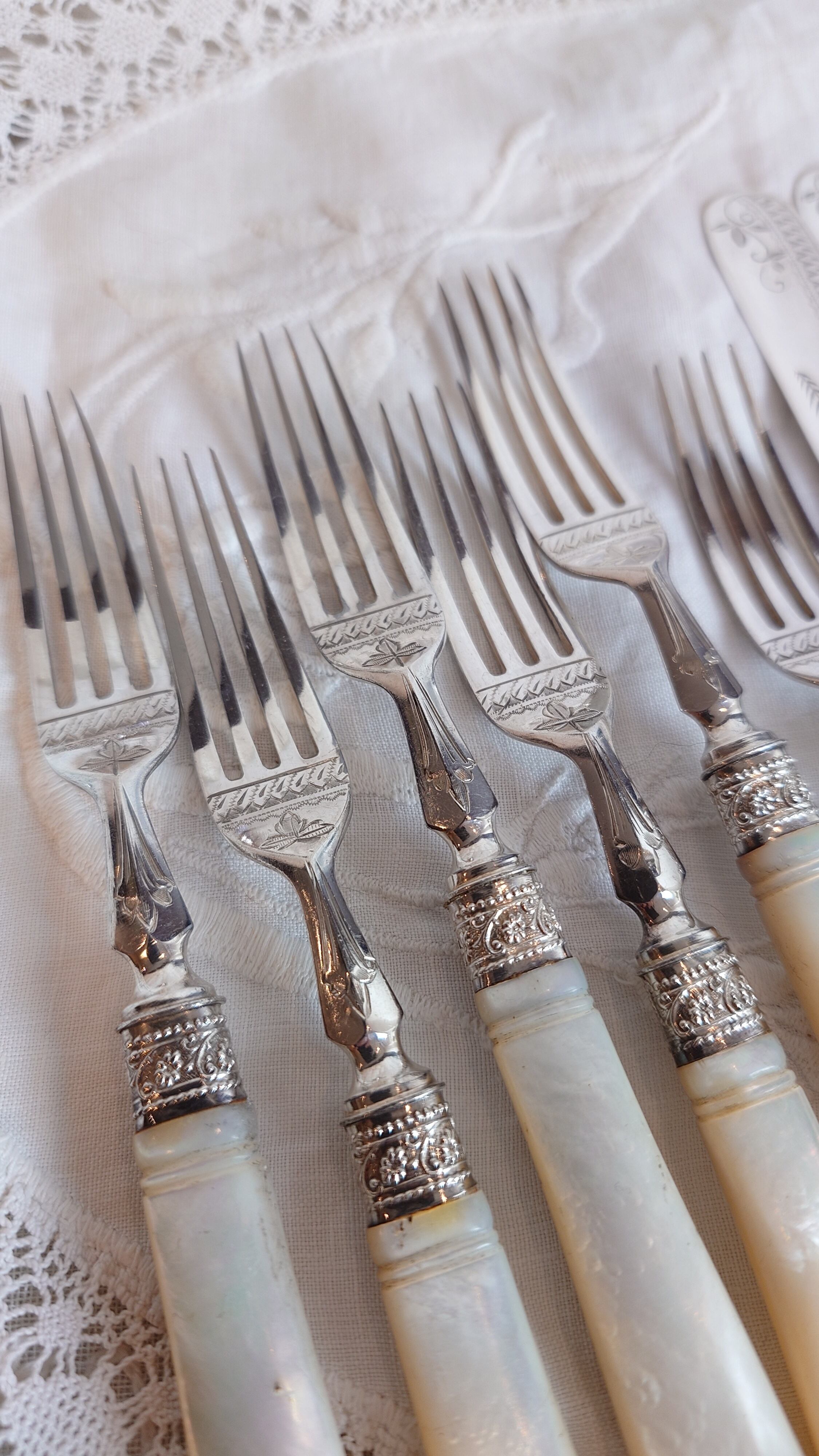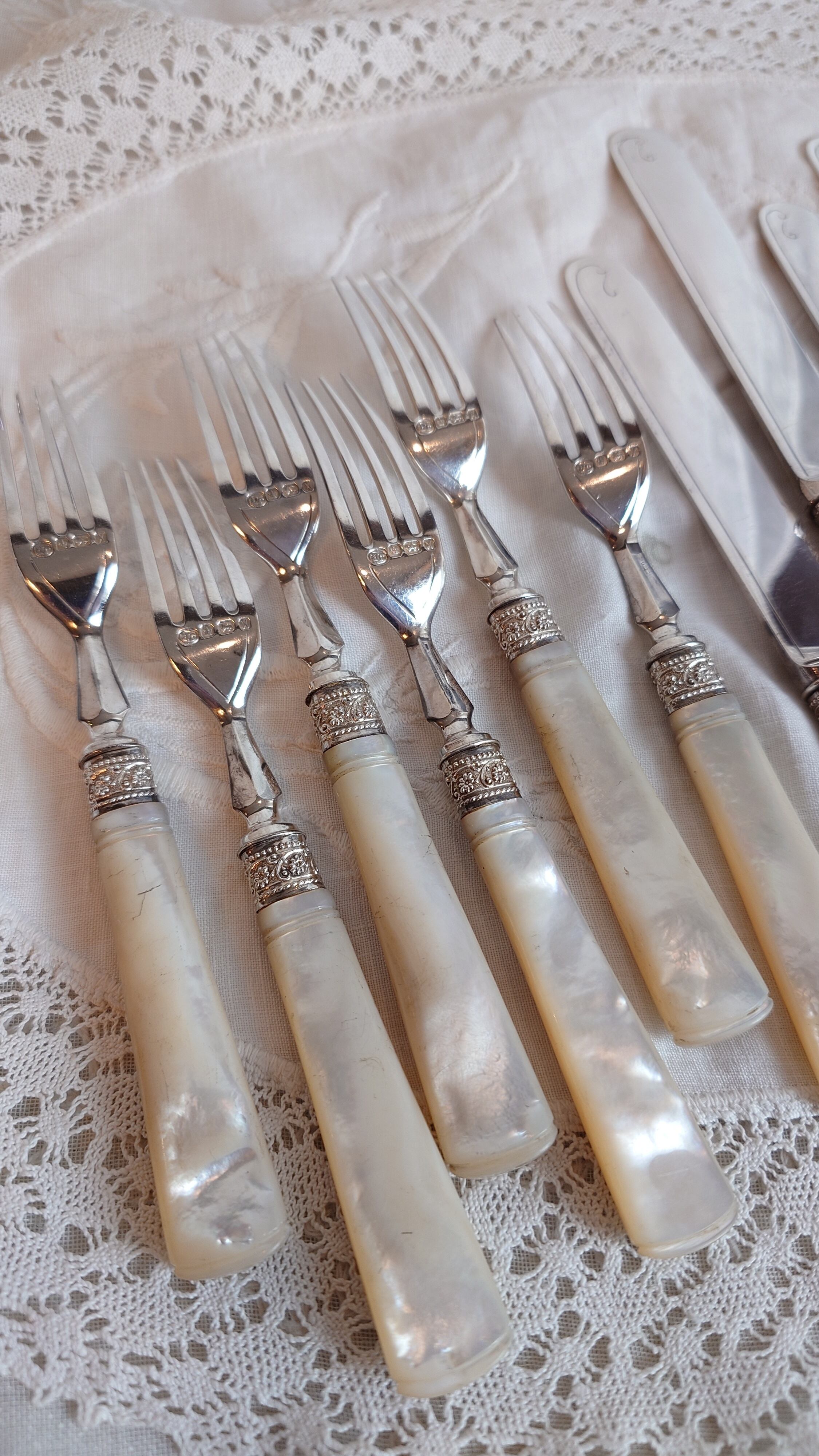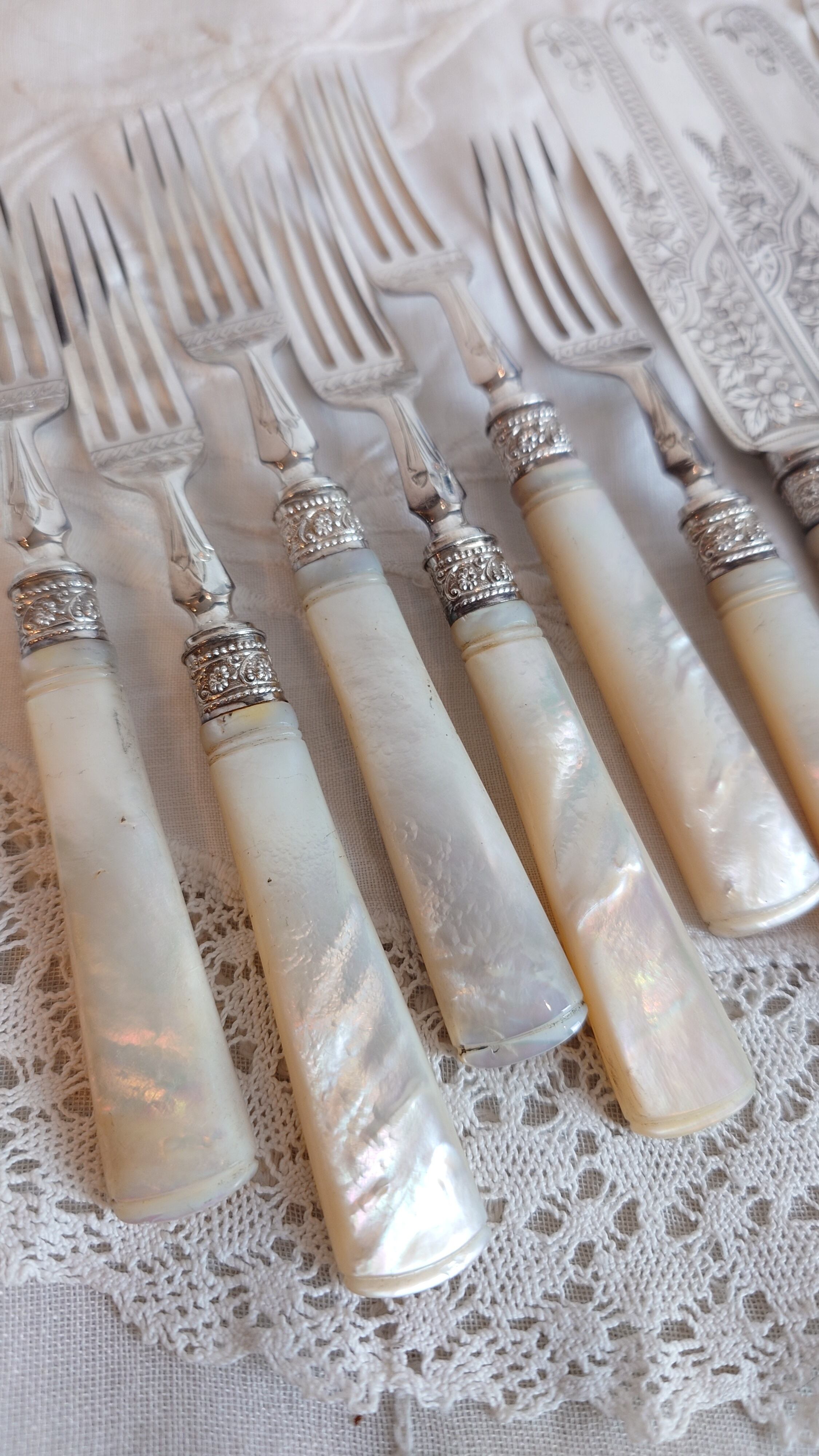 マザーオブパールのハンドルのデザートカトラリーセットです