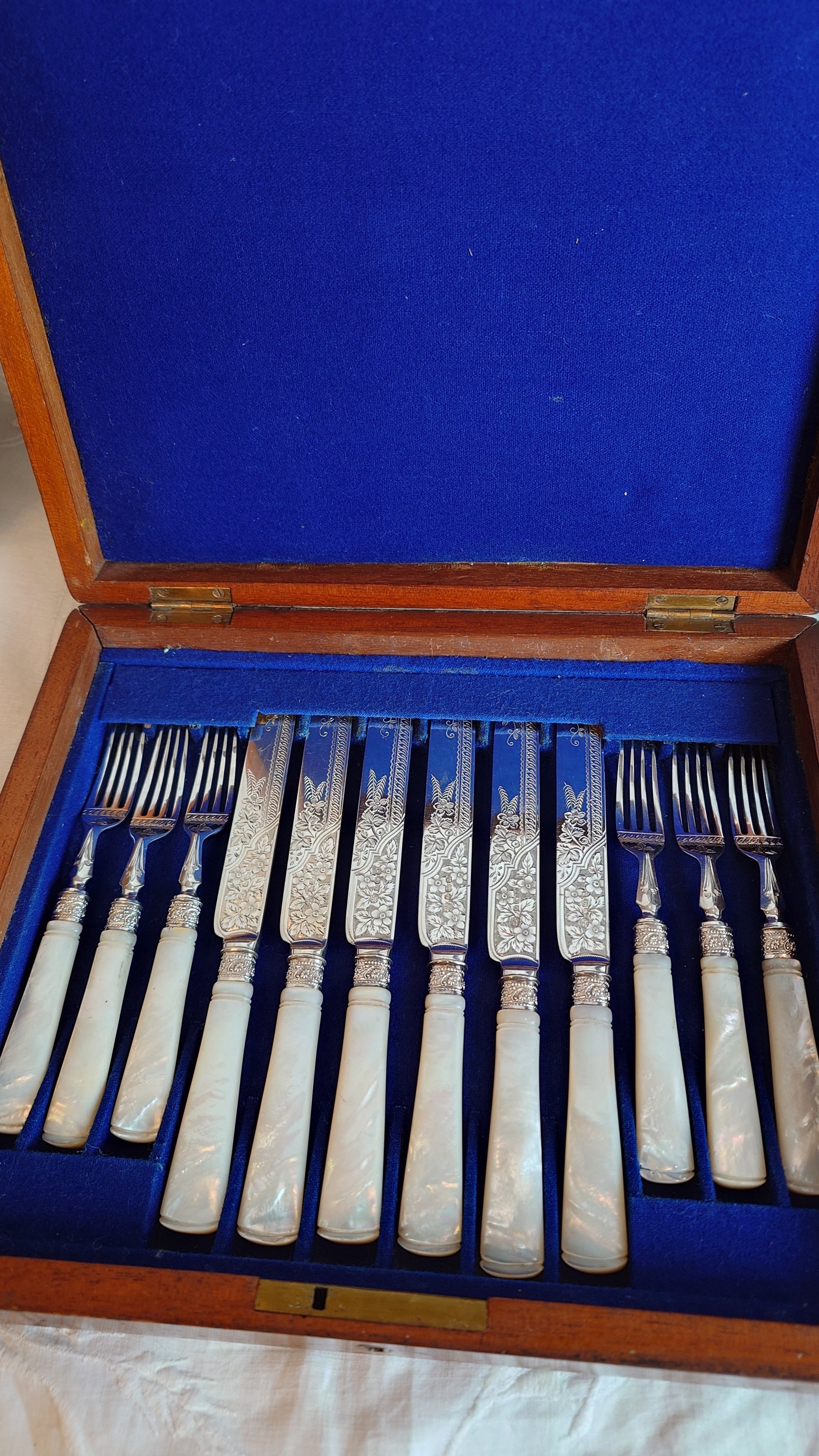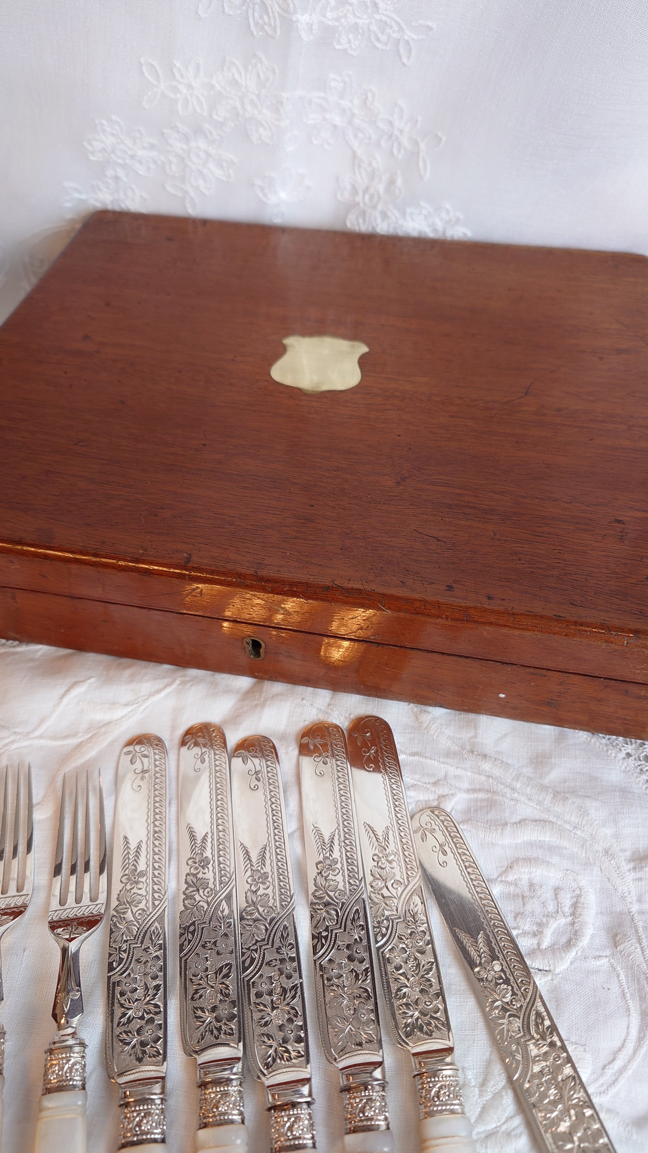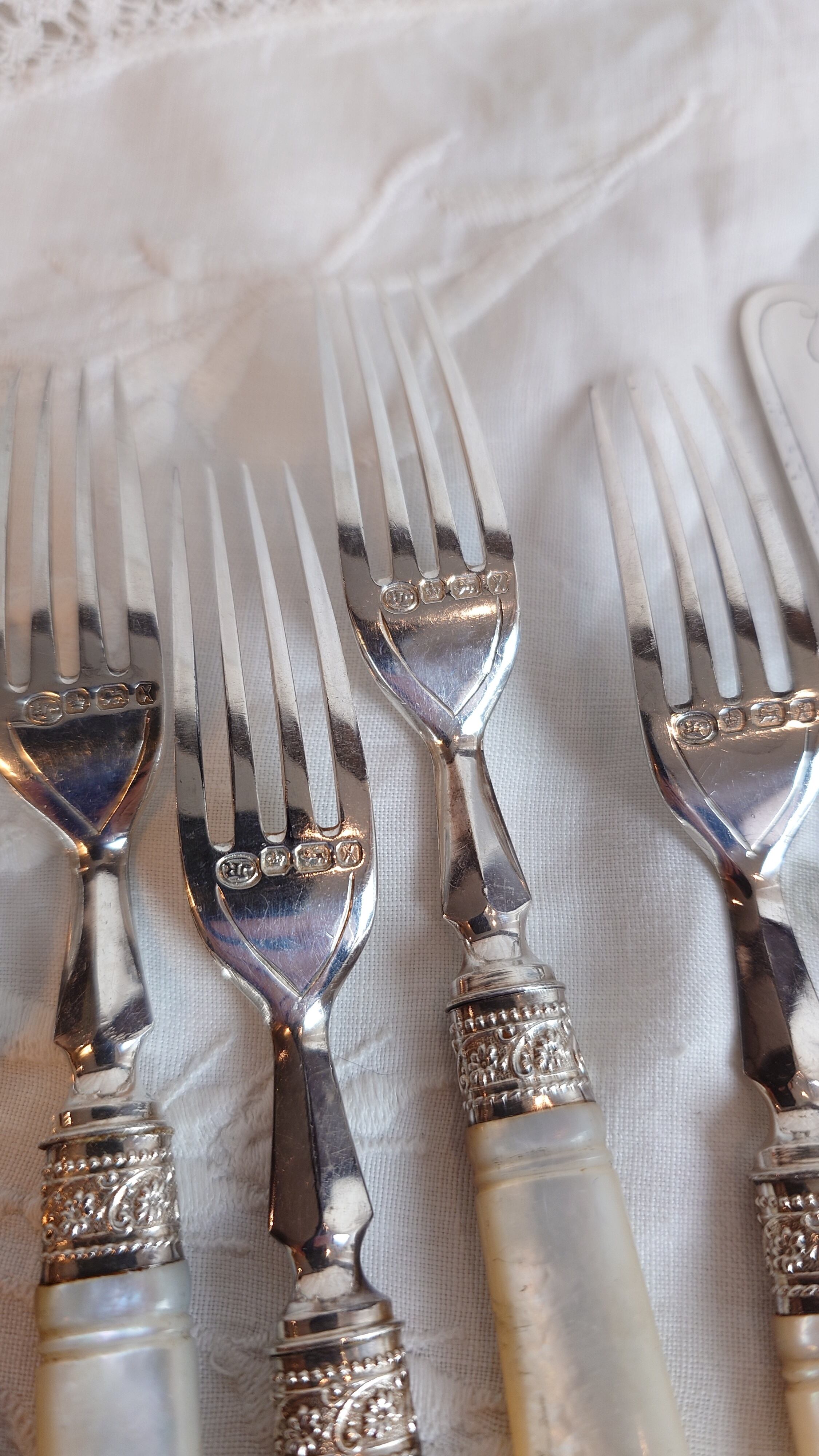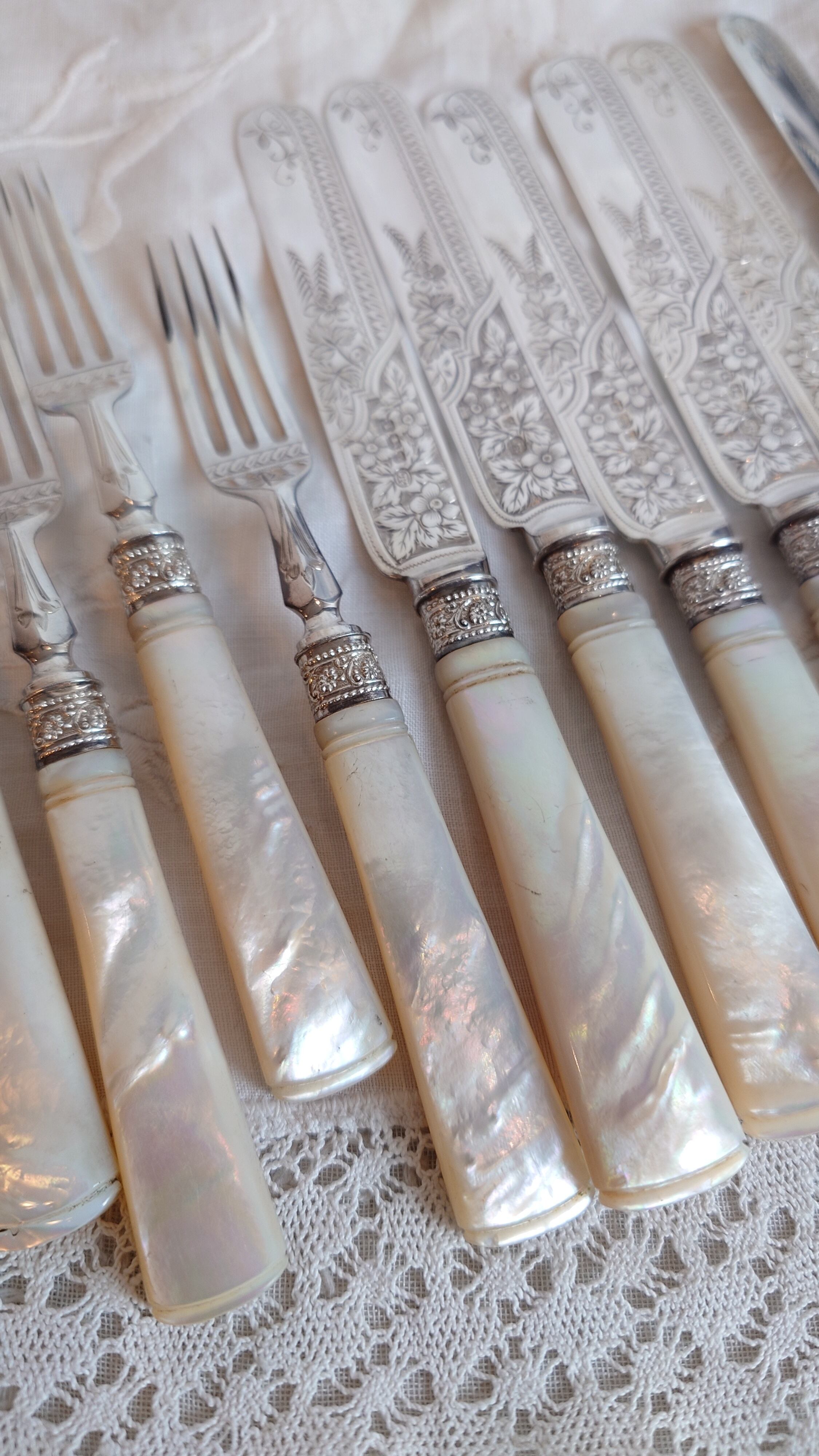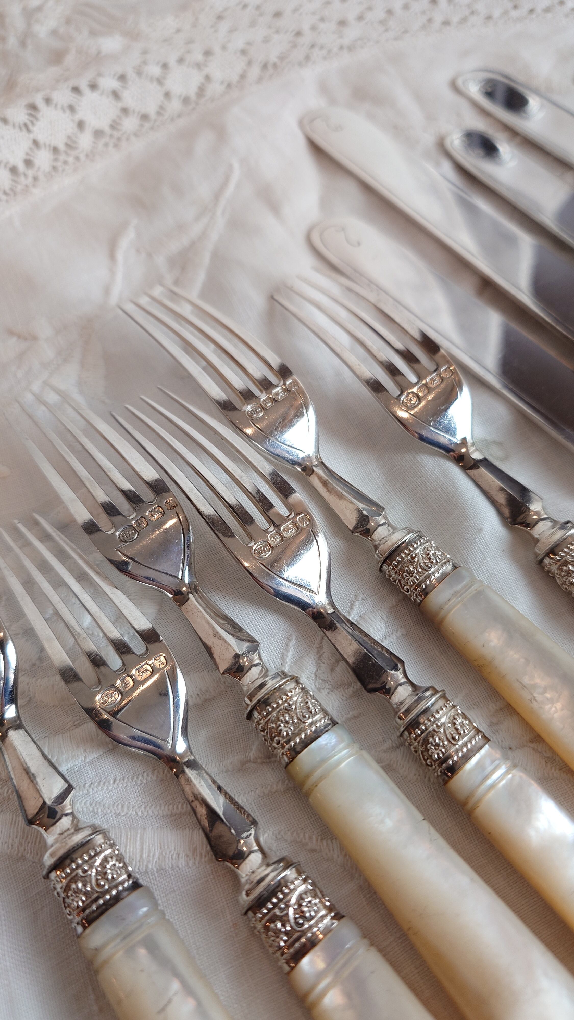 マザーオブパールのハンドルのデザートカトラリーセットです