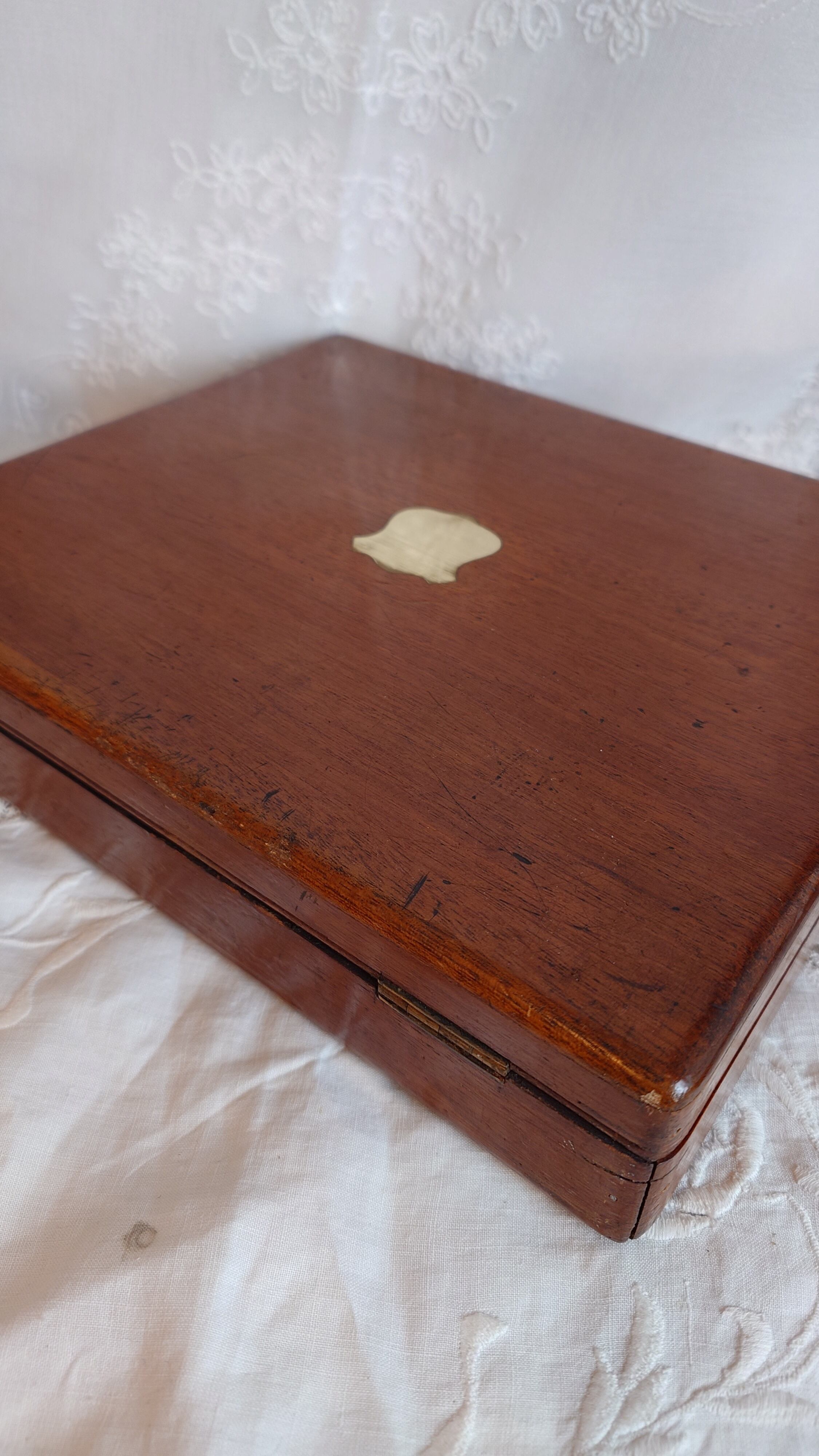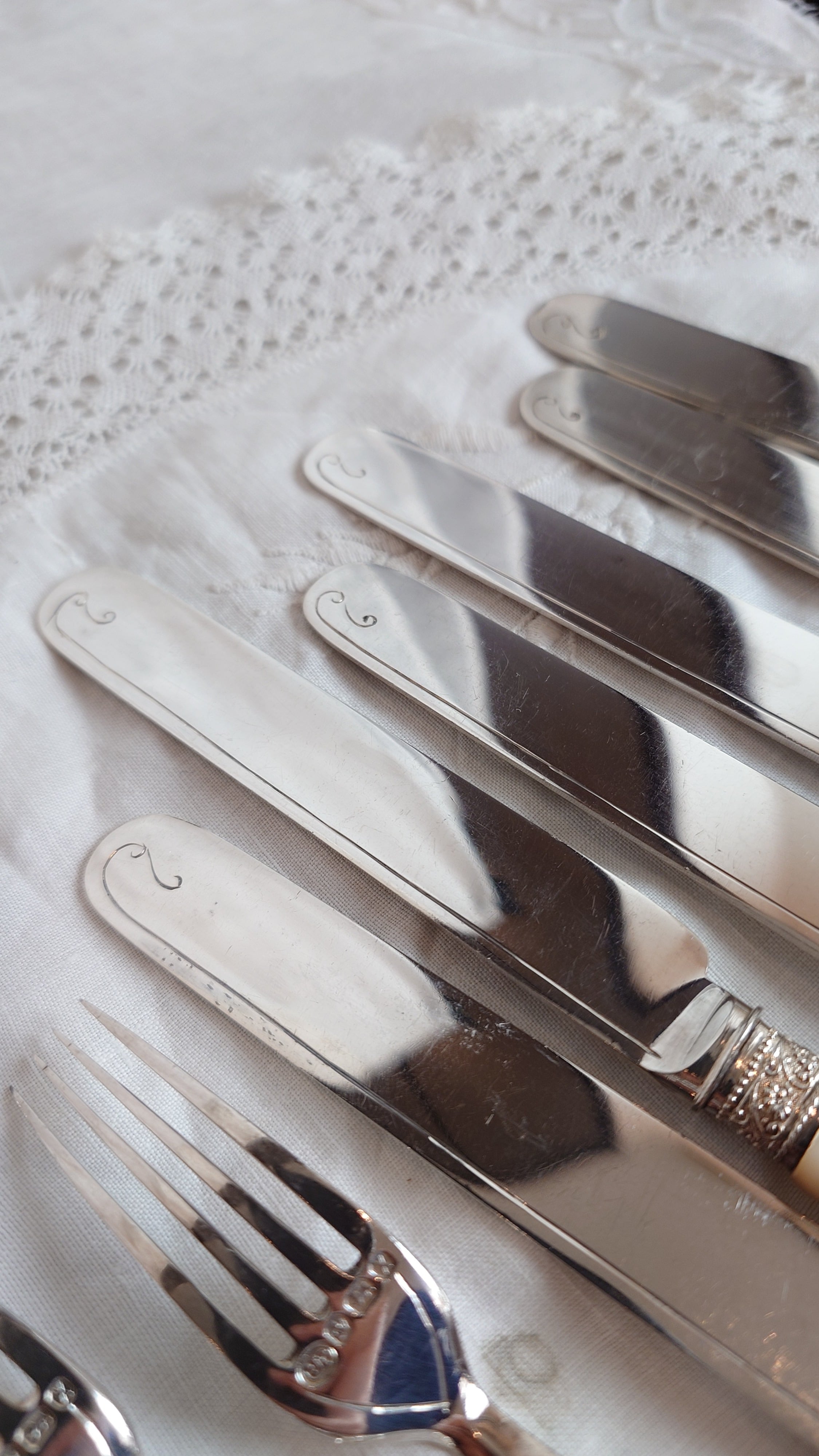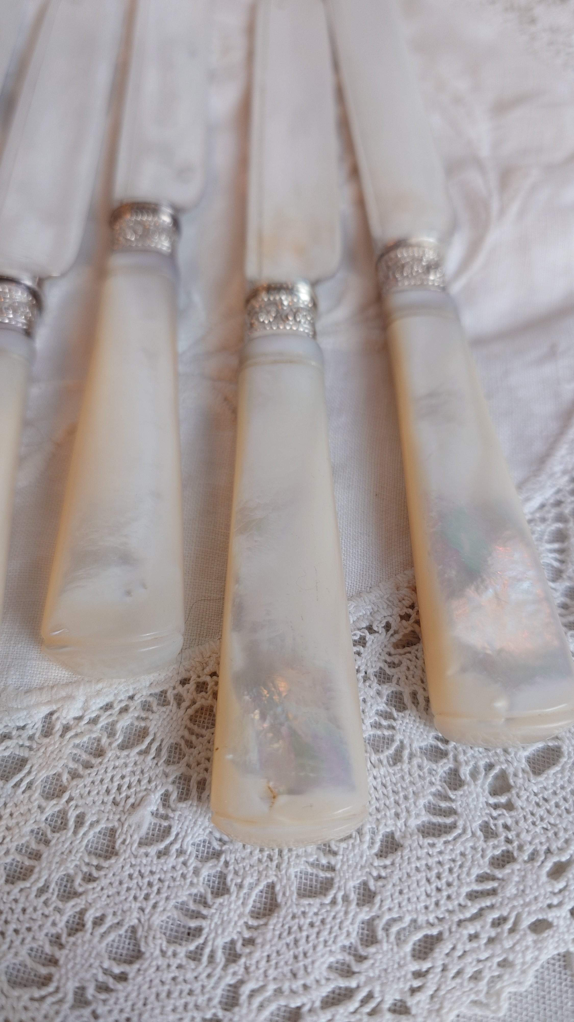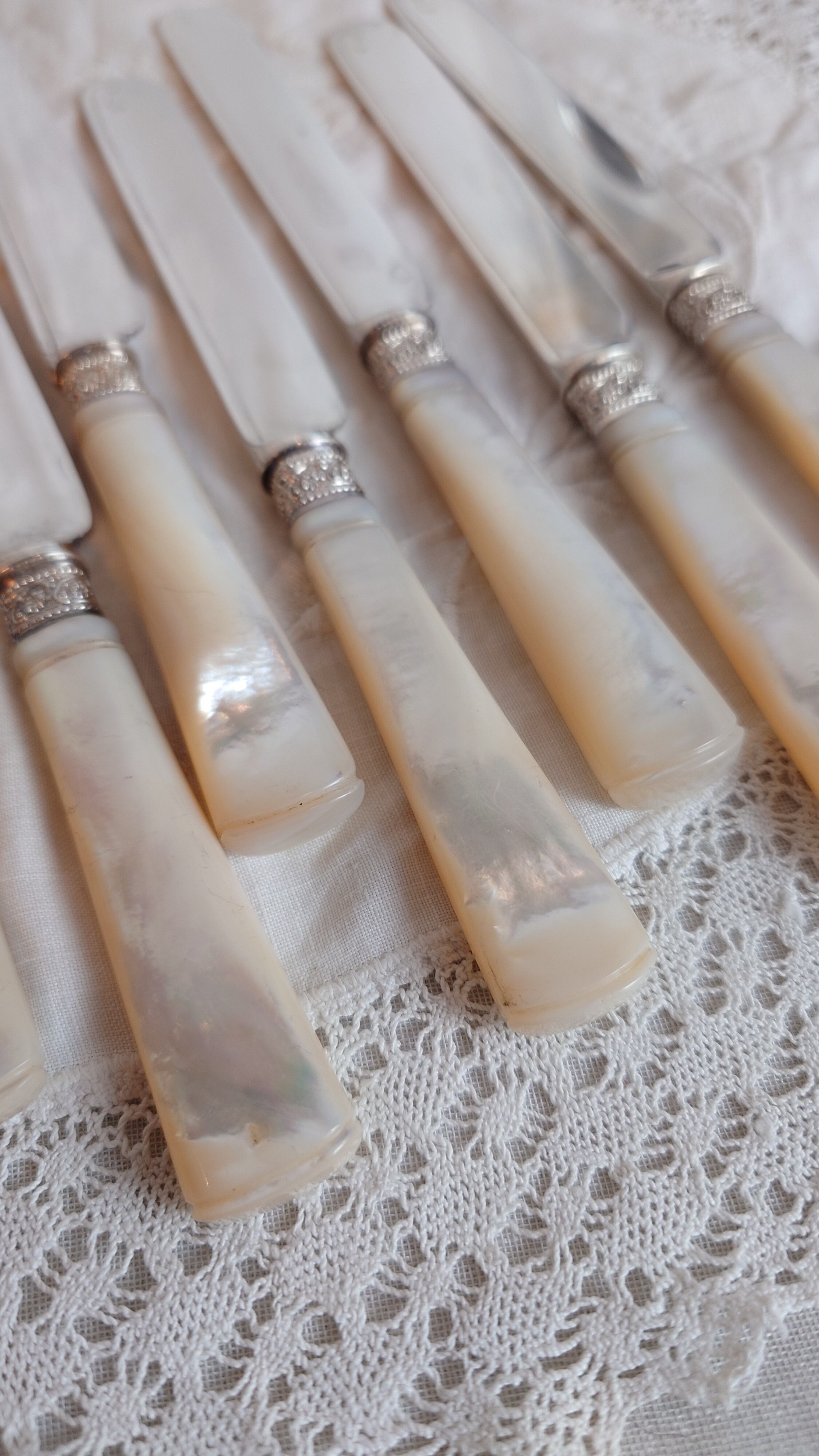 希少な白蝶貝はMOP (マザーオブパール) と略される白蝶貝の殻はボタンや工芸品の材料となり、カトラリーには、プラスチックが製品化される以前、1870-1890年頃にカトラリーのハンドル資材として用いられた物ですが、天然ゆえ劣化が起り、状態の良いお品は数少ない貴重なカトラリーです。