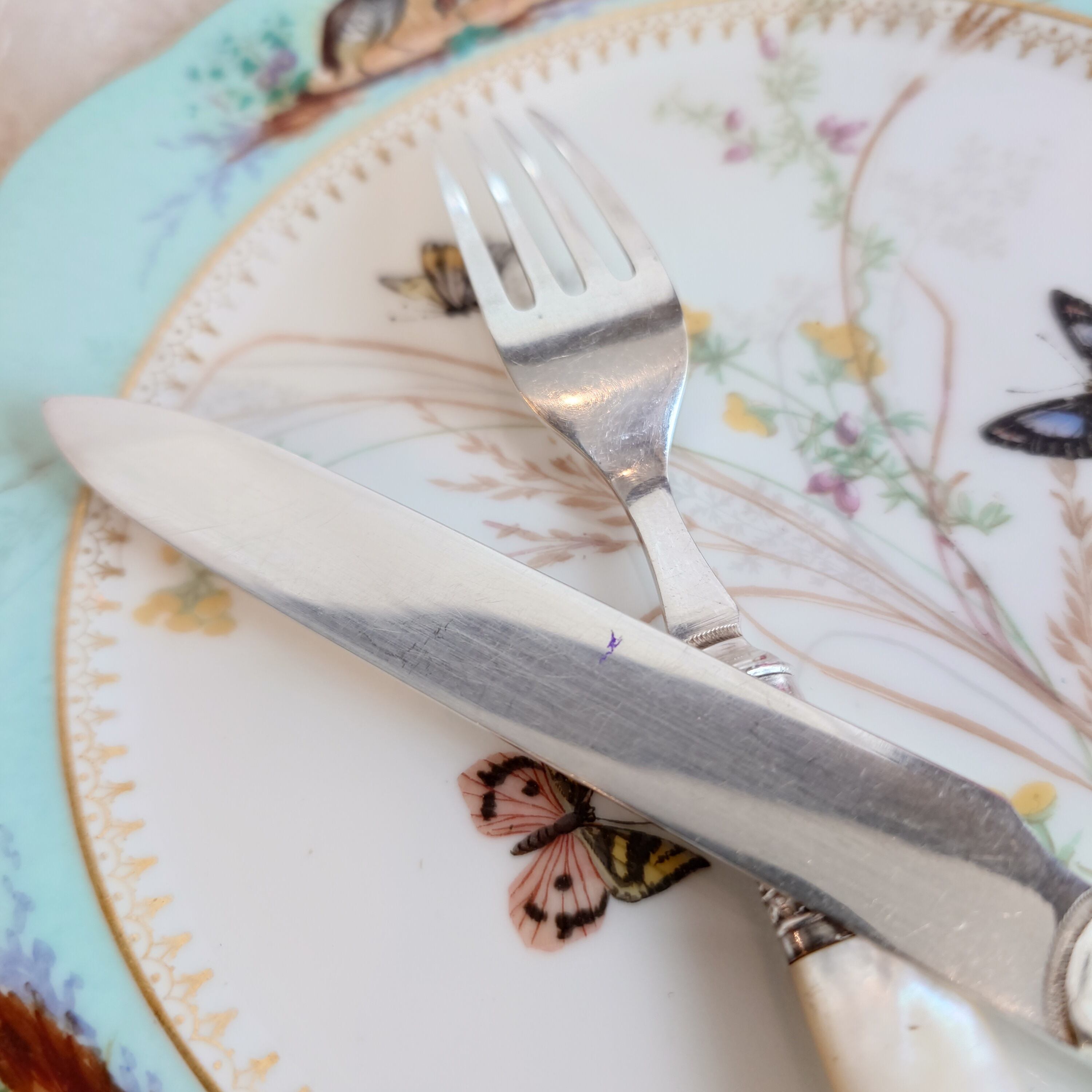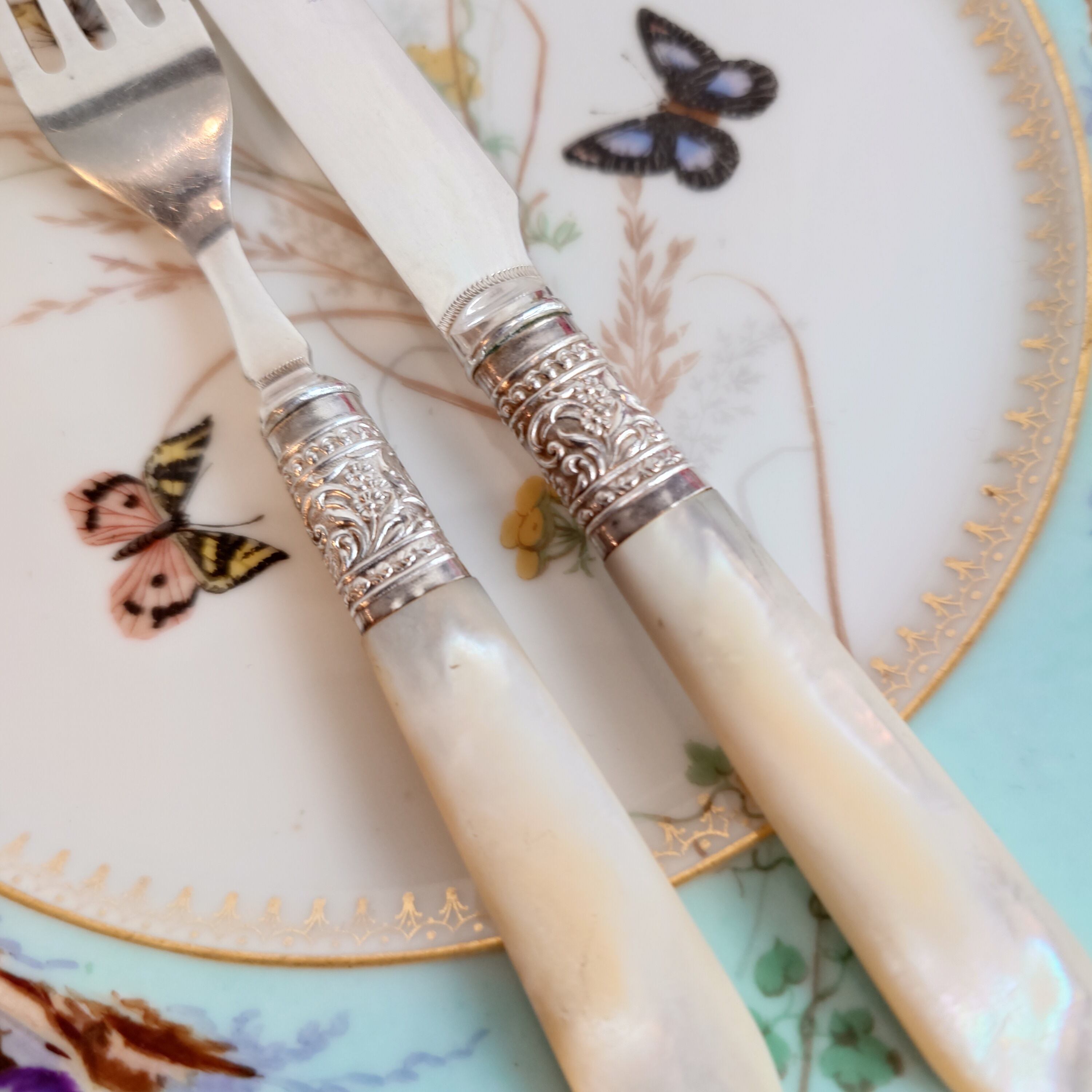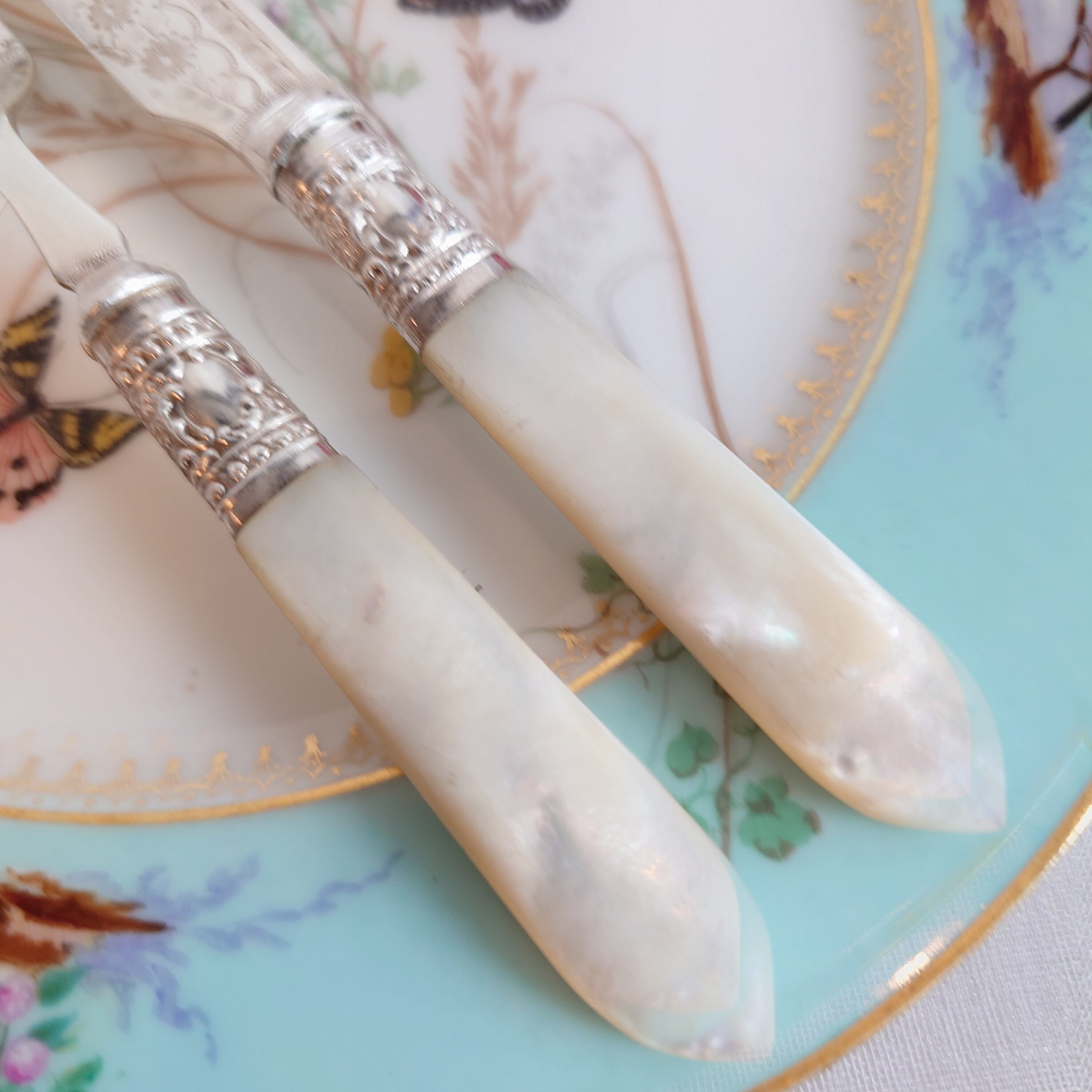 希少な白蝶貝はMOP (マザーオブパール) と略される白蝶貝の殻はボタンや工芸品の材料となり、カトラリーには、プラスチックが製品化される以前、1870-1890年頃にカトラリーのハンドル資材として用いられた物ですが、天然ゆえ劣化が起り、状態の良いお品は数少ない貴重なカトラリーです。