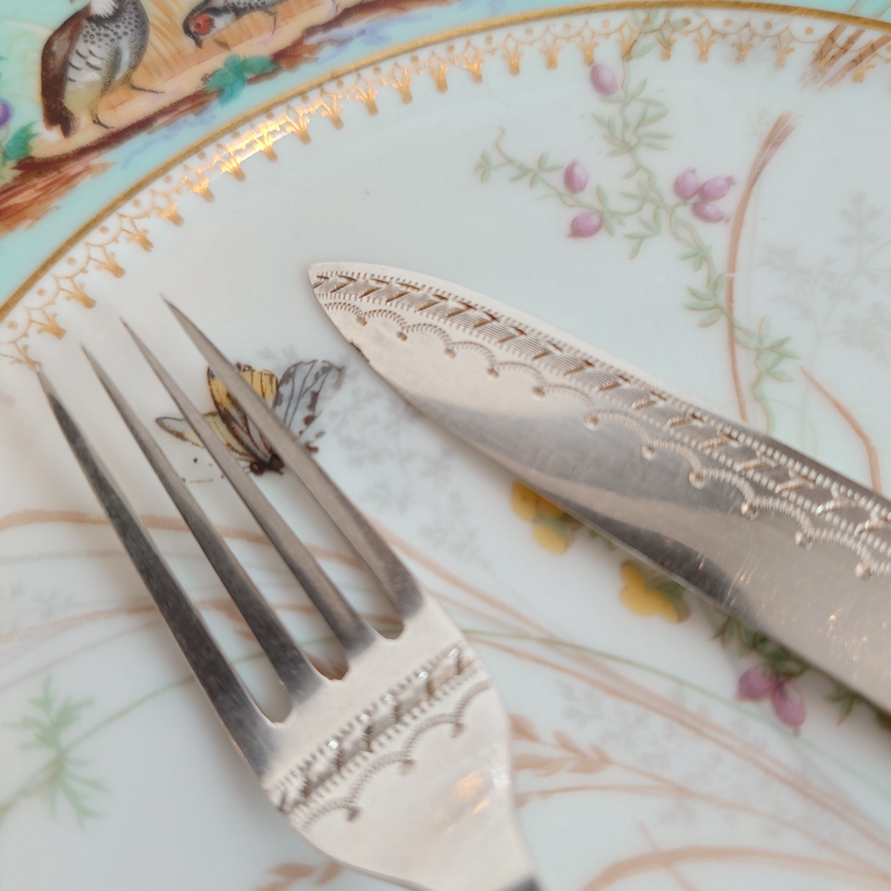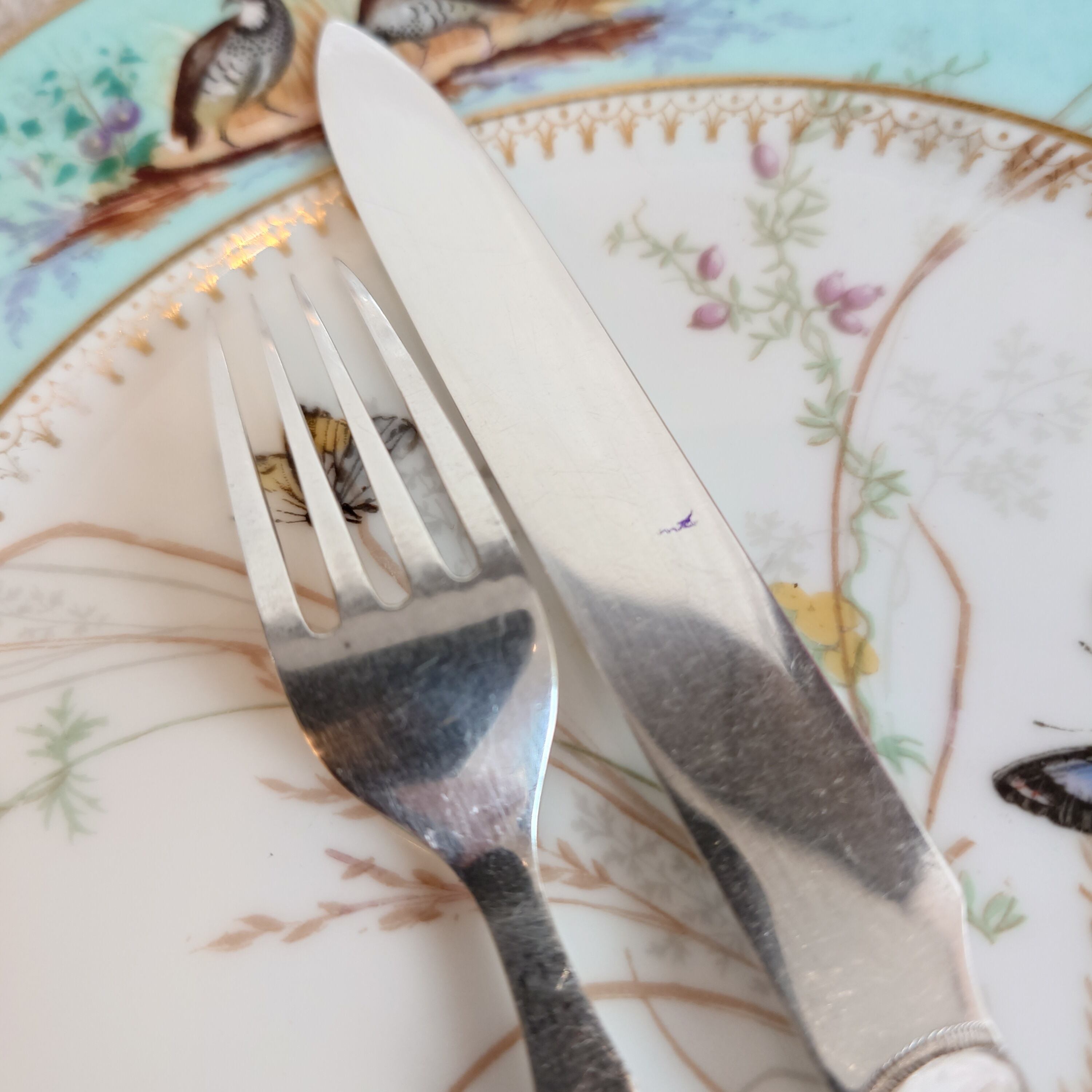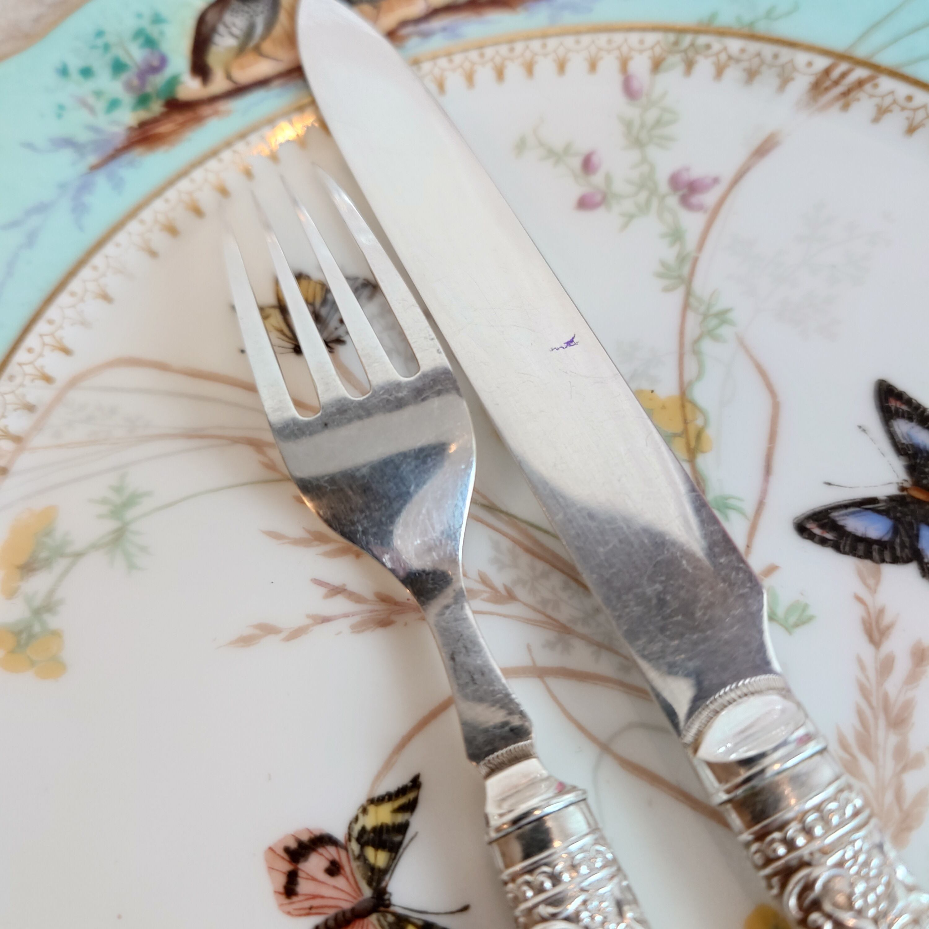 希少な白蝶貝はMOP (マザーオブパール) と略される白蝶貝の殻はボタンや工芸品の材料となり、カトラリーには、プラスチックが製品化される以前、1870-1890年頃にカトラリーのハンドル資材として用いられた物ですが、天然ゆえ劣化が起り、状態の良いお品は数少ない貴重なカトラリーです。