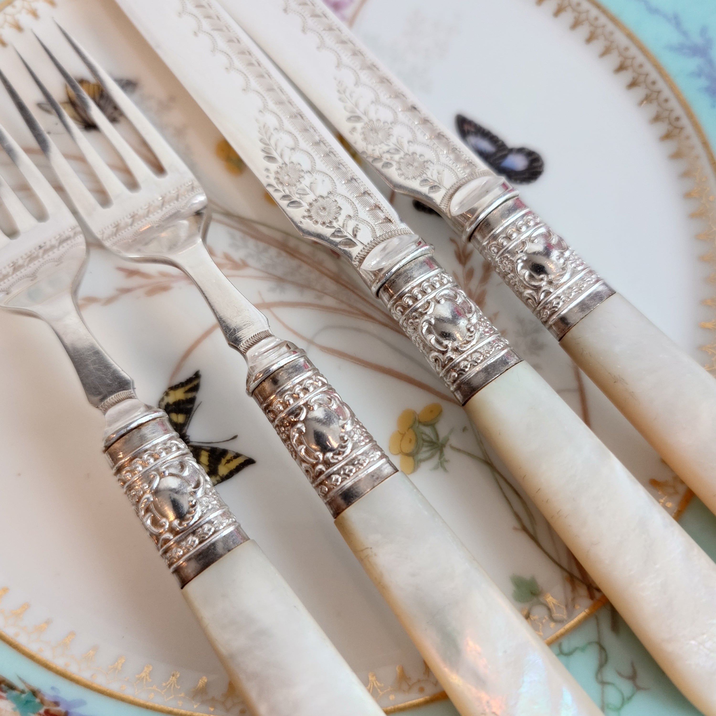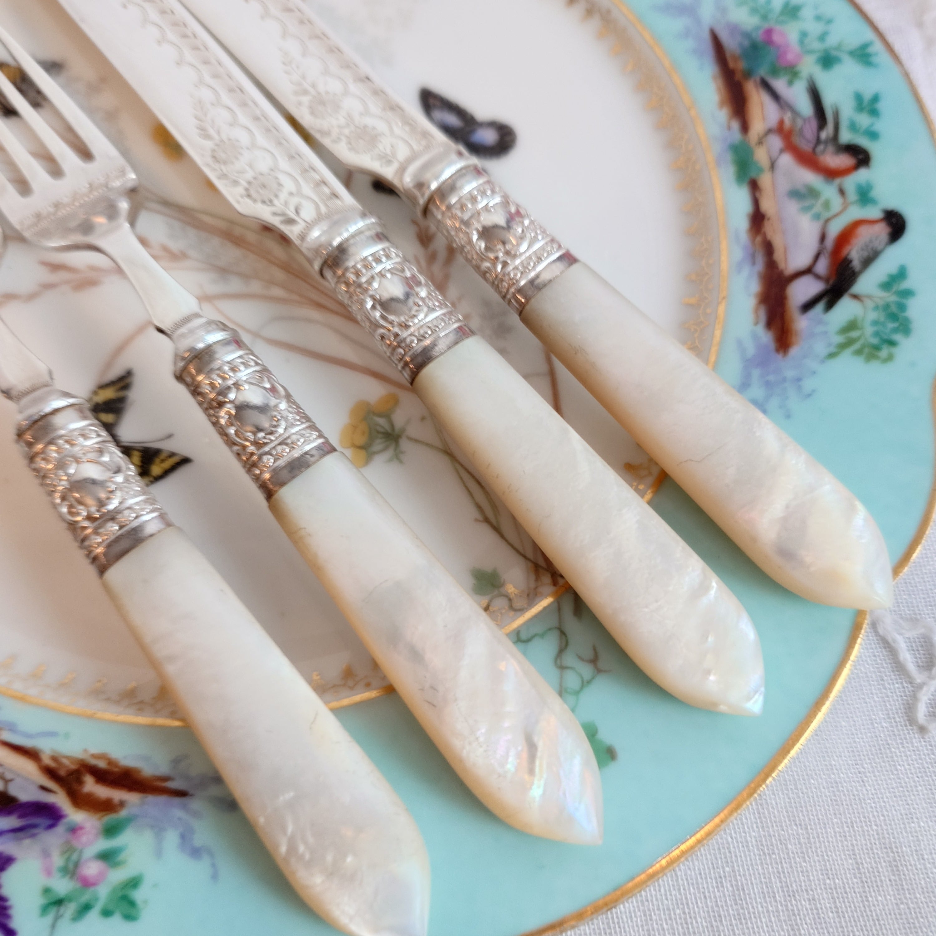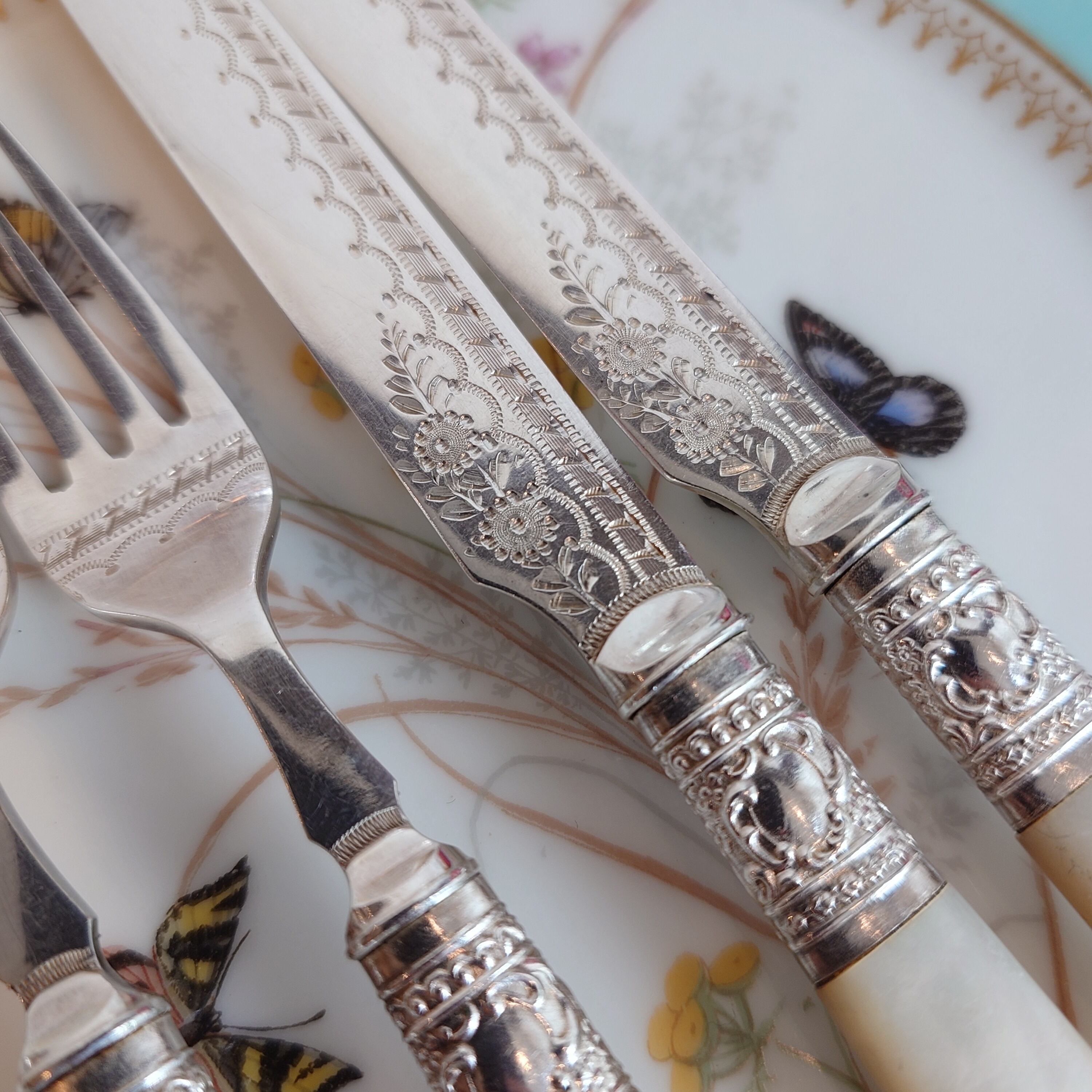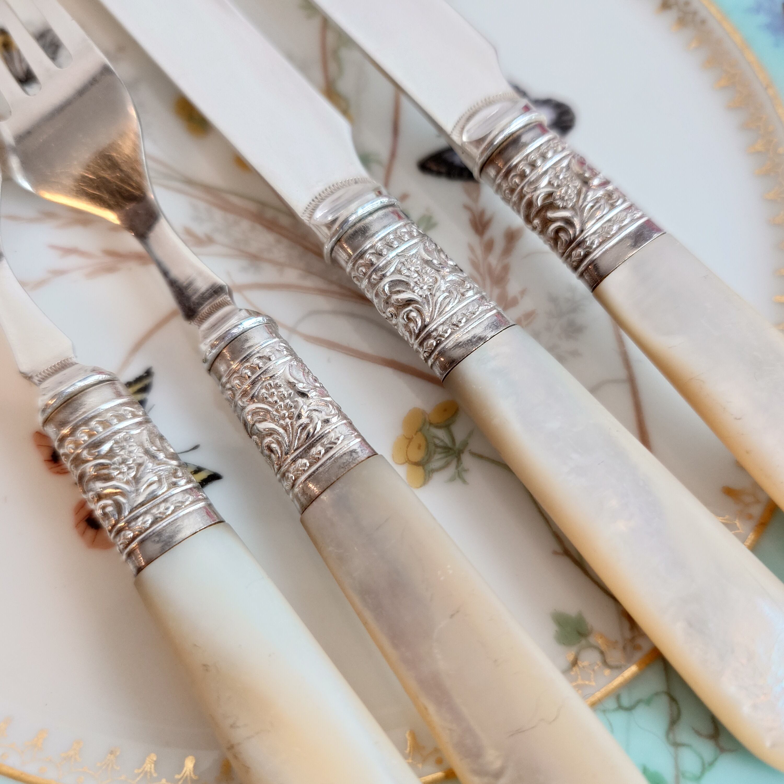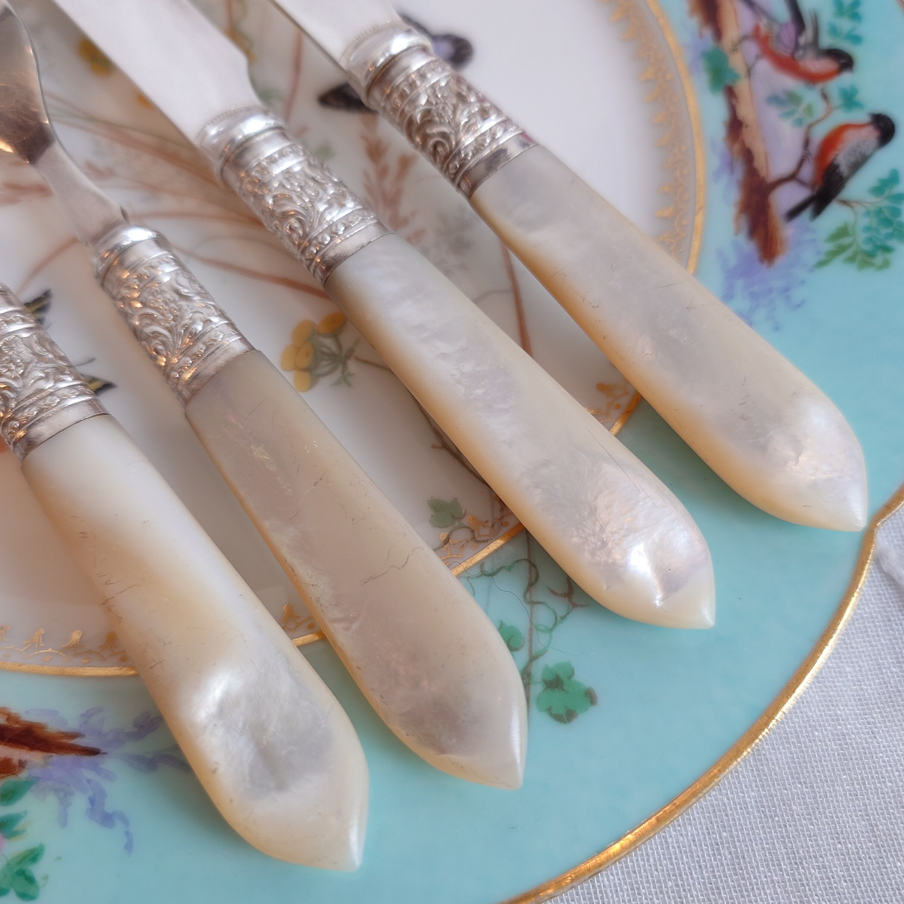 希少な白蝶貝はMOP (マザーオブパール) と略される白蝶貝の殻はボタンや工芸品の材料となり、カトラリーには、プラスチックが製品化される以前、1870-1890年頃にカトラリーのハンドル資材として用いられた物ですが、天然ゆえ劣化が起り、状態の良いお品は数少ない貴重なカトラリーです。