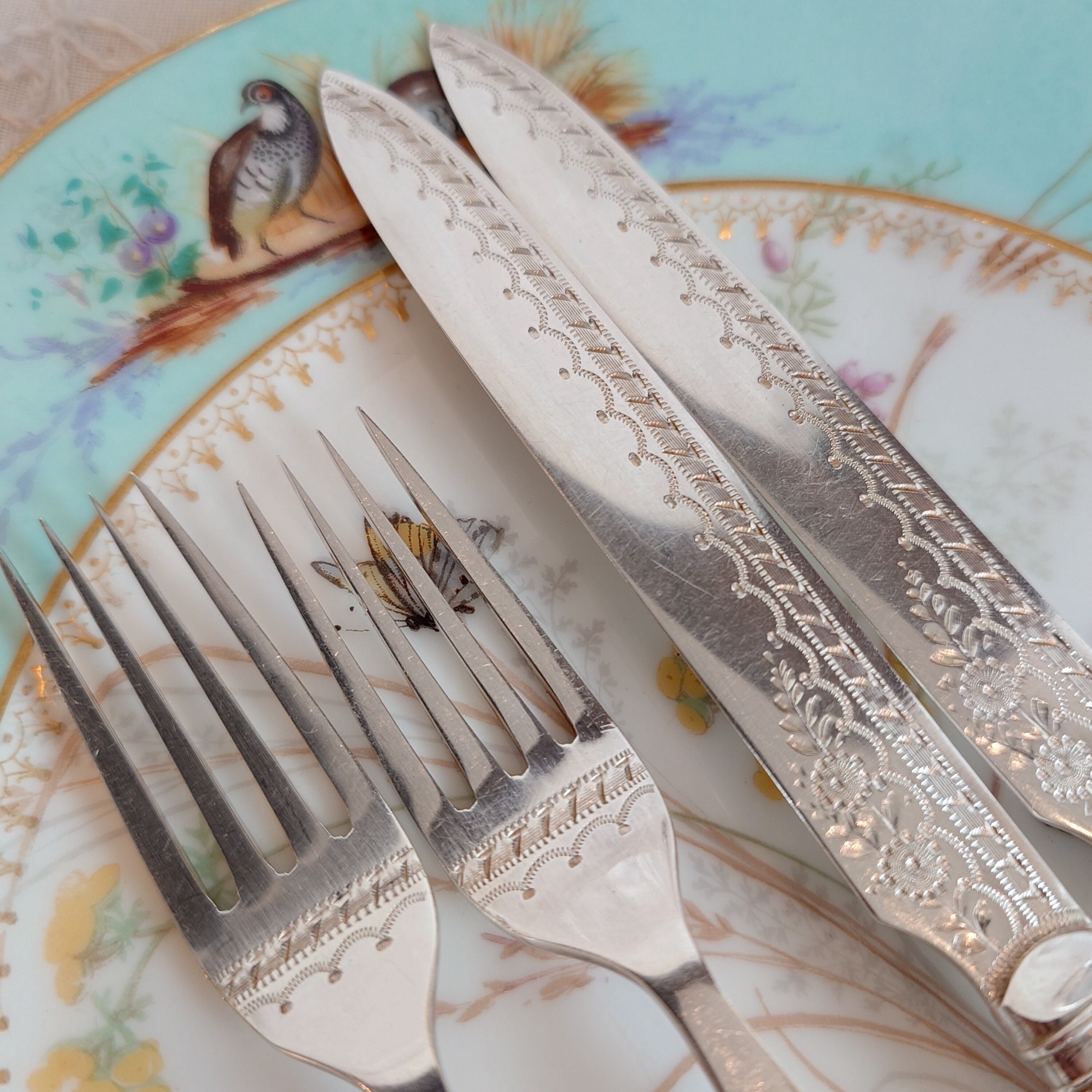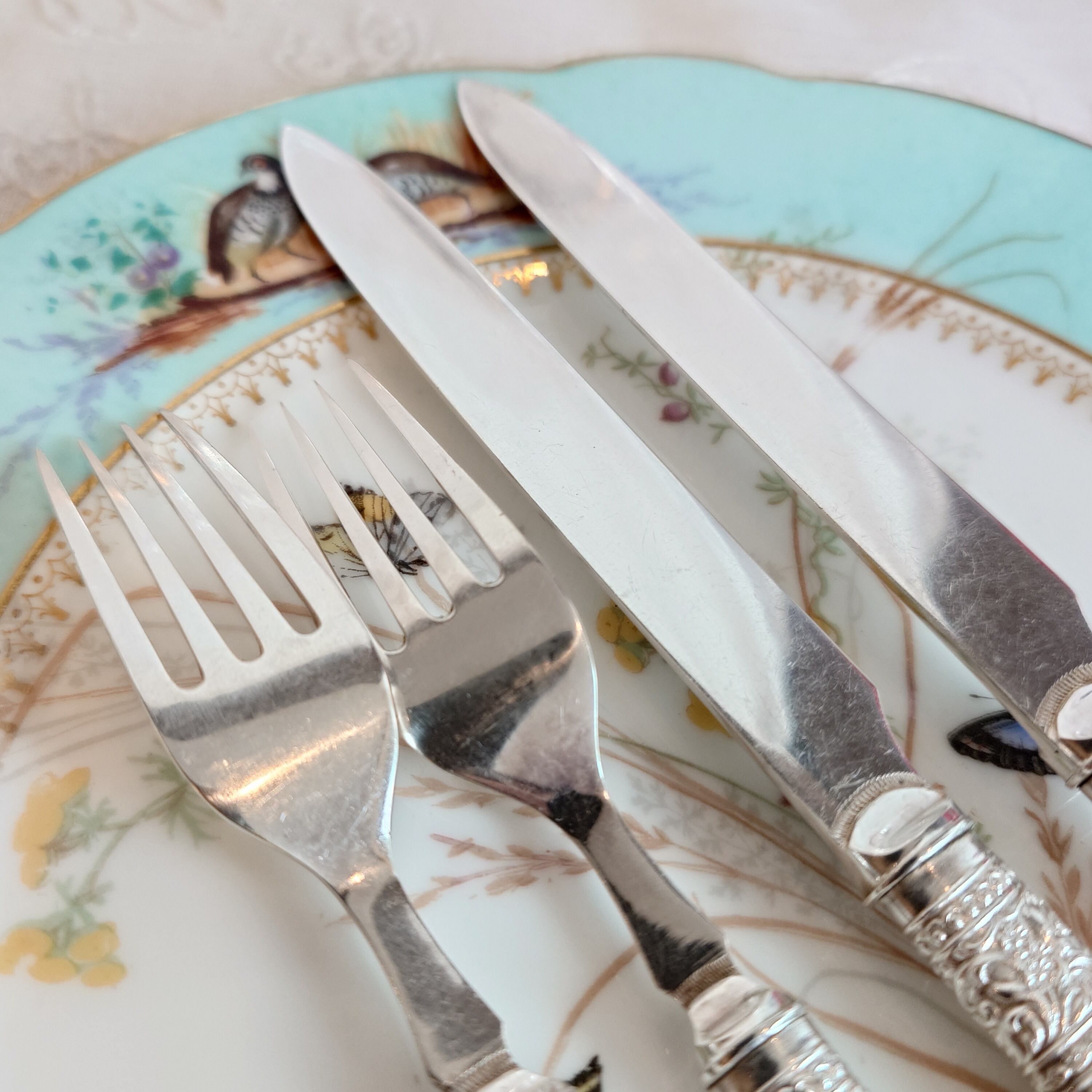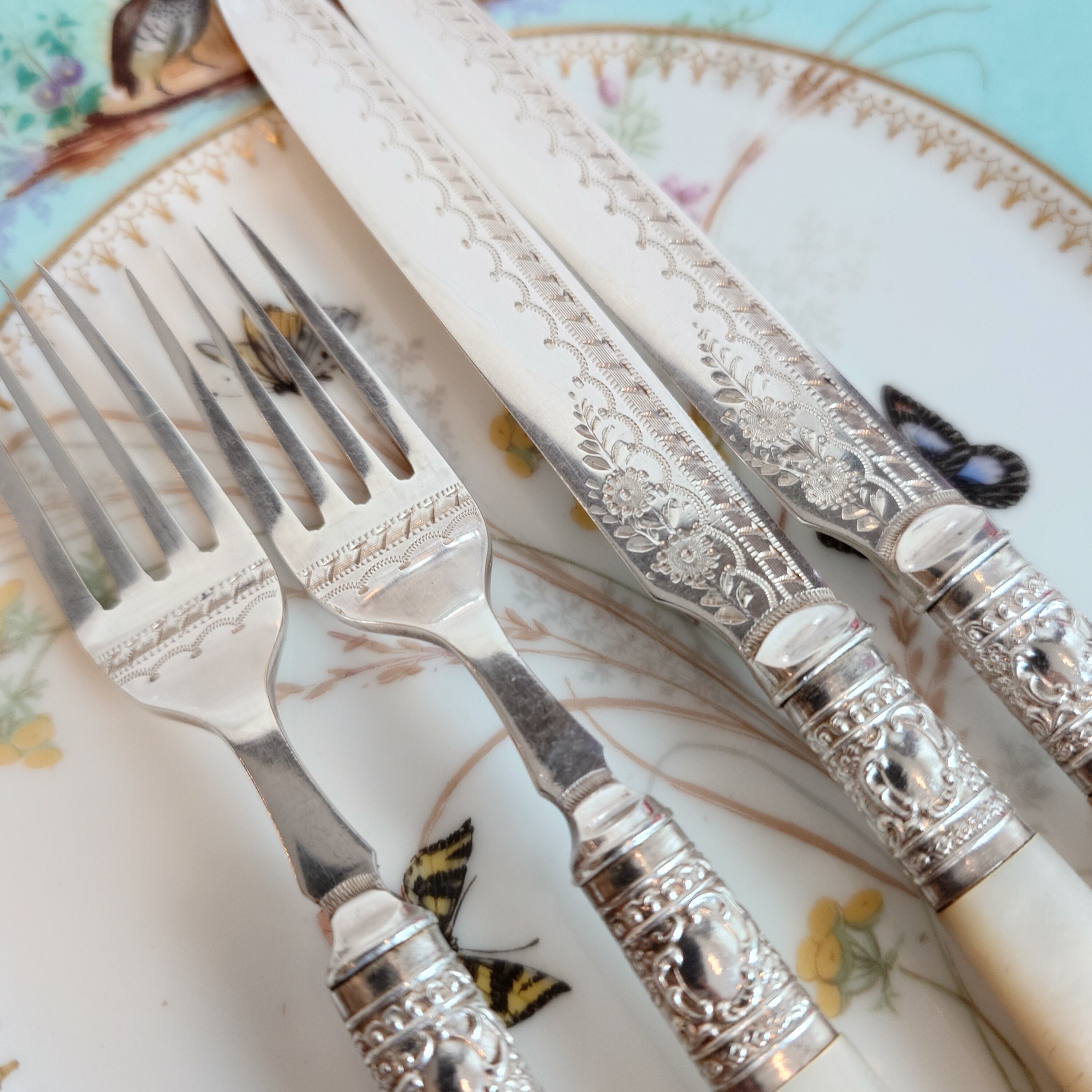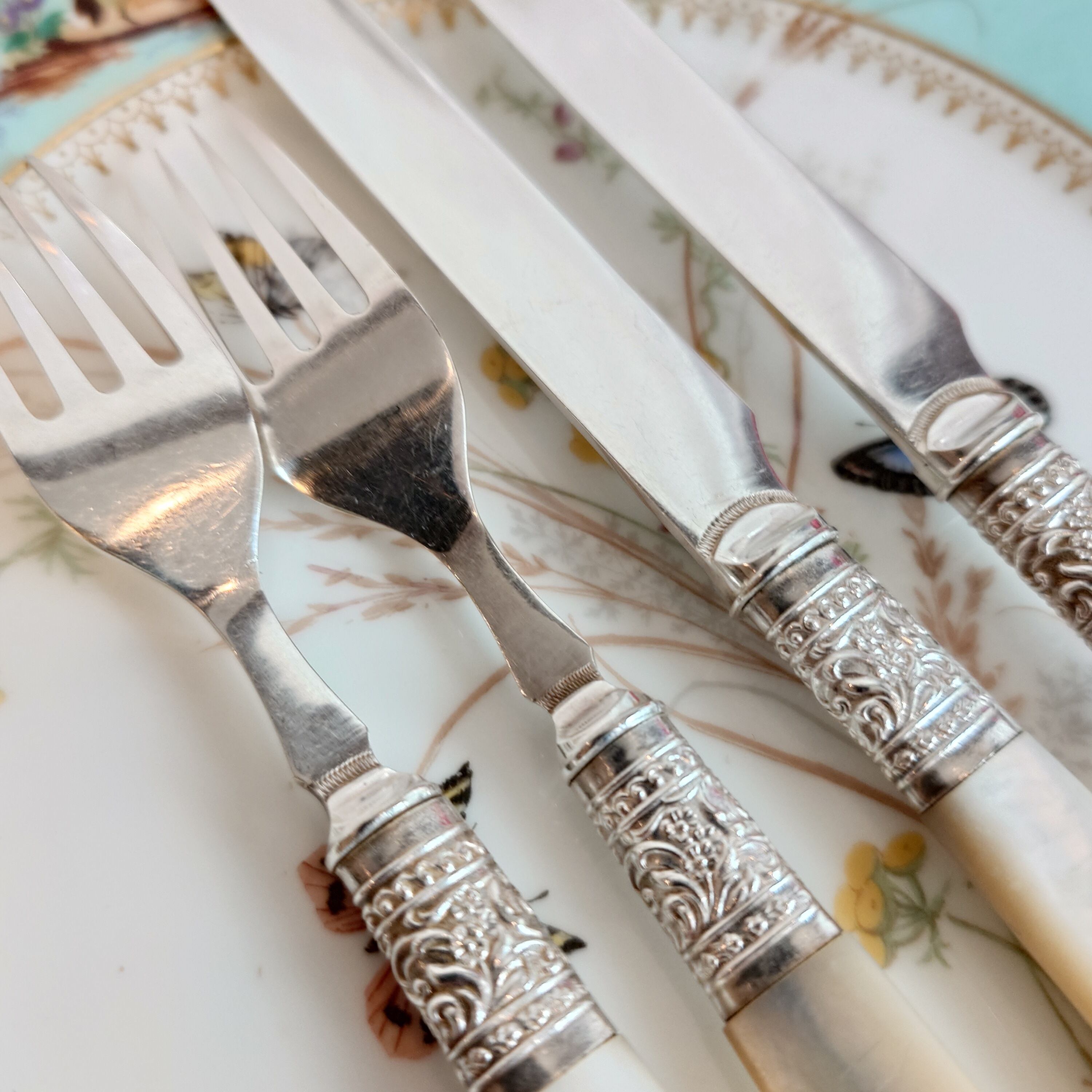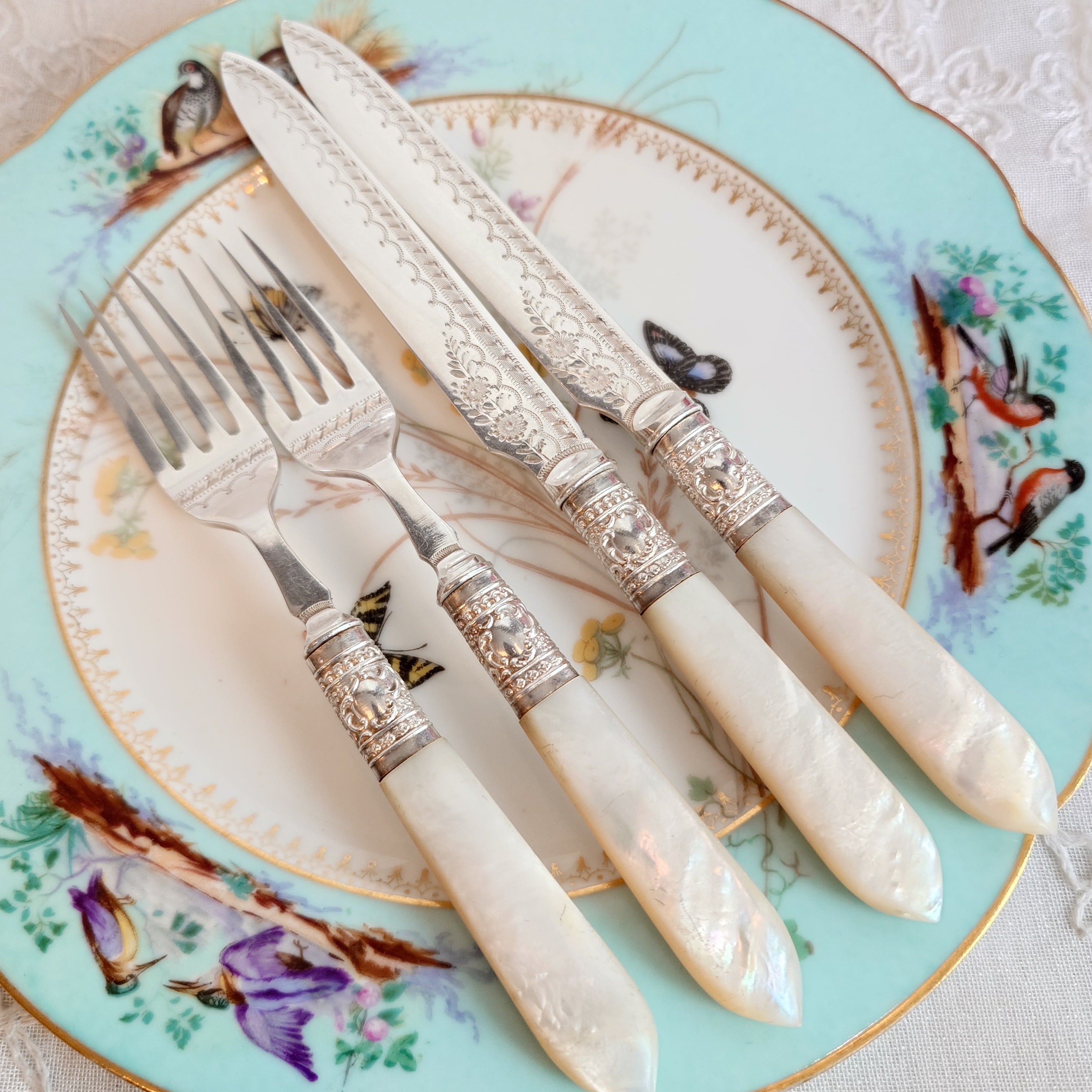 希少な白蝶貝はMOP (マザーオブパール) と略される白蝶貝の殻はボタンや工芸品の材料となり、カトラリーには、プラスチックが製品化される以前、1870-1890年頃にカトラリーのハンドル資材として用いられた物ですが、天然ゆえ劣化が起り、状態の良いお品は数少ない貴重なカトラリーです。