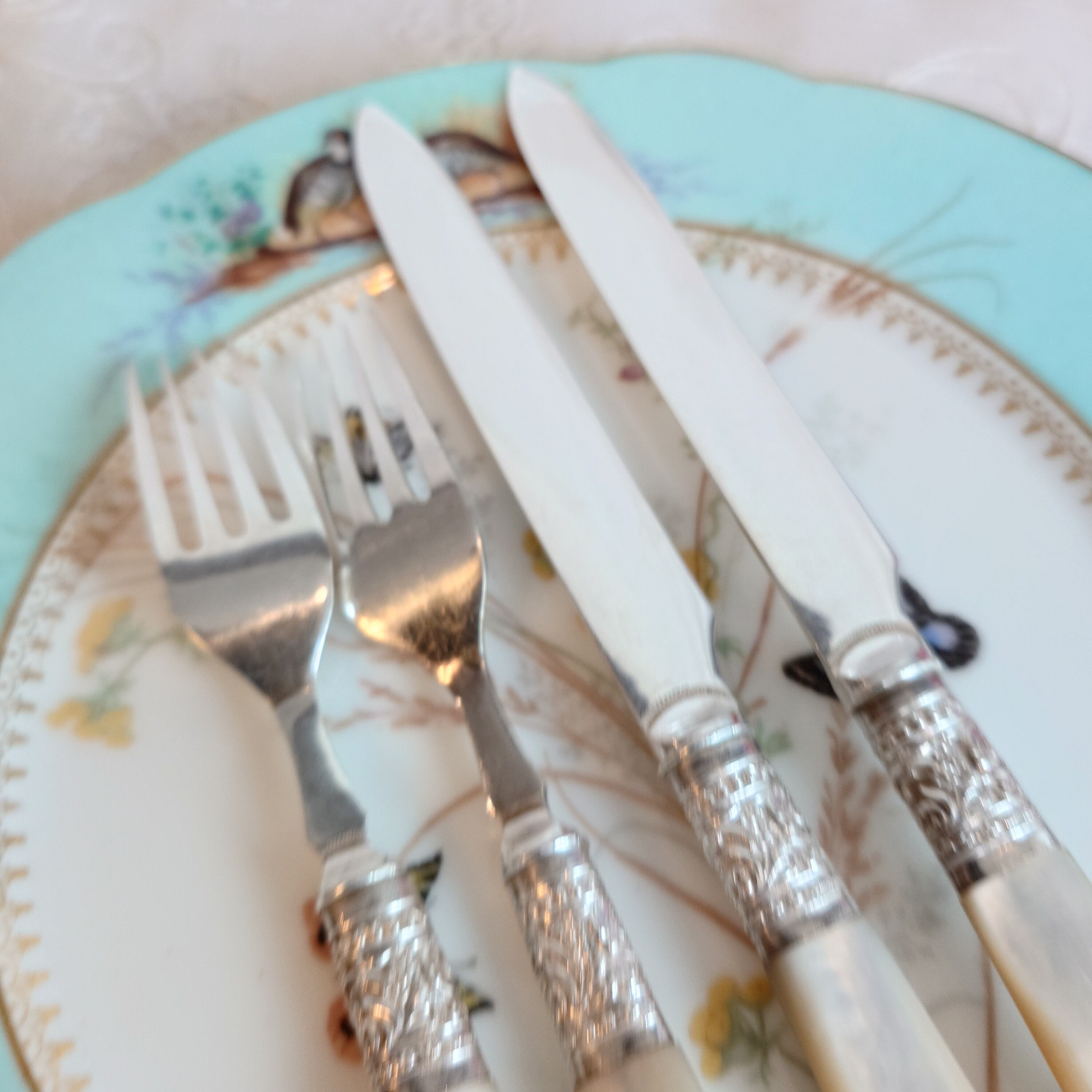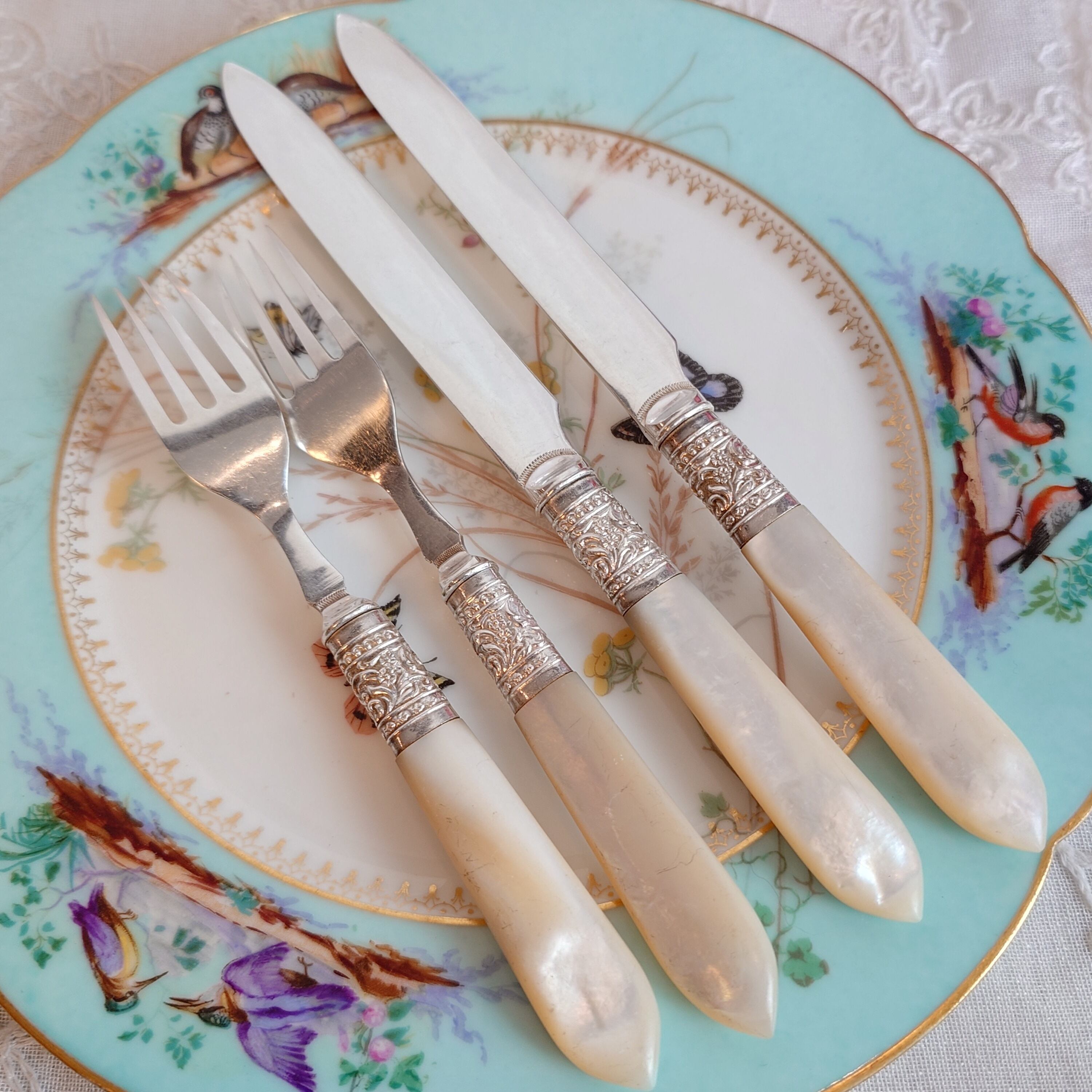 アンティークの白蝶貝ハンドルのデザートカトラリーセットです