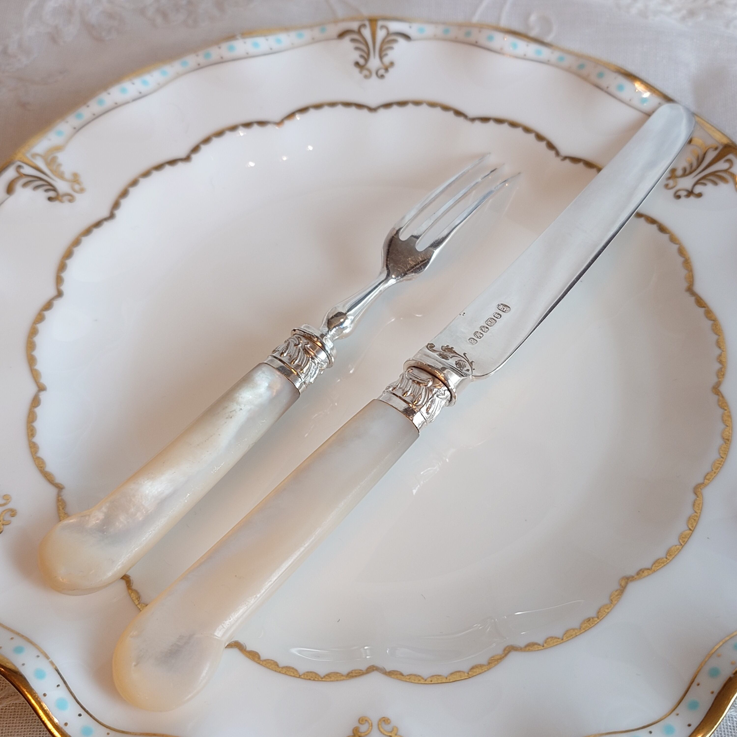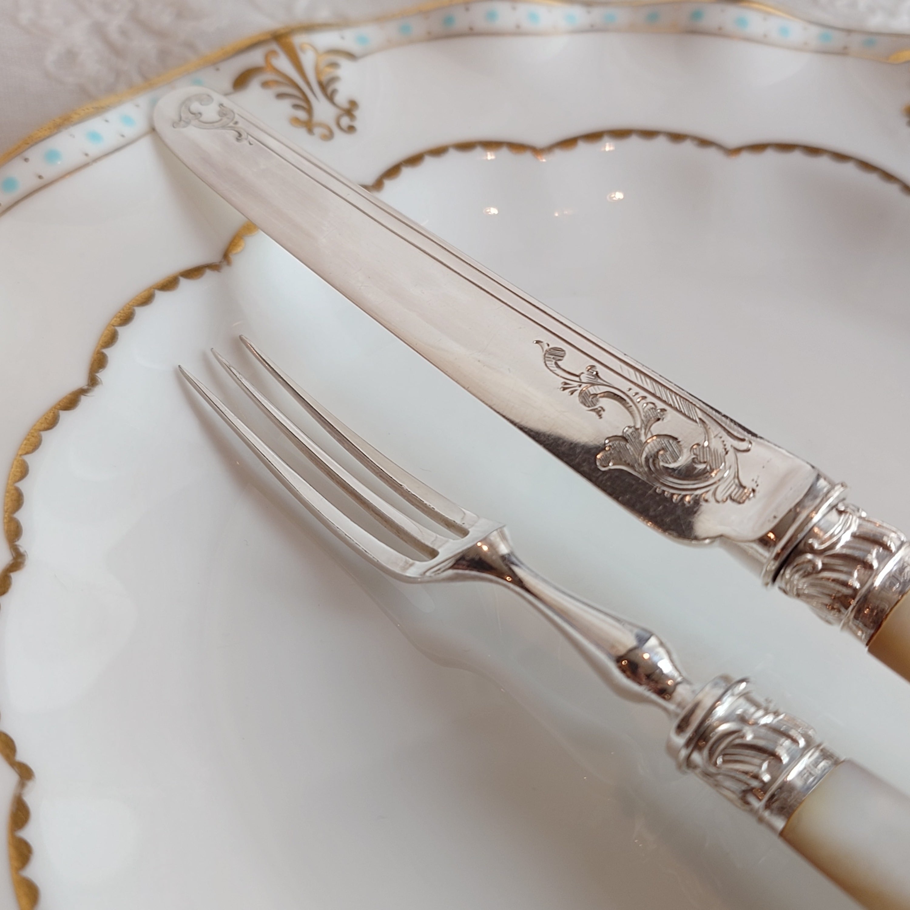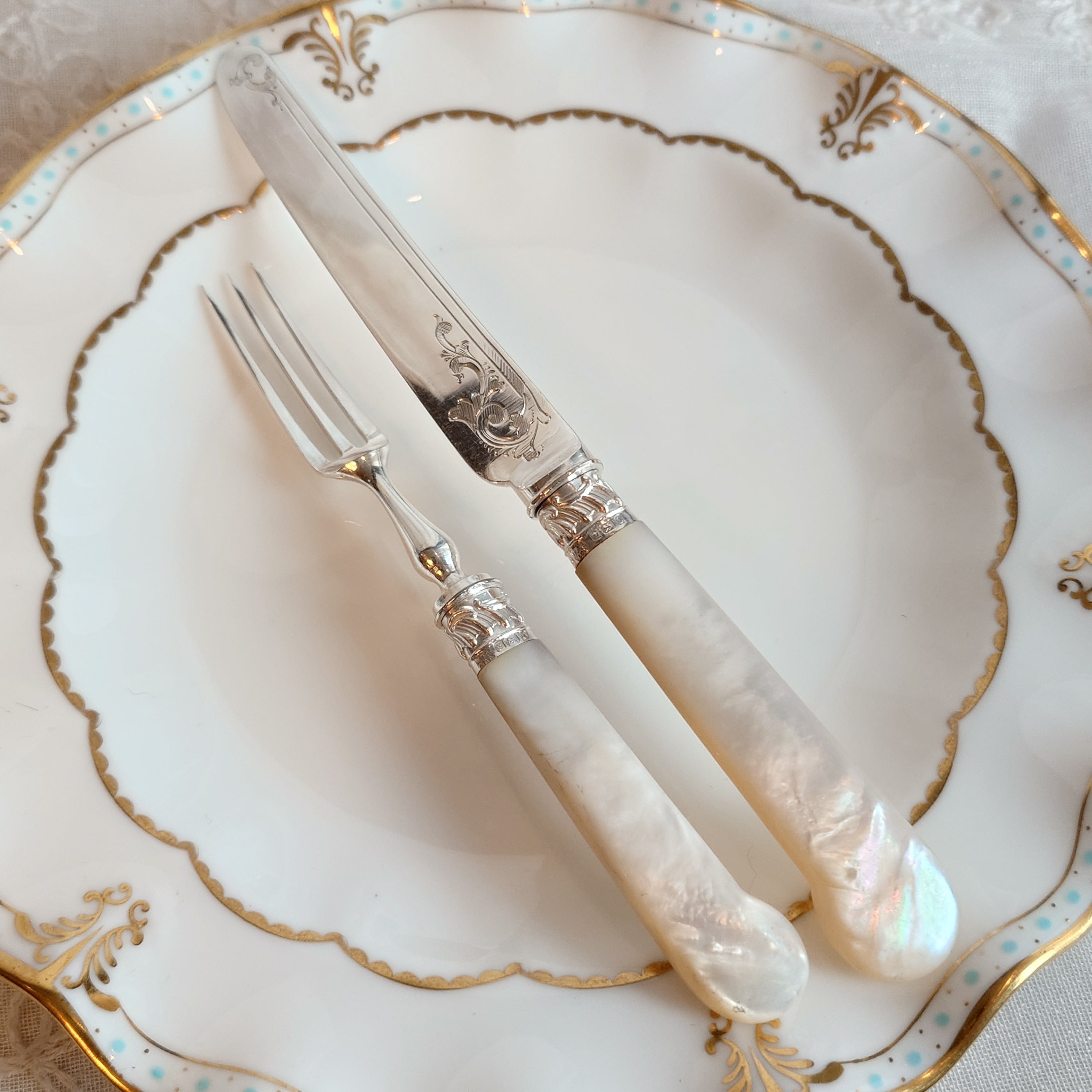 希少な白蝶貝はMOP (マザーオブパール) と略される白蝶貝の殻はボタンや工芸品の材料となり、カトラリーには、プラスチックが製品化される以前、1870-1890年頃にカトラリーのハンドル資材として用いられた物ですが、天然ゆえ劣化が起り、状態の良いお品は数少ない貴重なカトラリーです。