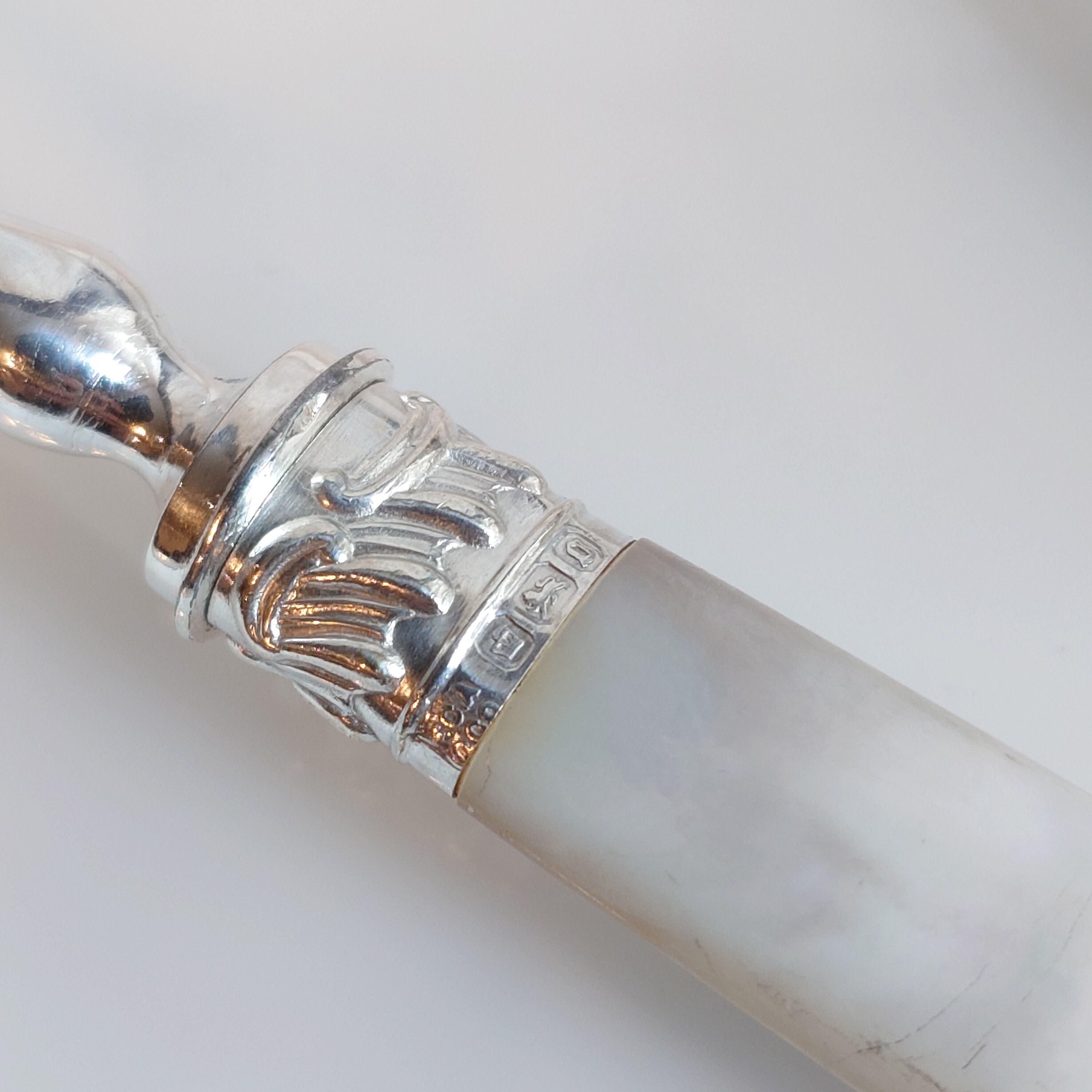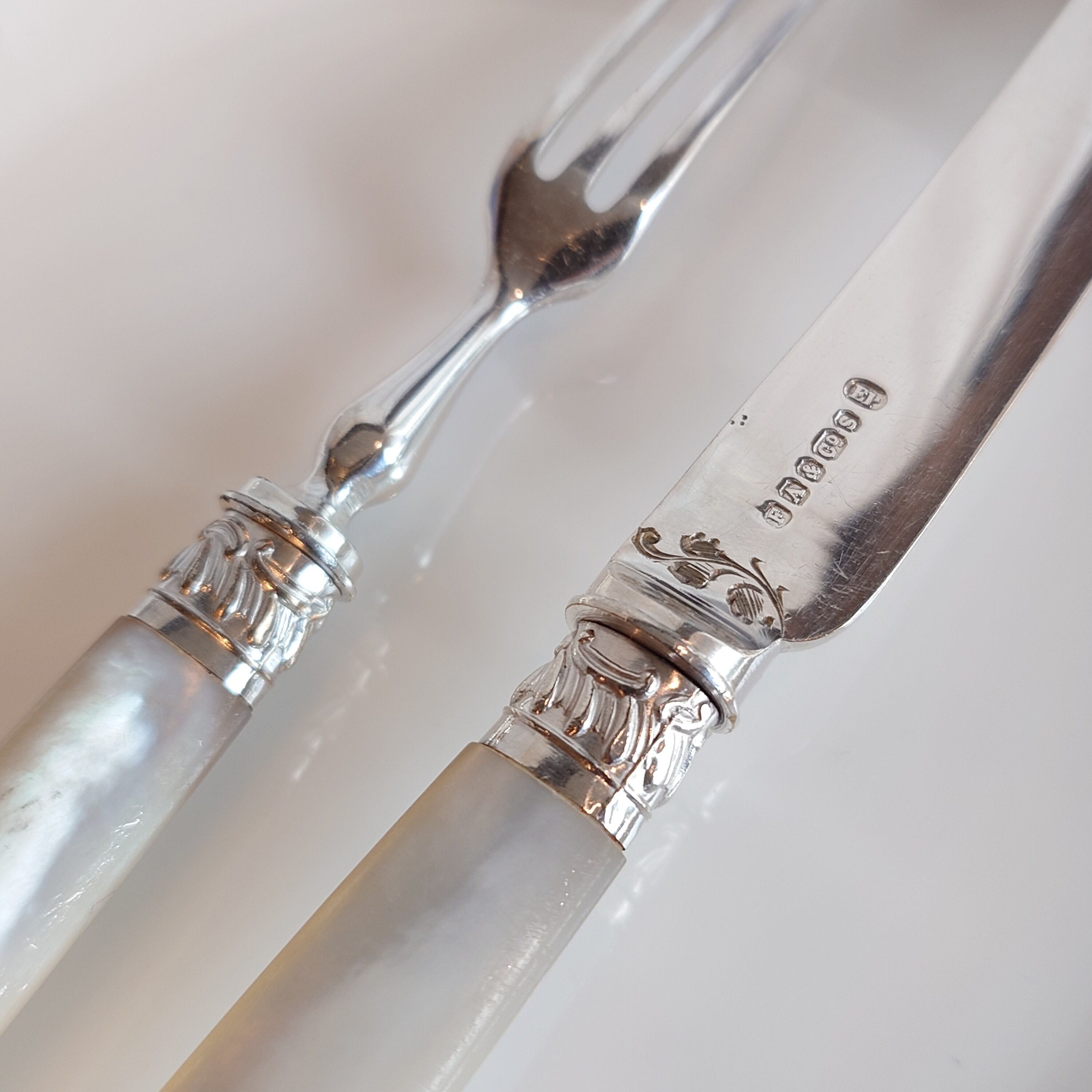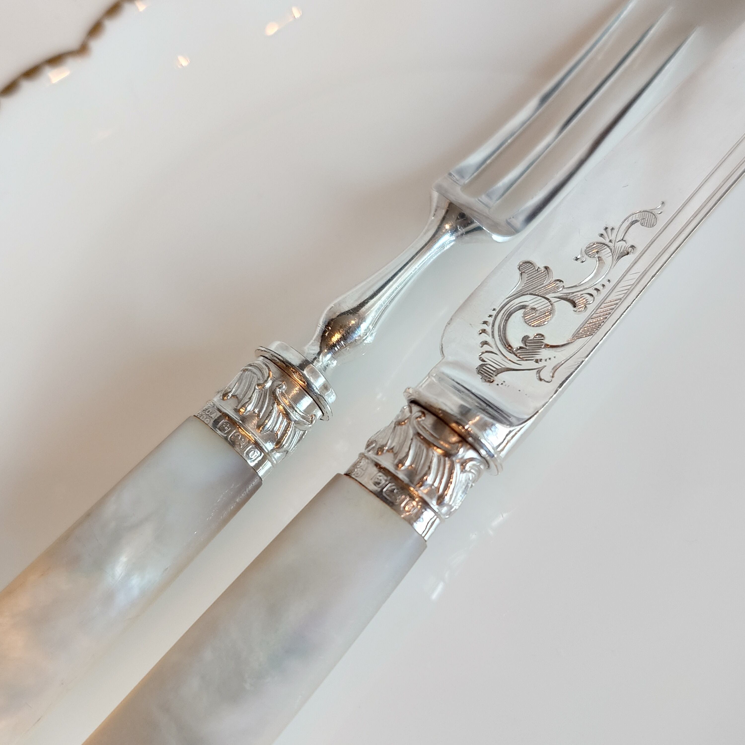 希少な白蝶貝はMOP (マザーオブパール) と略される白蝶貝の殻はボタンや工芸品の材料となり、カトラリーには、プラスチックが製品化される以前、1870-1890年頃にカトラリーのハンドル資材として用いられた物ですが、天然ゆえ劣化が起り、状態の良いお品は数少ない貴重なカトラリーです。