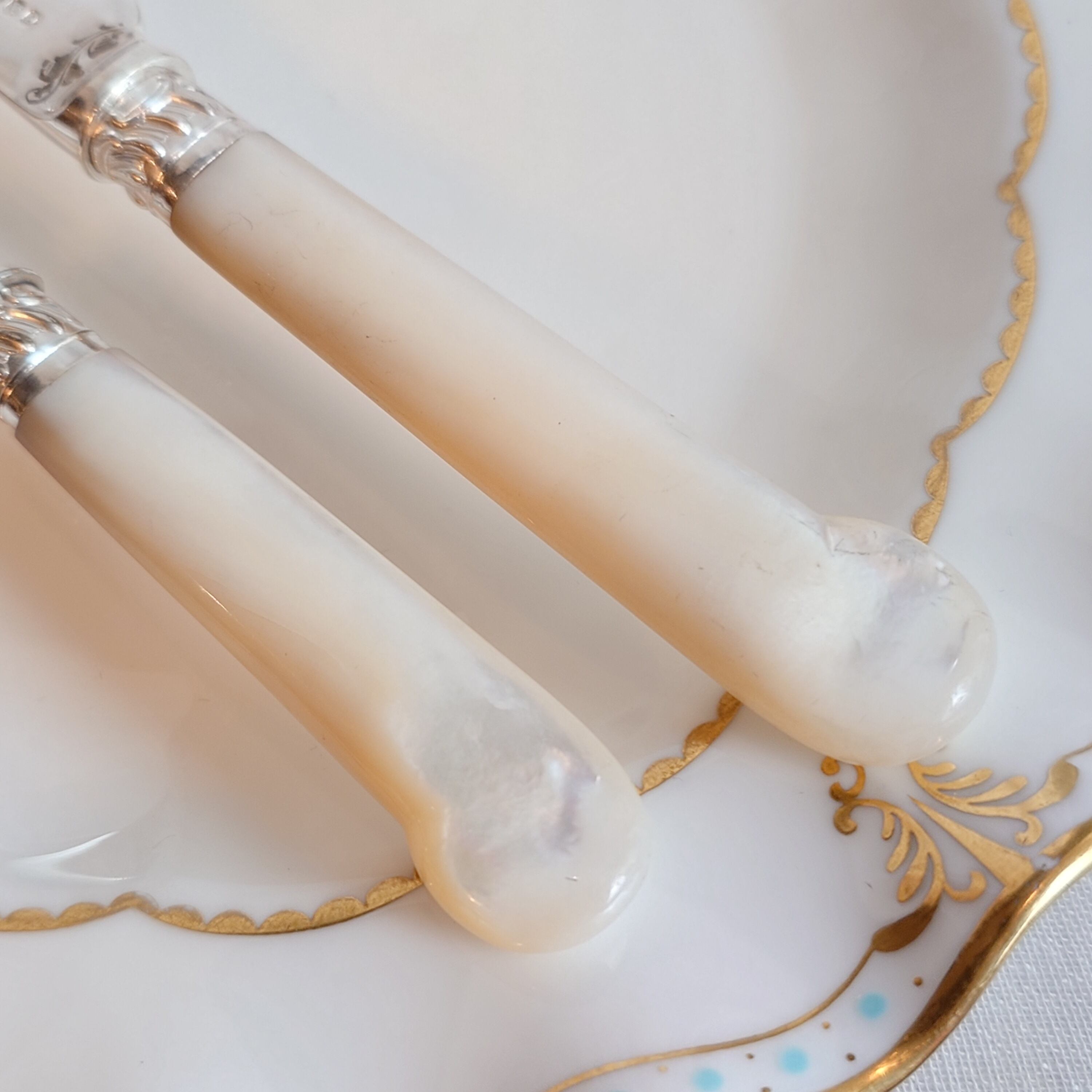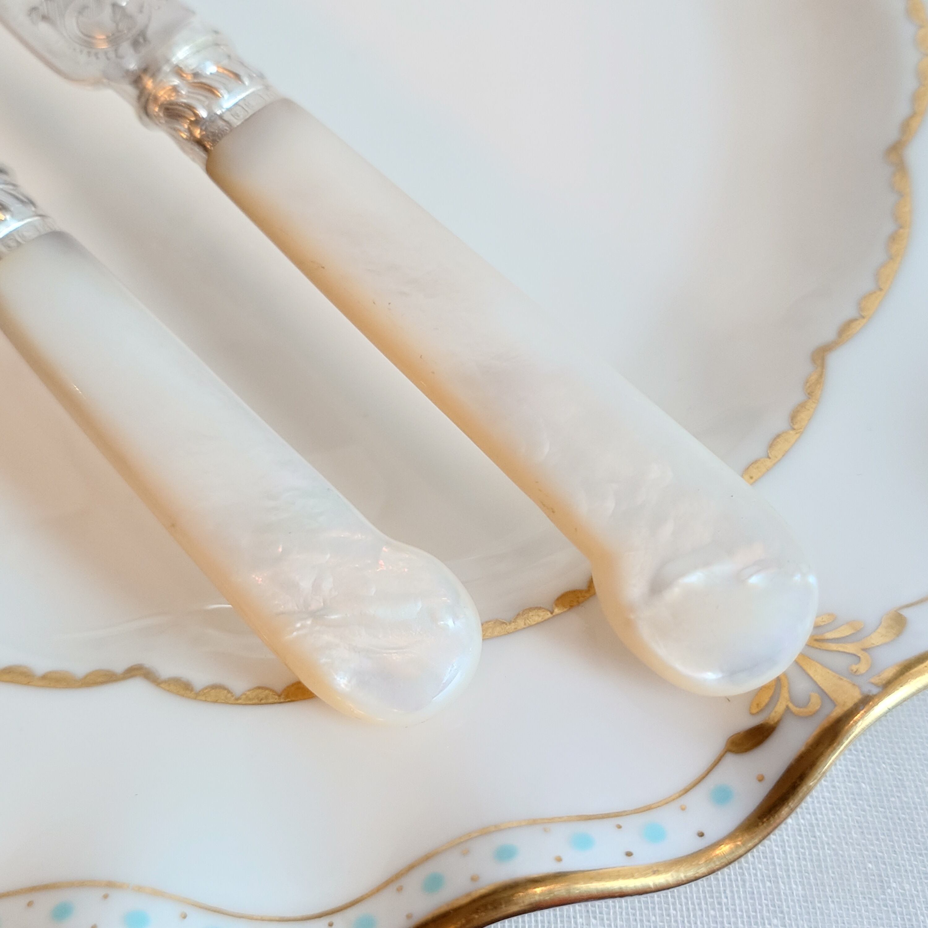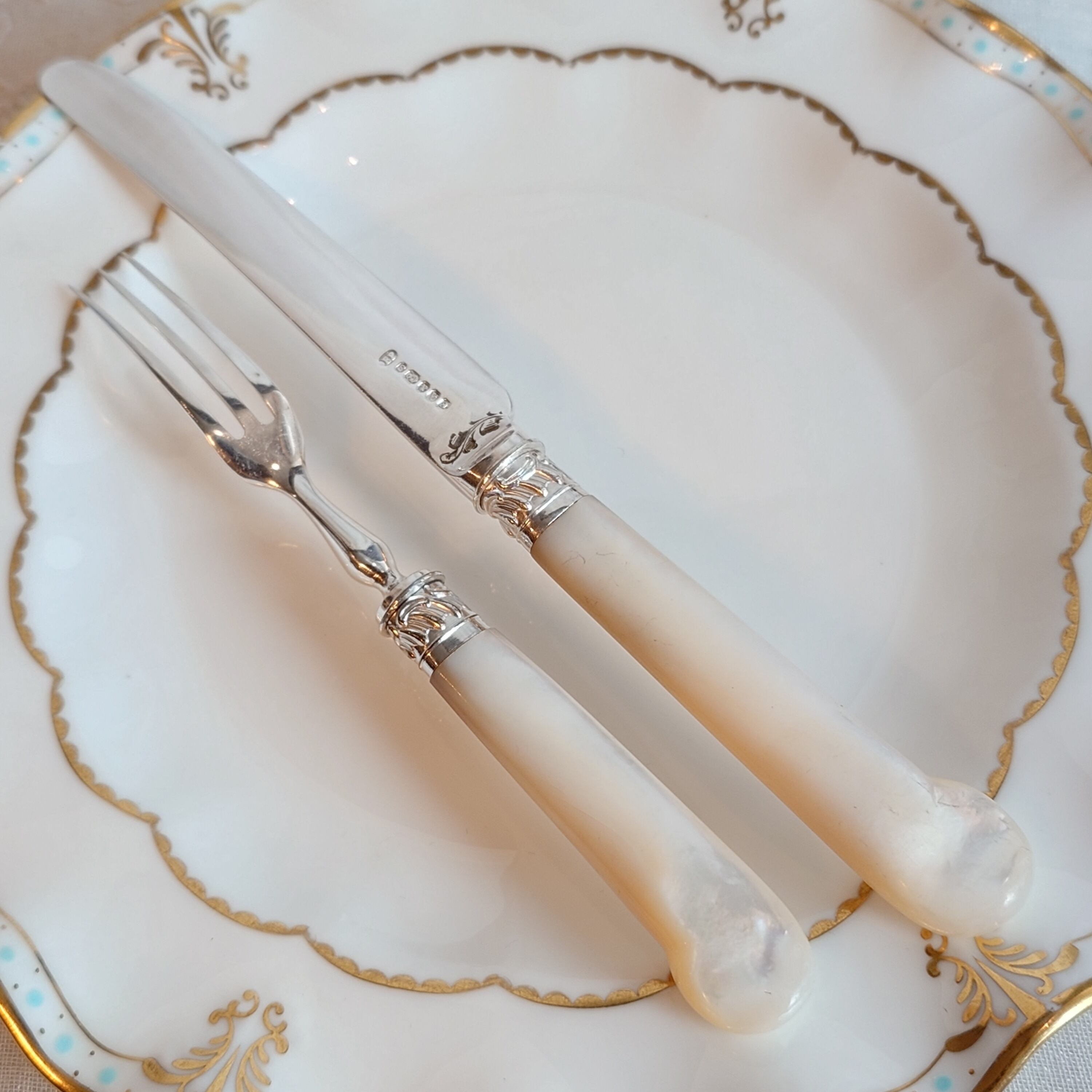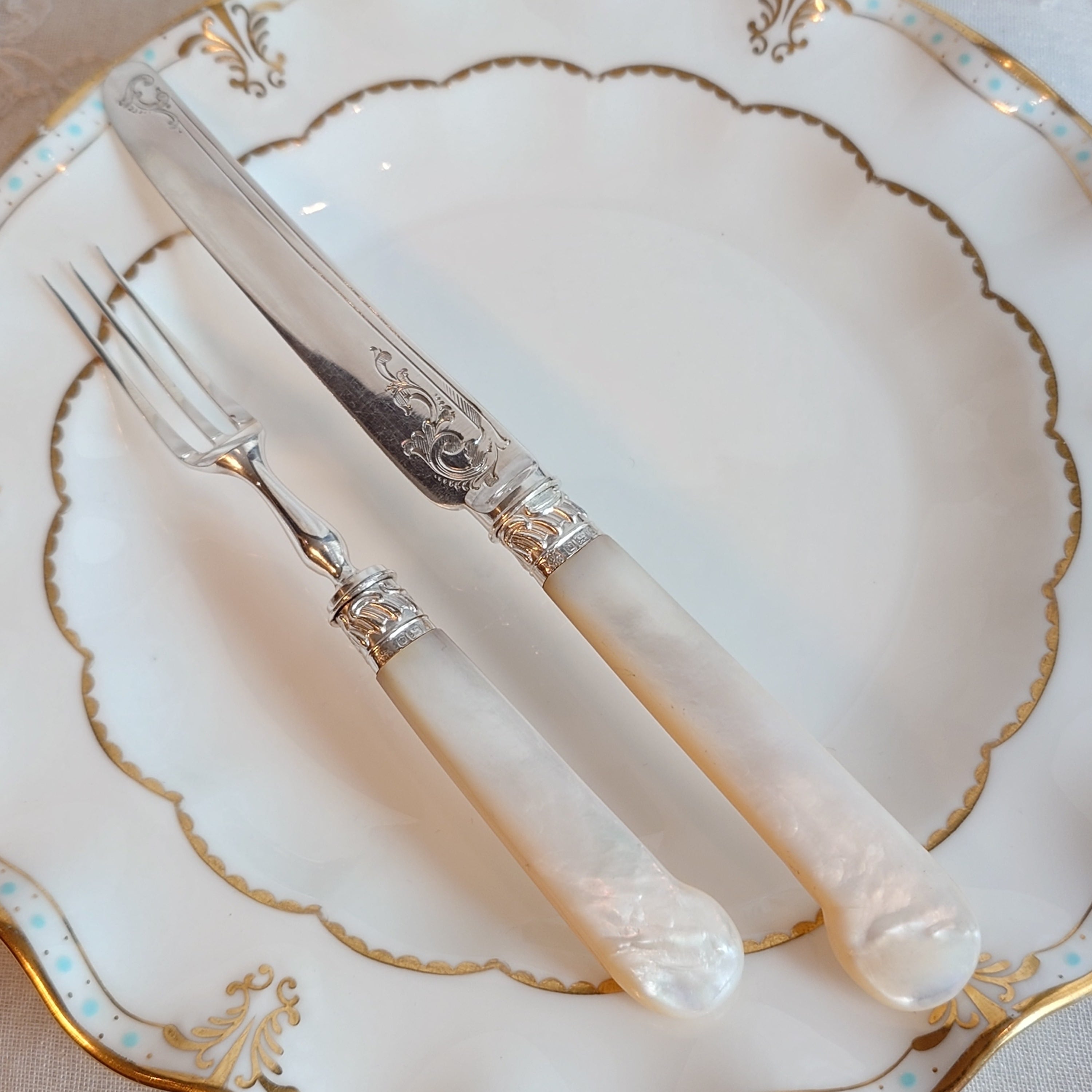 希少な白蝶貝はMOP (マザーオブパール) と略される白蝶貝の殻はボタンや工芸品の材料となり、カトラリーには、プラスチックが製品化される以前、1870-1890年頃にカトラリーのハンドル資材として用いられた物ですが、天然ゆえ劣化が起り、状態の良いお品は数少ない貴重なカトラリーです。