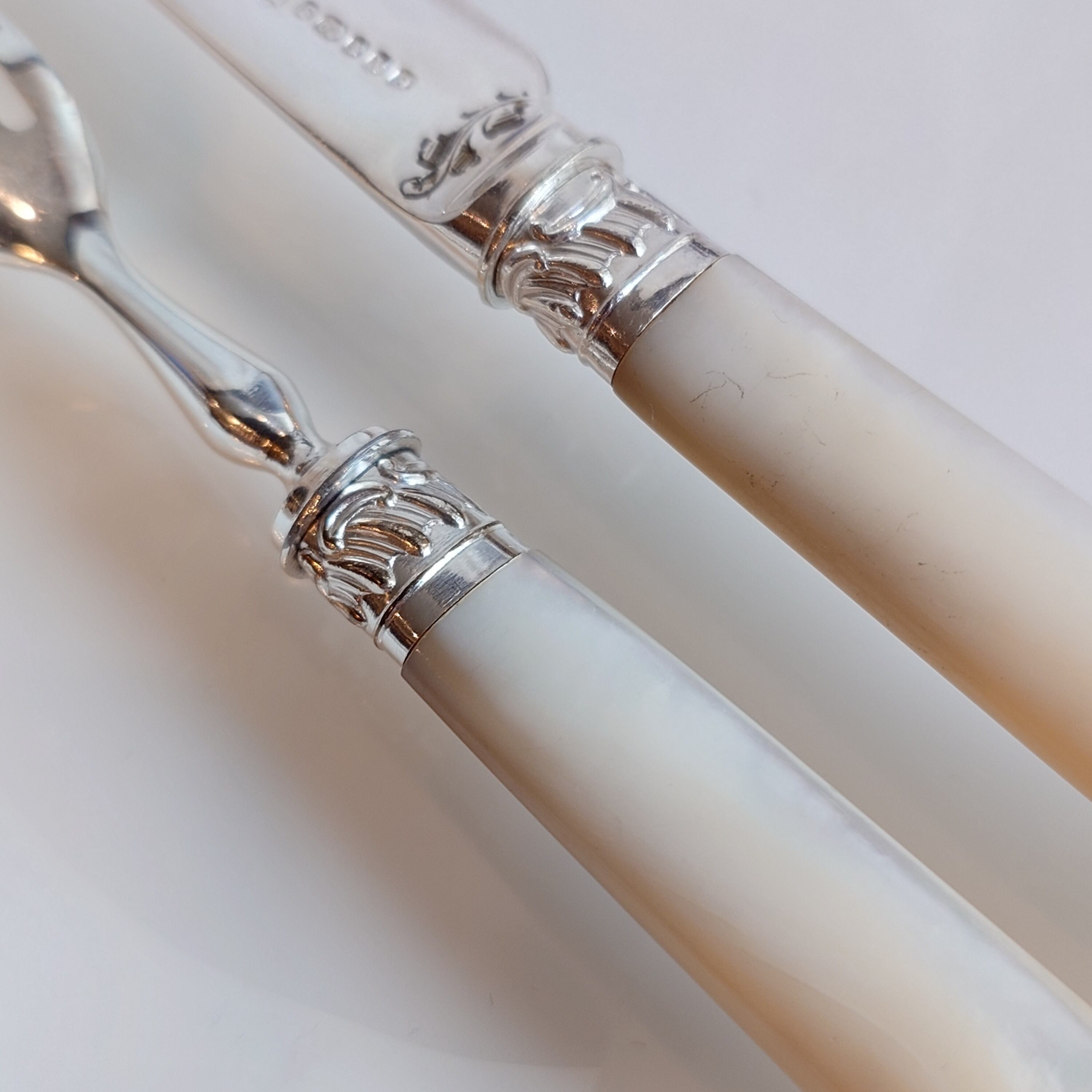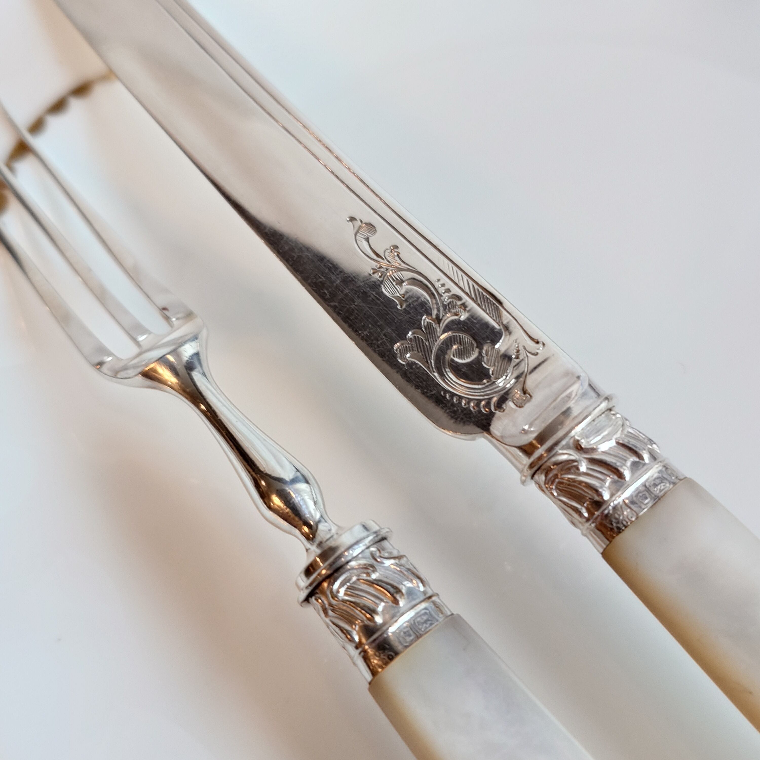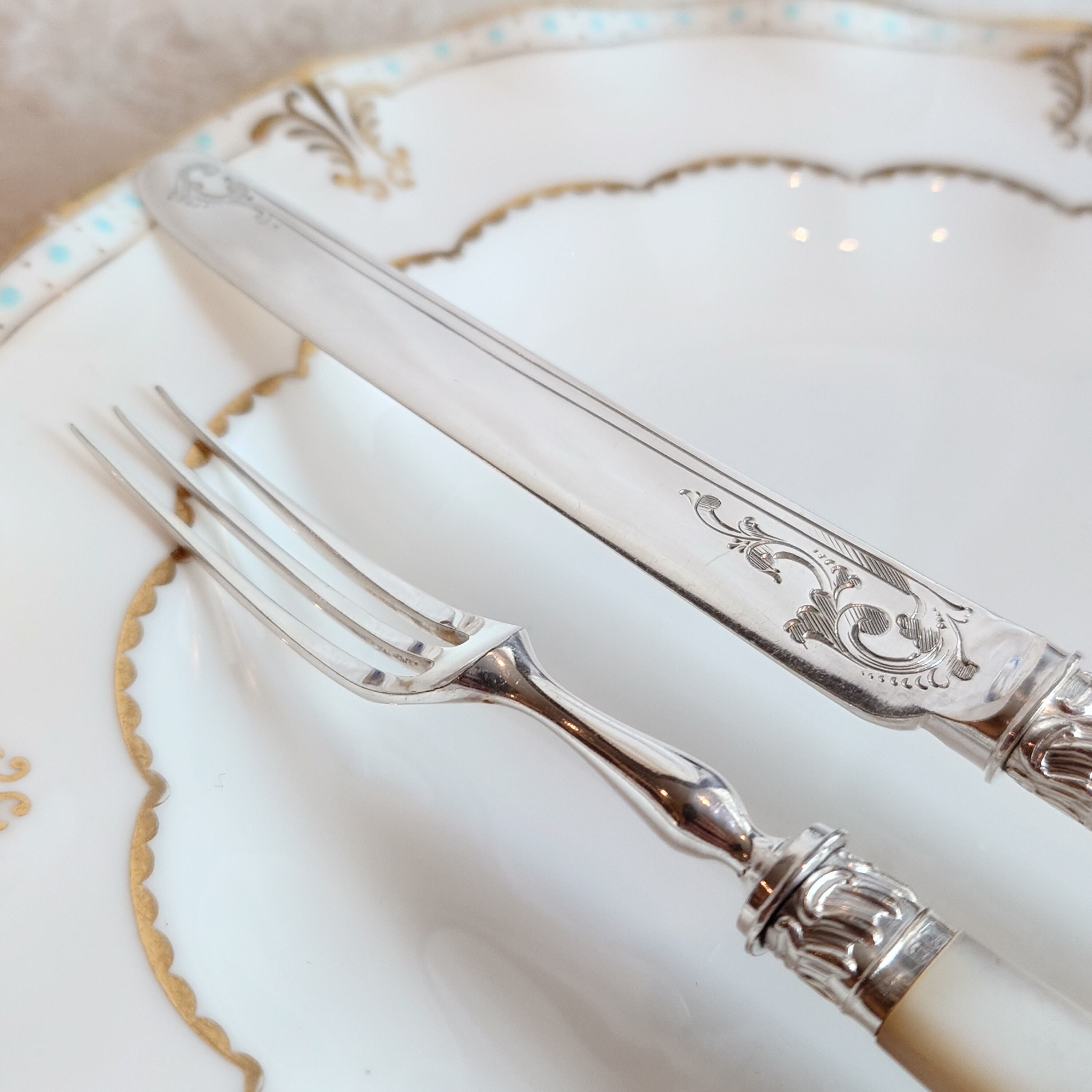 希少な白蝶貝はMOP (マザーオブパール) と略される白蝶貝の殻はボタンや工芸品の材料となり、カトラリーには、プラスチックが製品化される以前、1870-1890年頃にカトラリーのハンドル資材として用いられた物ですが、天然ゆえ劣化が起り、状態の良いお品は数少ない貴重なカトラリーです。
