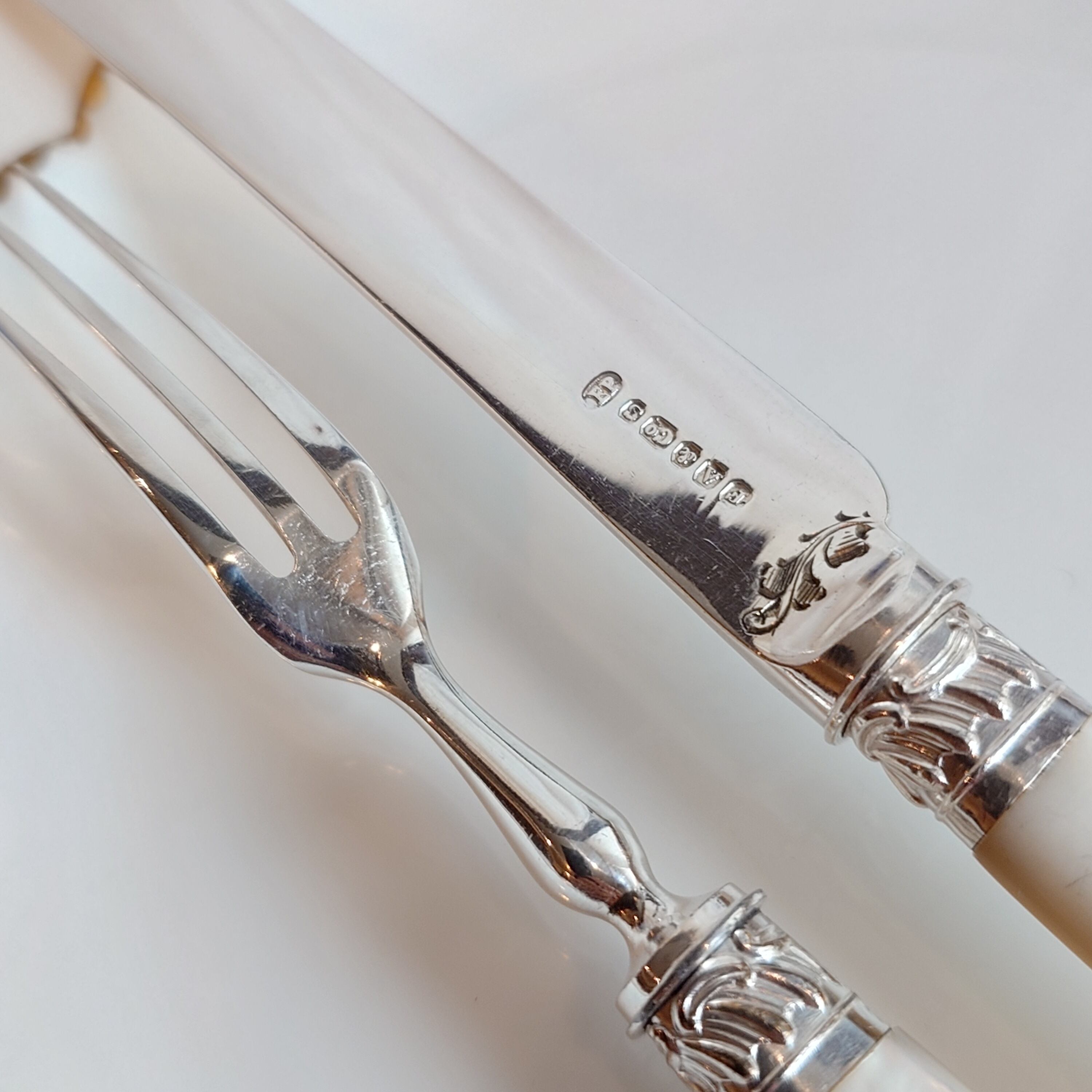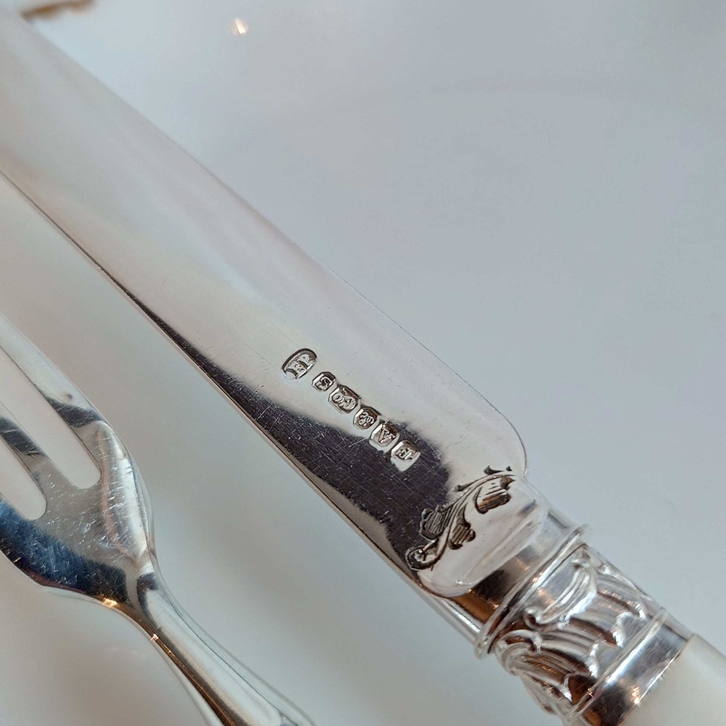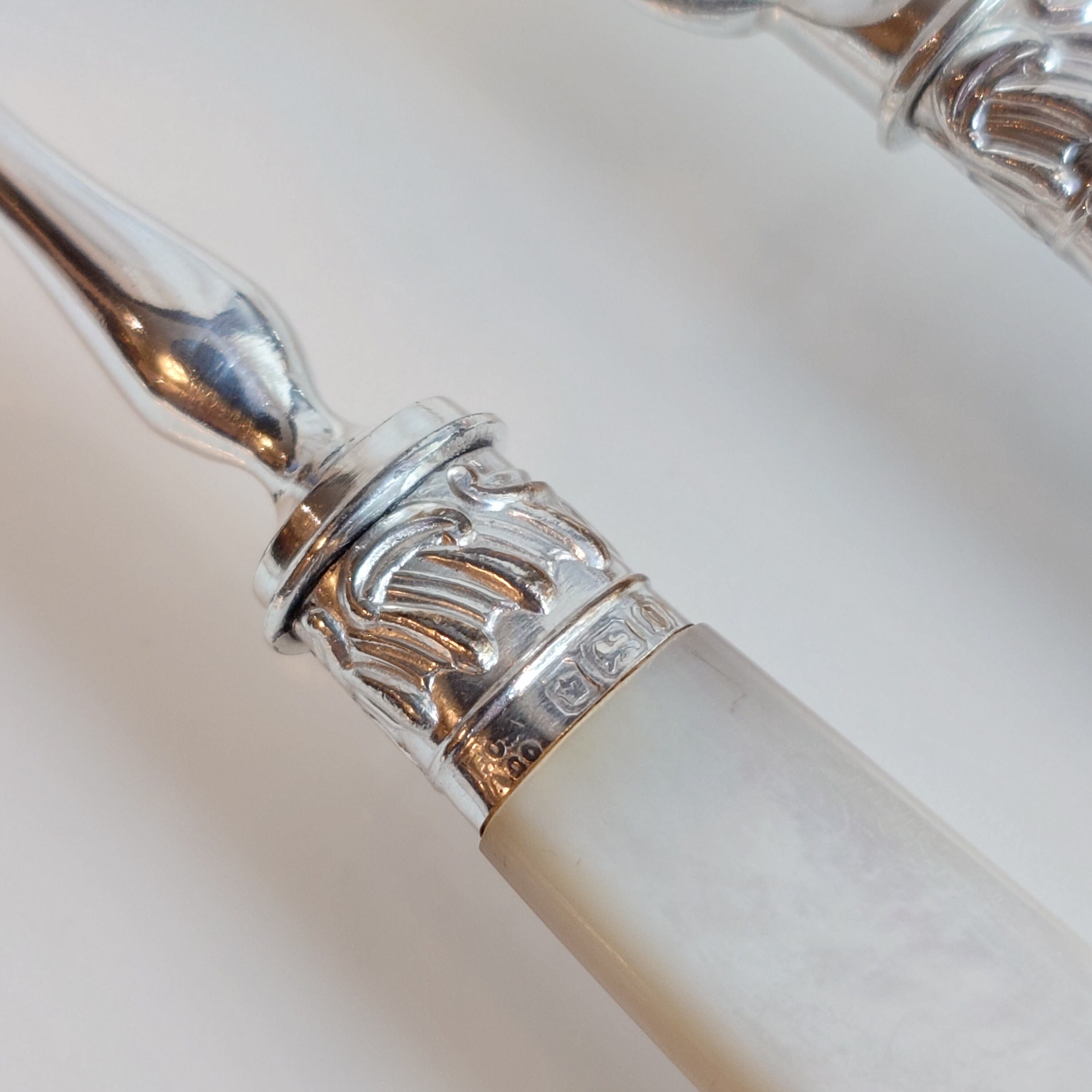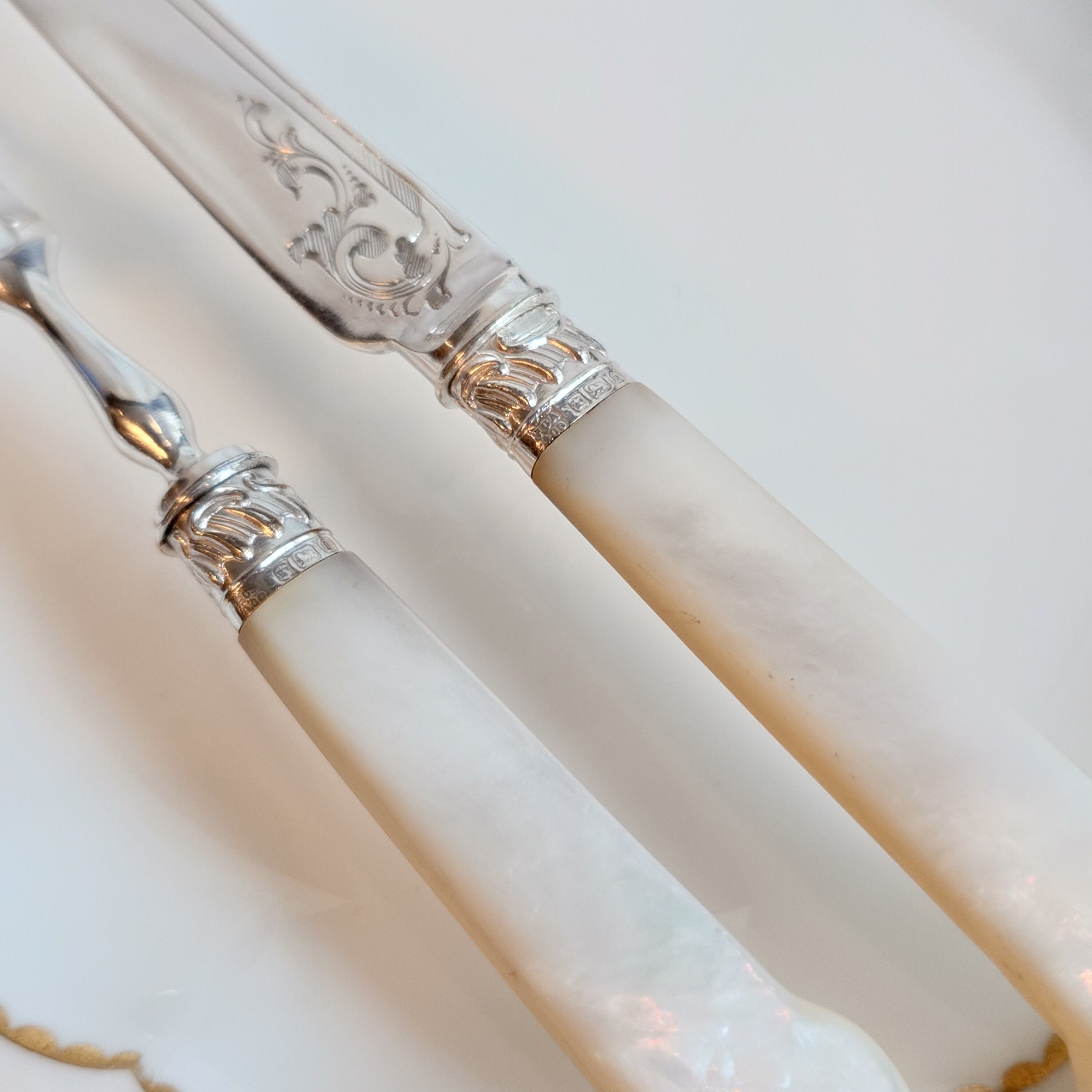 希少な白蝶貝はMOP (マザーオブパール) と略される白蝶貝の殻はボタンや工芸品の材料となり、カトラリーには、プラスチックが製品化される以前、1870-1890年頃にカトラリーのハンドル資材として用いられた物ですが、天然ゆえ劣化が起り、状態の良いお品は数少ない貴重なカトラリーです。