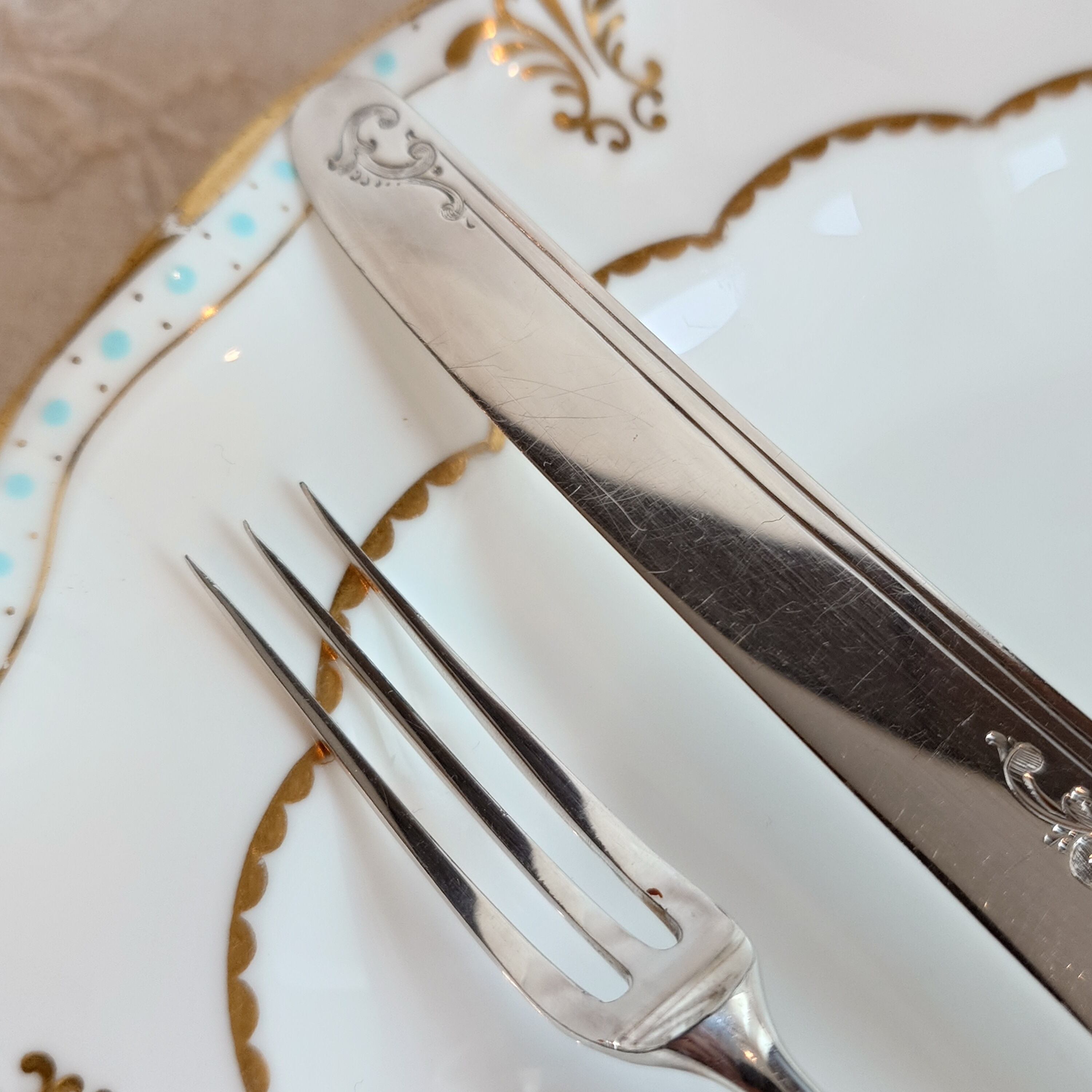 流れるようなスクロールの美しいレリーフと、裏面にも控えめに継ぎ目付近にレリーフが施された華やかで上品なカトラリーです。