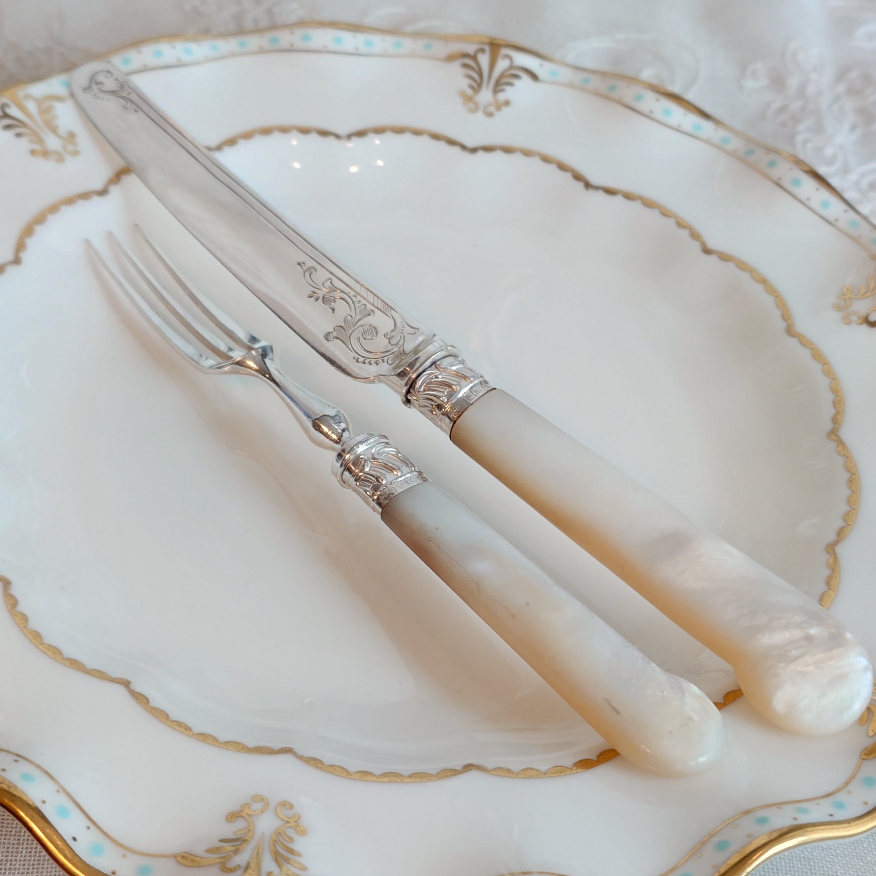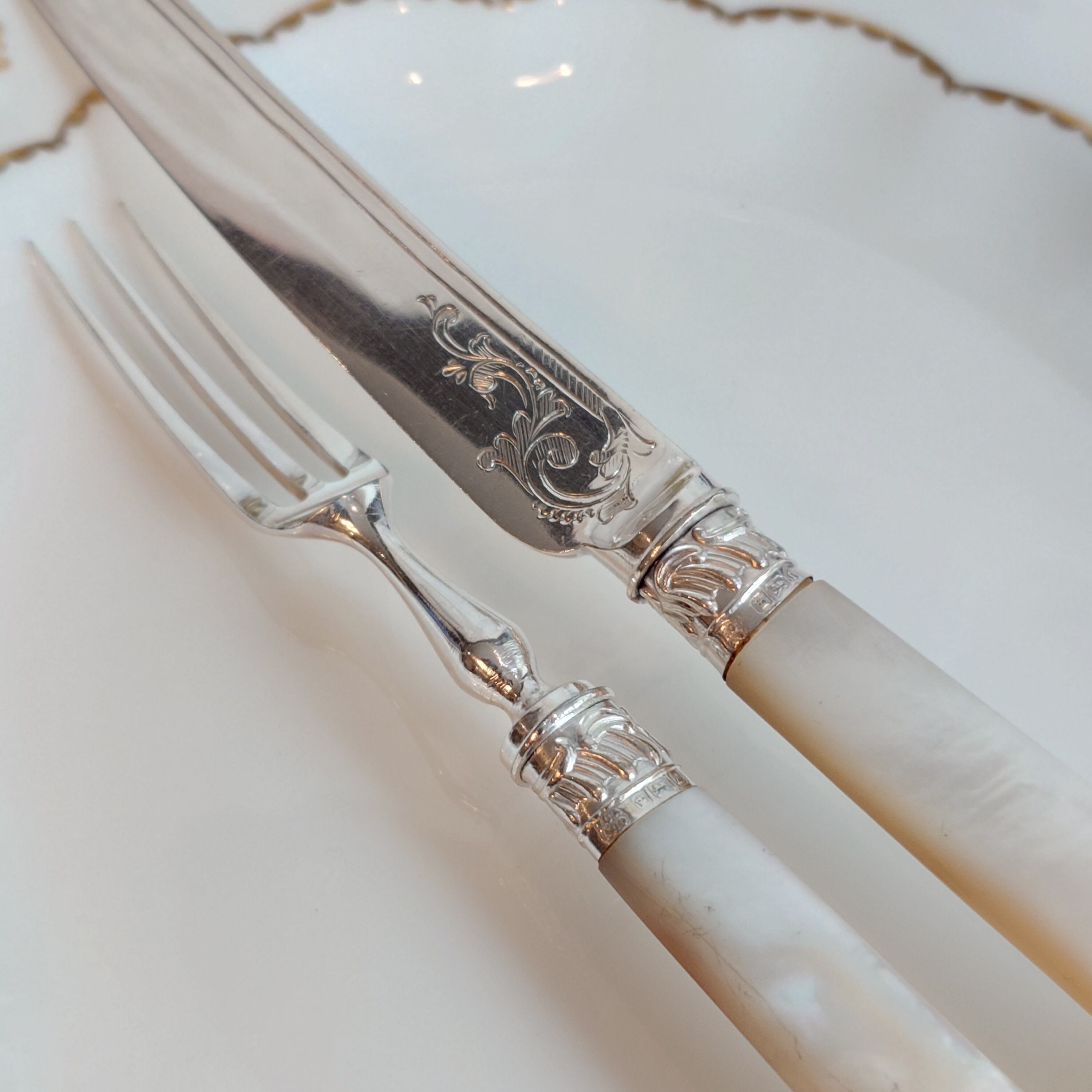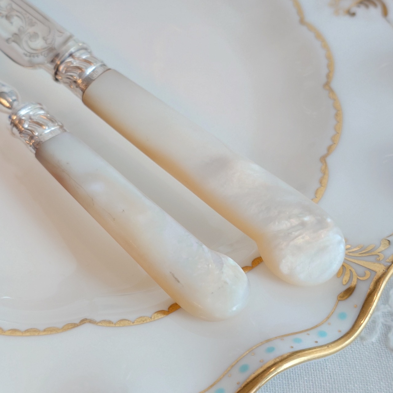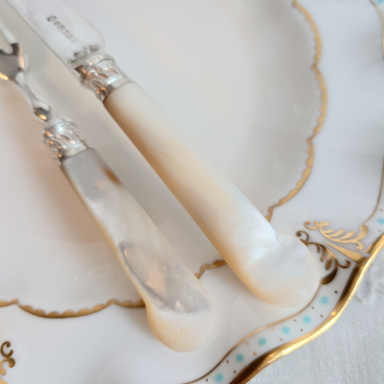 希少な白蝶貝はMOP (マザーオブパール) と略される白蝶貝の殻はボタンや工芸品の材料となり、カトラリーには、プラスチックが製品化される以前、1870-1890年頃にカトラリーのハンドル資材として用いられた物ですが、天然ゆえ劣化が起り、状態の良いお品は数少ない貴重なカトラリーです。