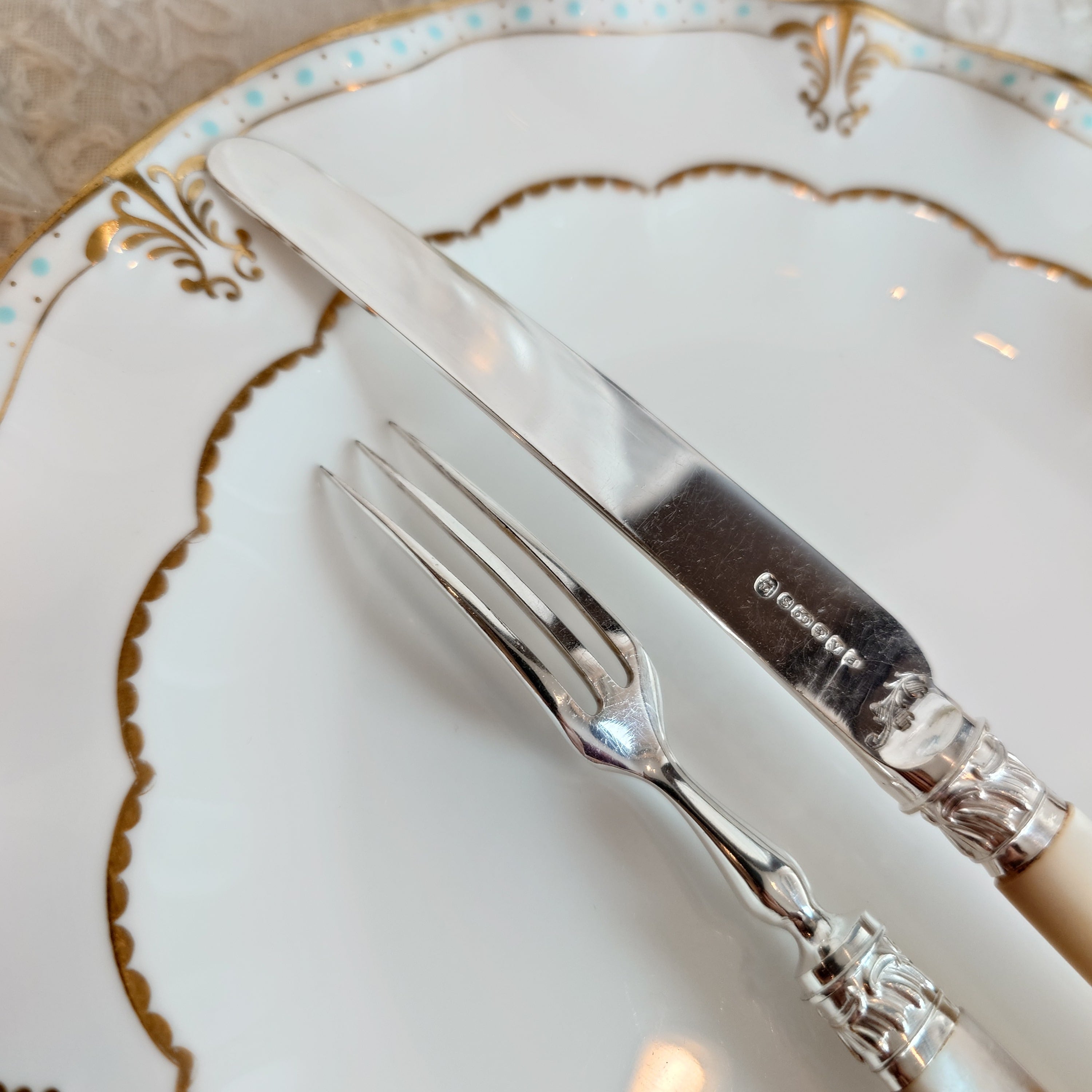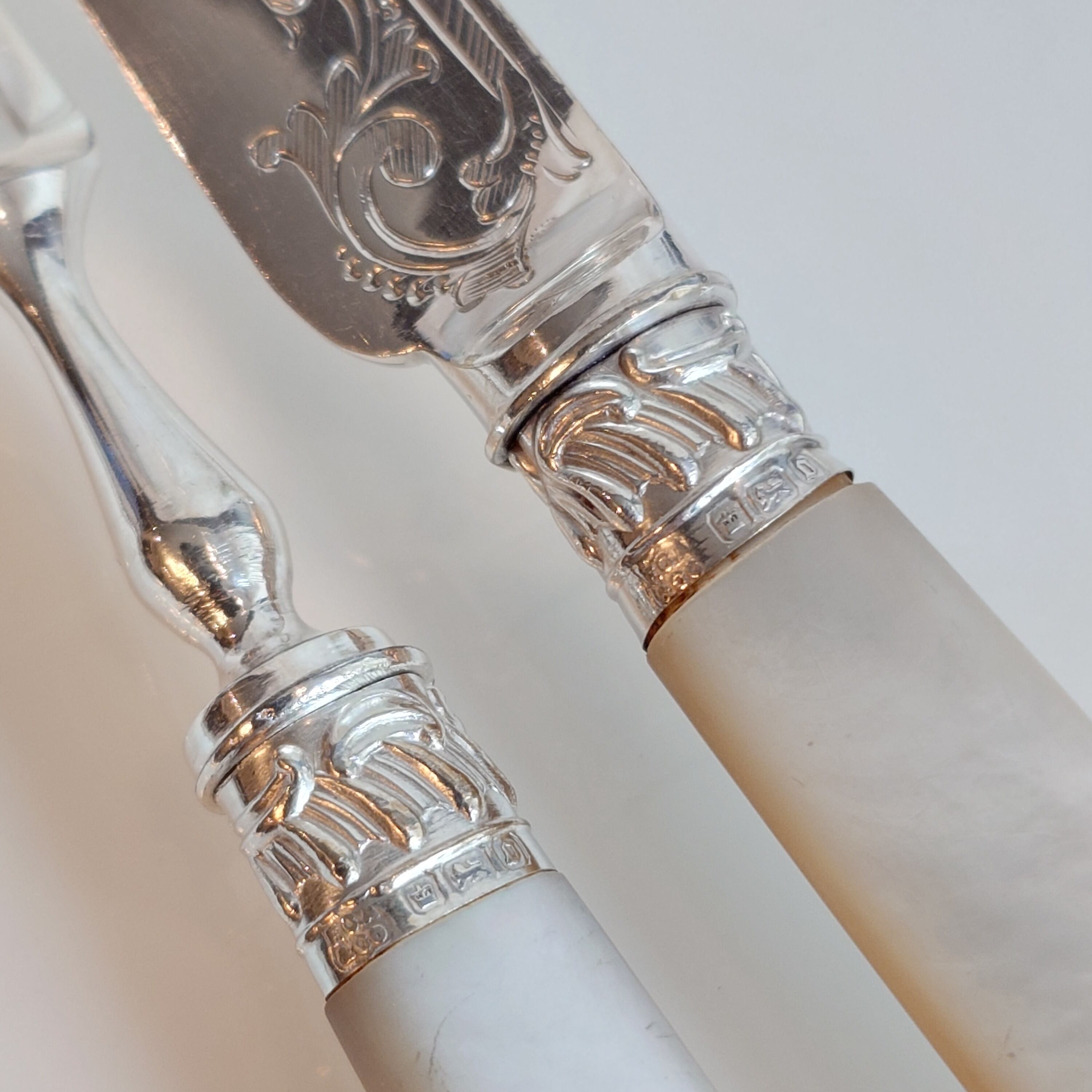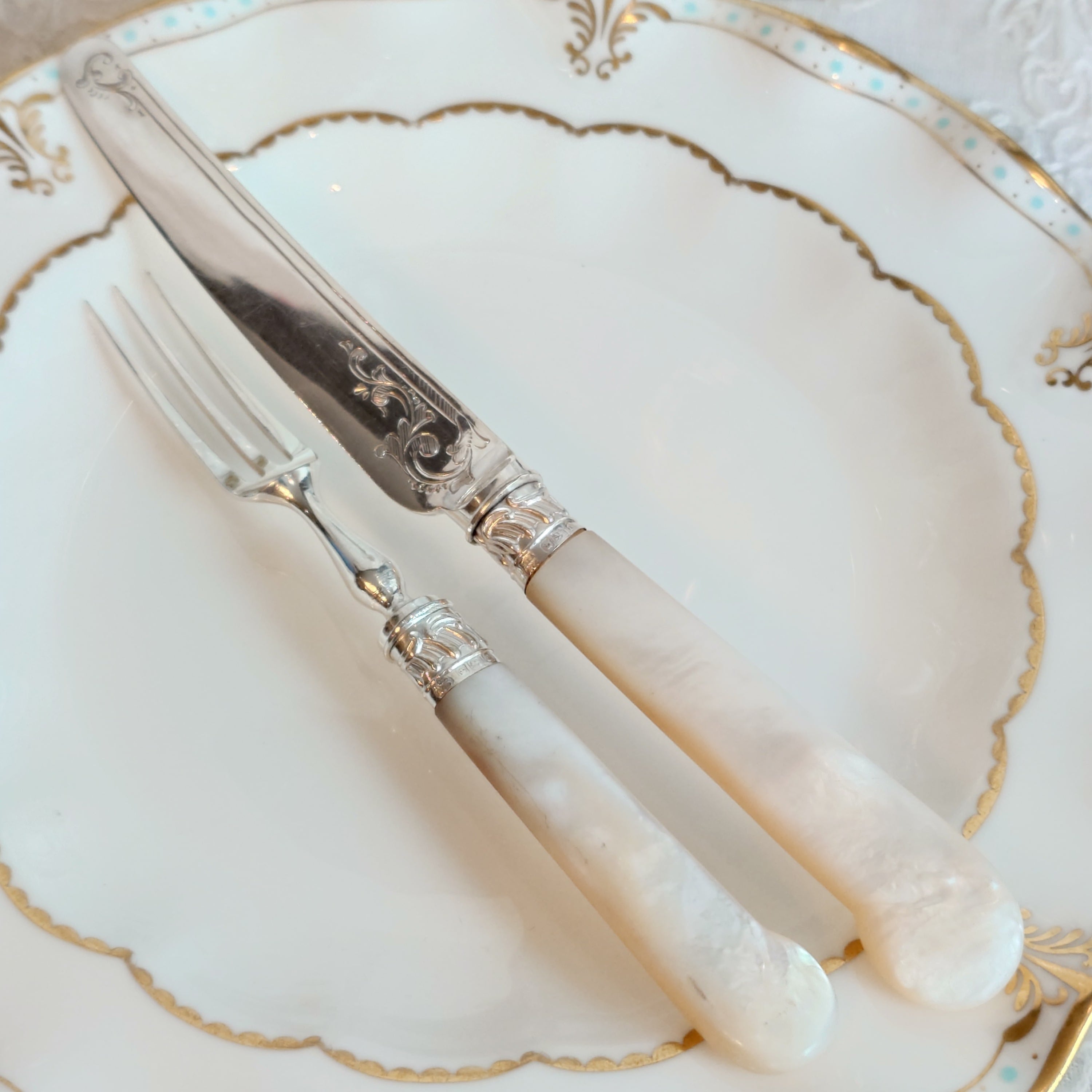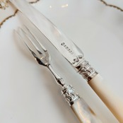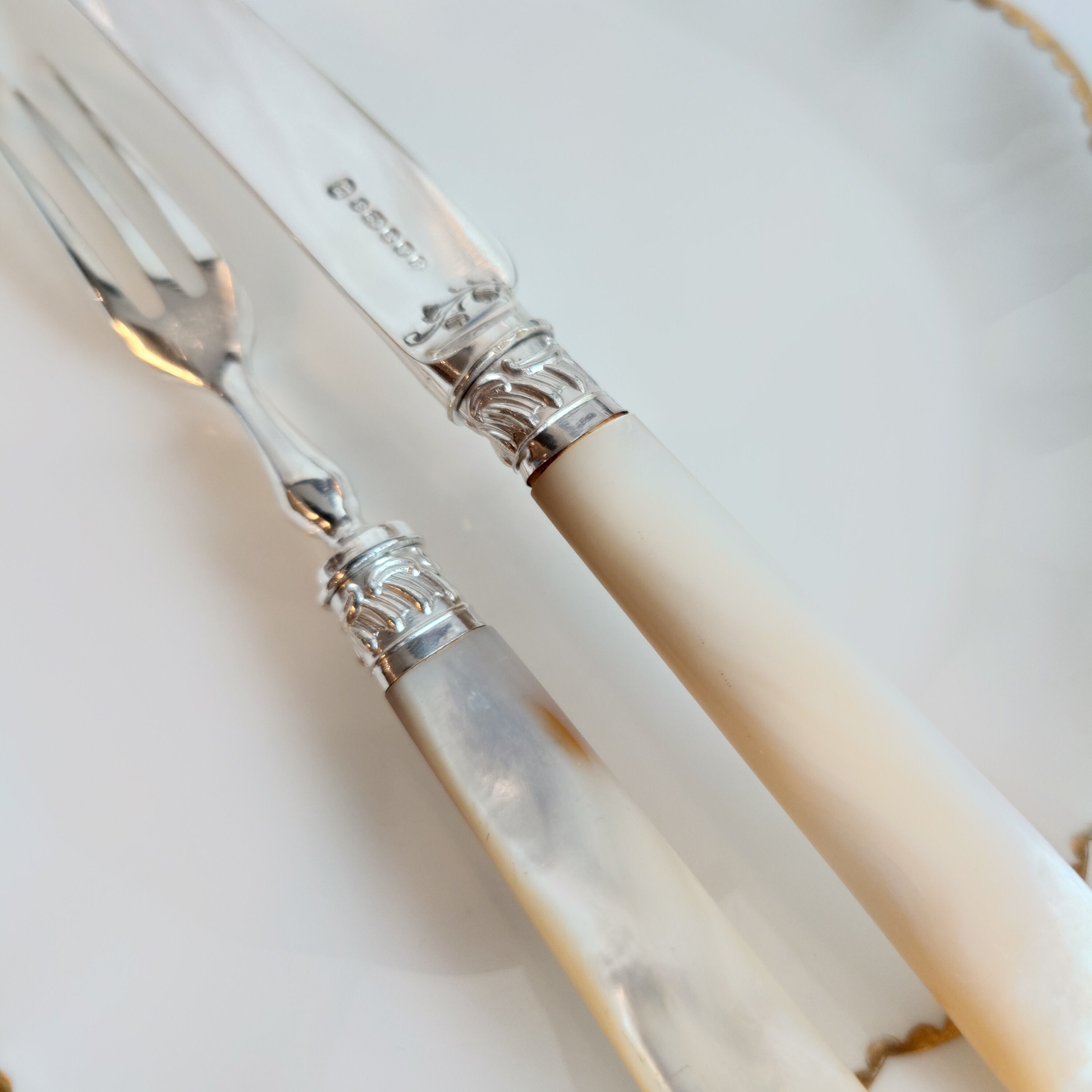 希少な白蝶貝はMOP (マザーオブパール) と略される白蝶貝の殻はボタンや工芸品の材料となり、カトラリーには、プラスチックが製品化される以前、1870-1890年頃にカトラリーのハンドル資材として用いられた物ですが、天然ゆえ劣化が起り、状態の良いお品は数少ない貴重なカトラリーです。