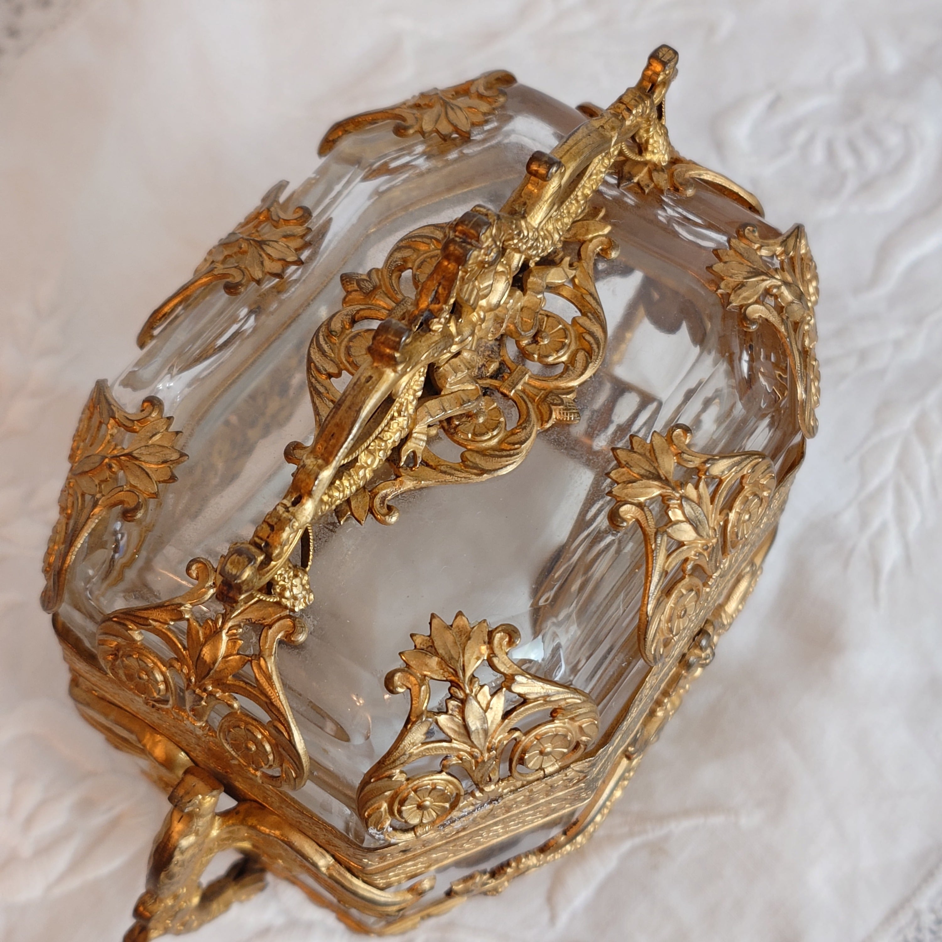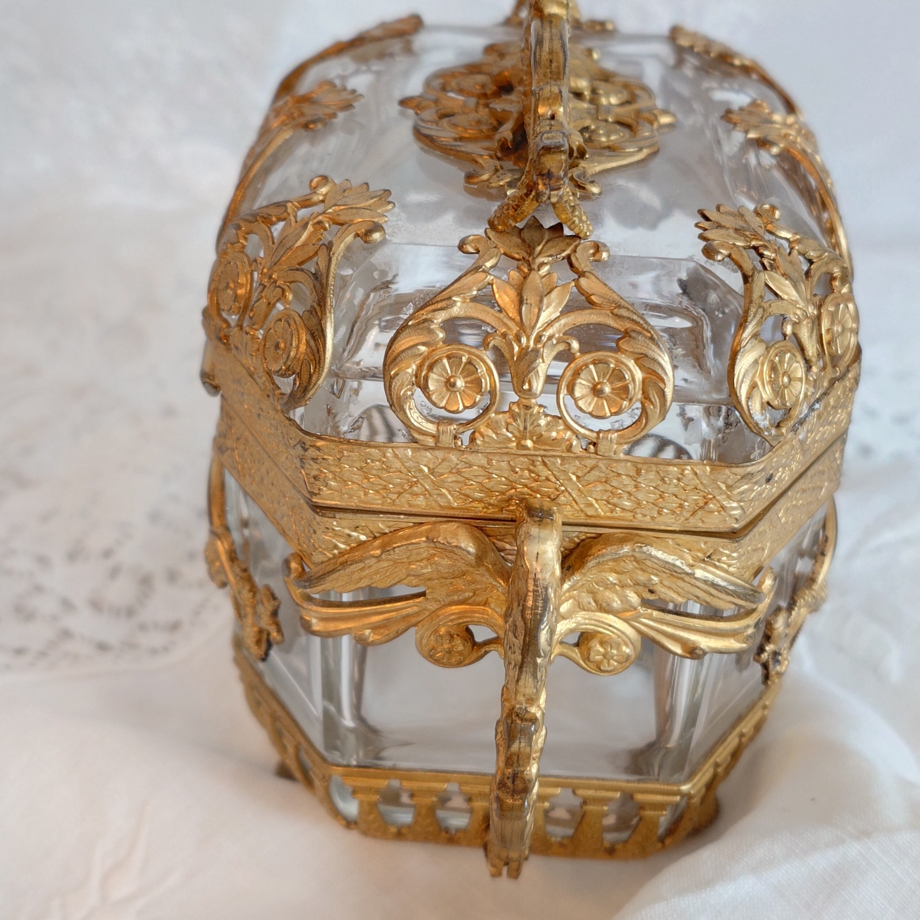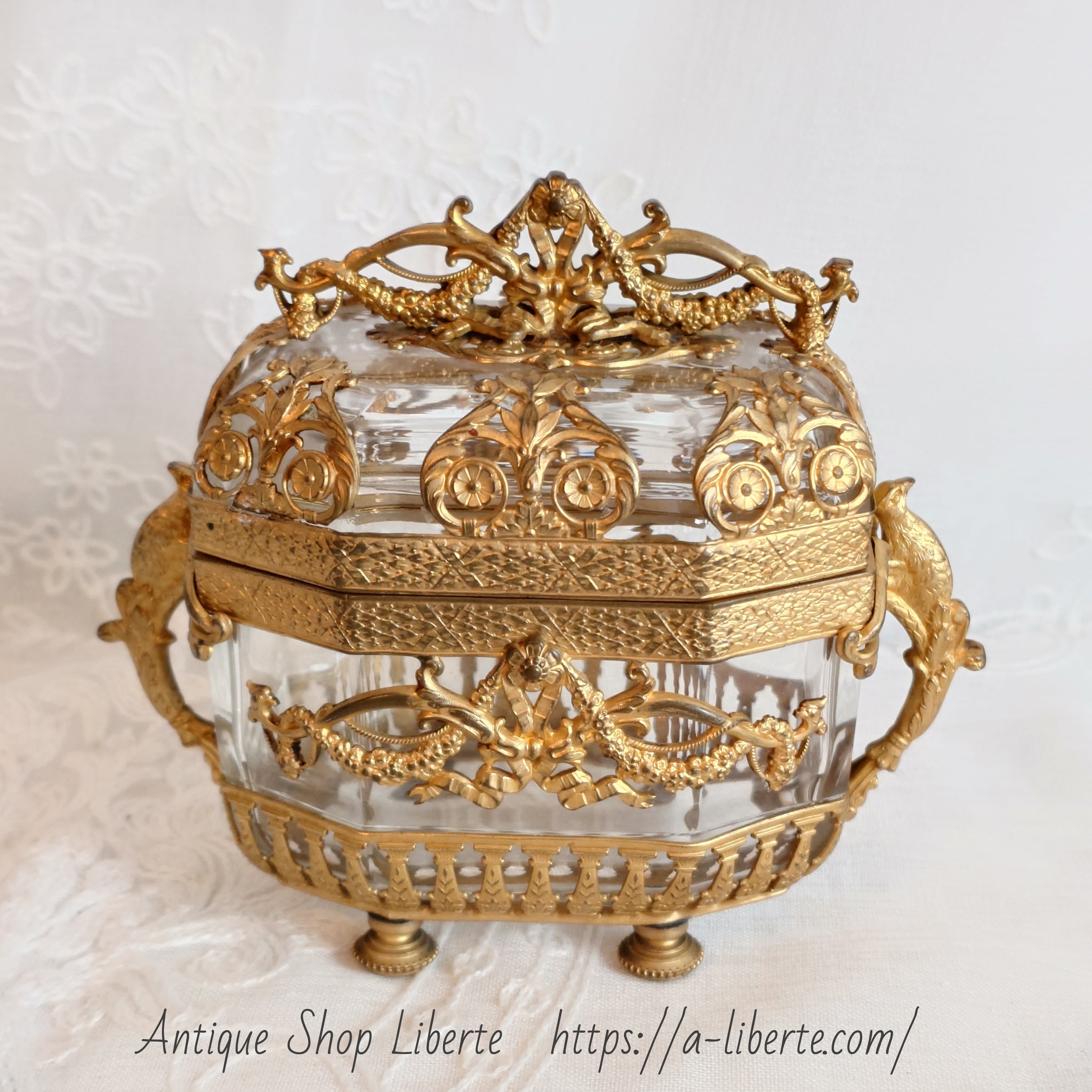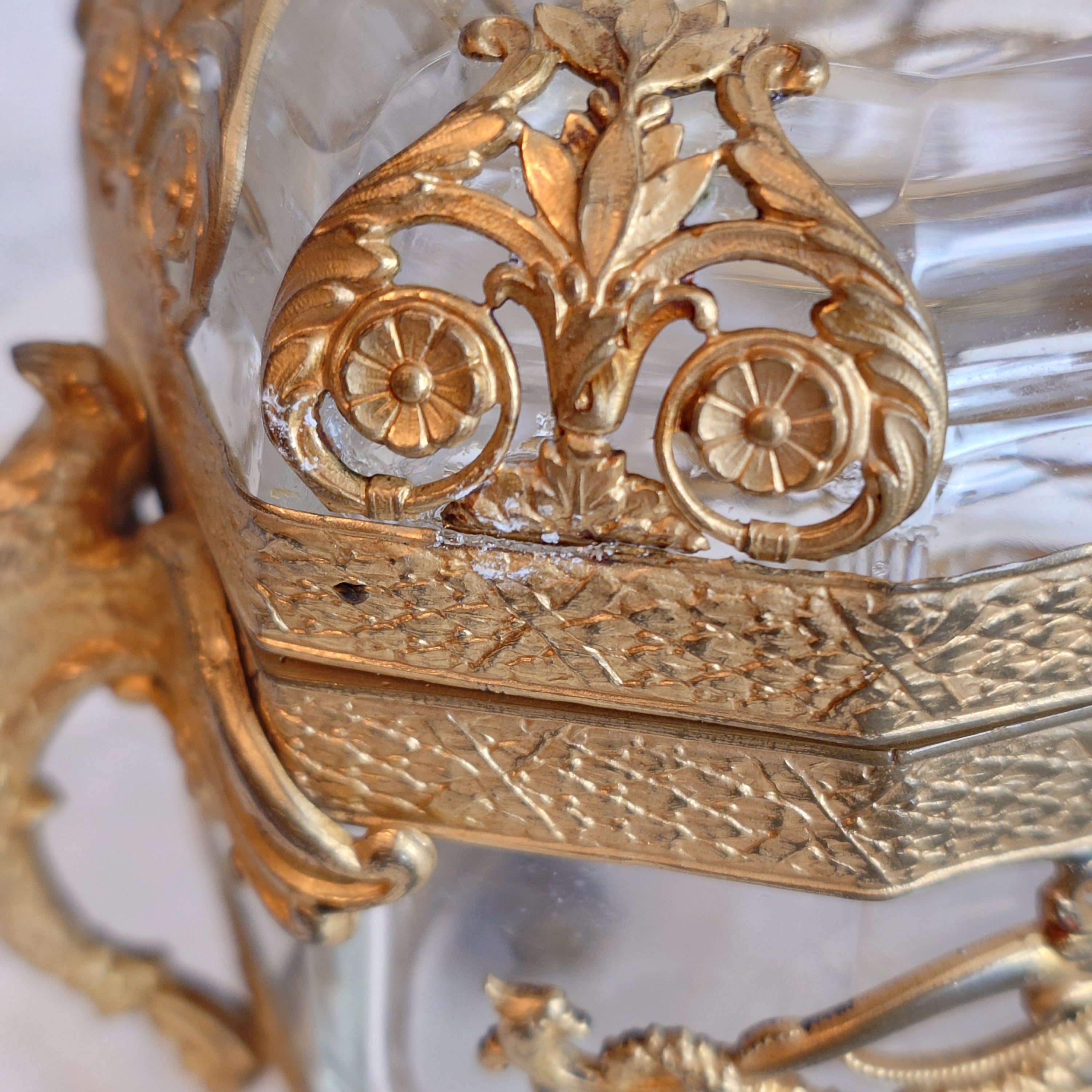 美しいオルモル装飾のフレームに包まれた、フランス製アンティークのジュエリーケースです。このお品はオルモル(Ormolu)と呼ばれる技術によって仕上げられており、金メッキの美しい光沢と、細やかな装飾が特徴となっています。