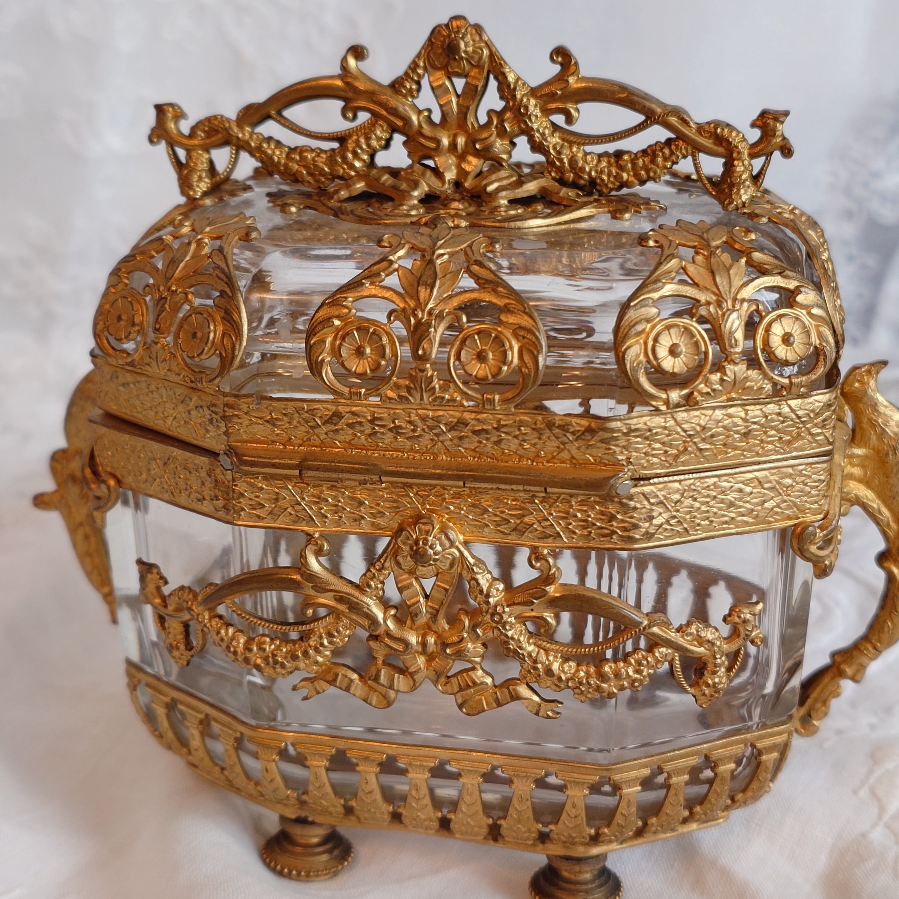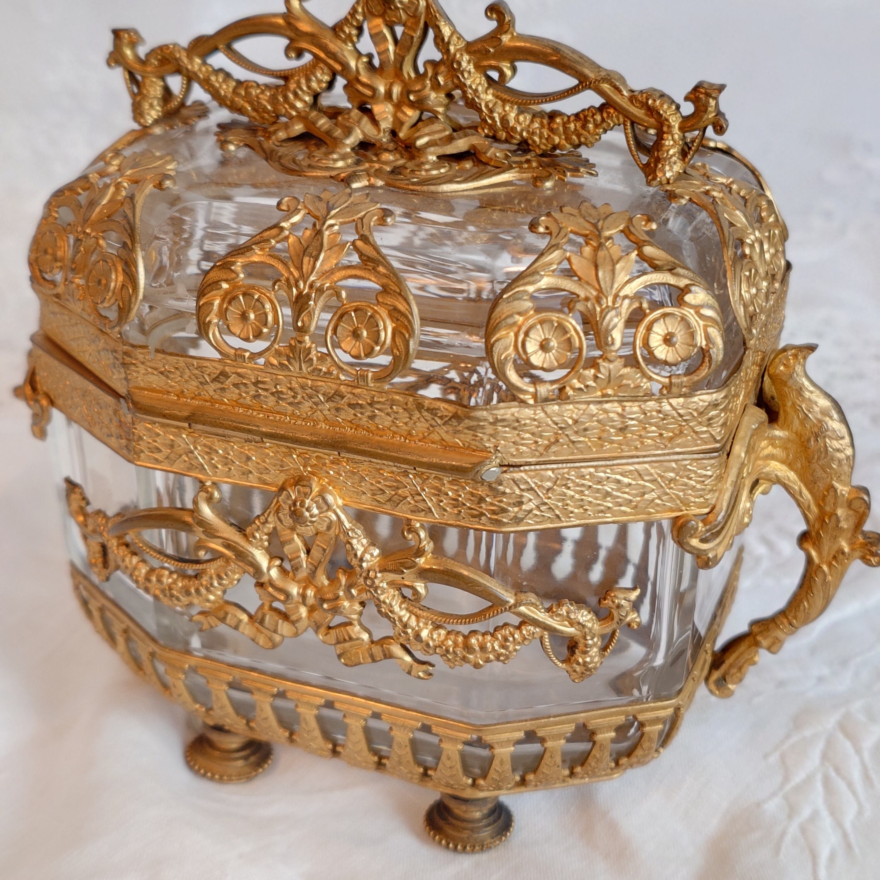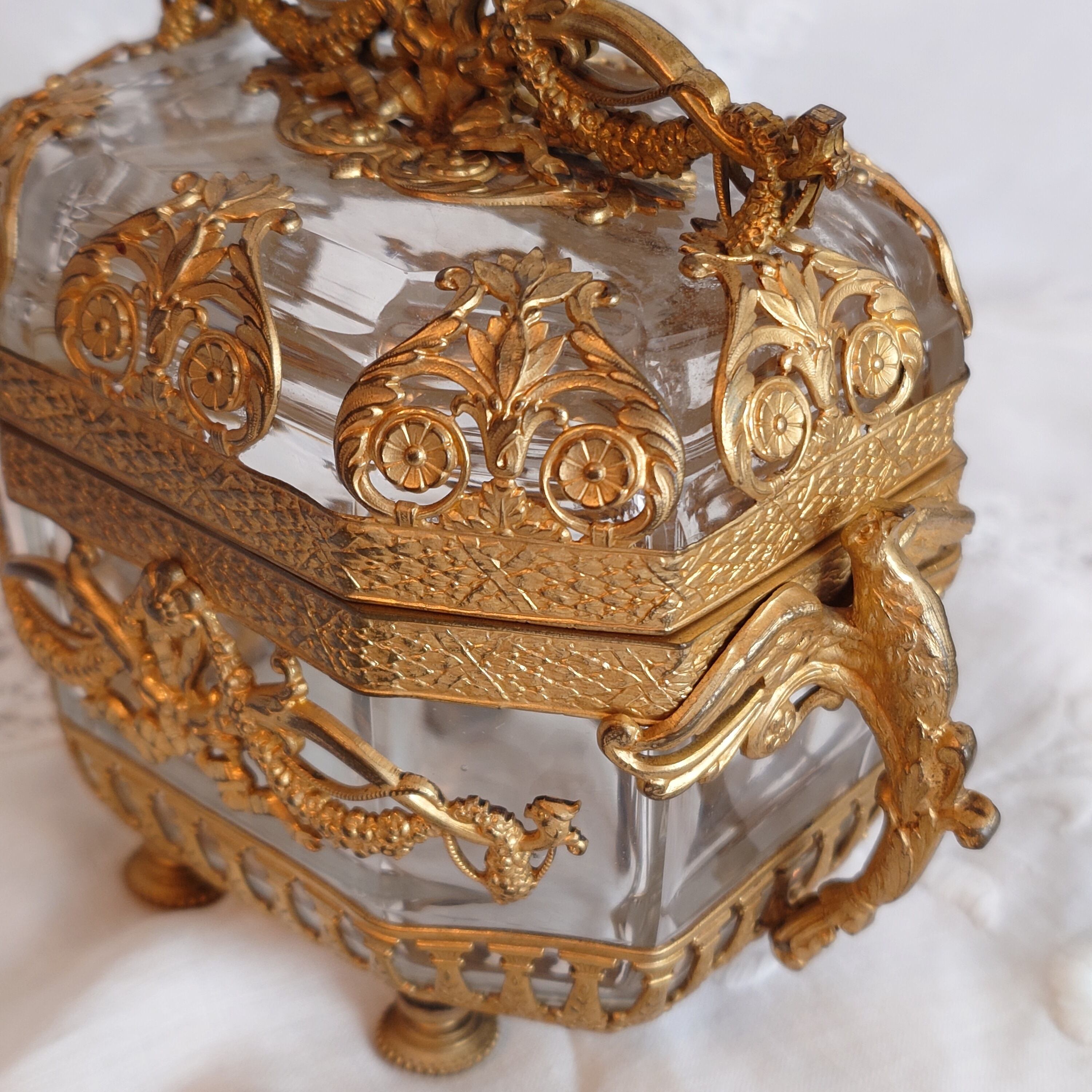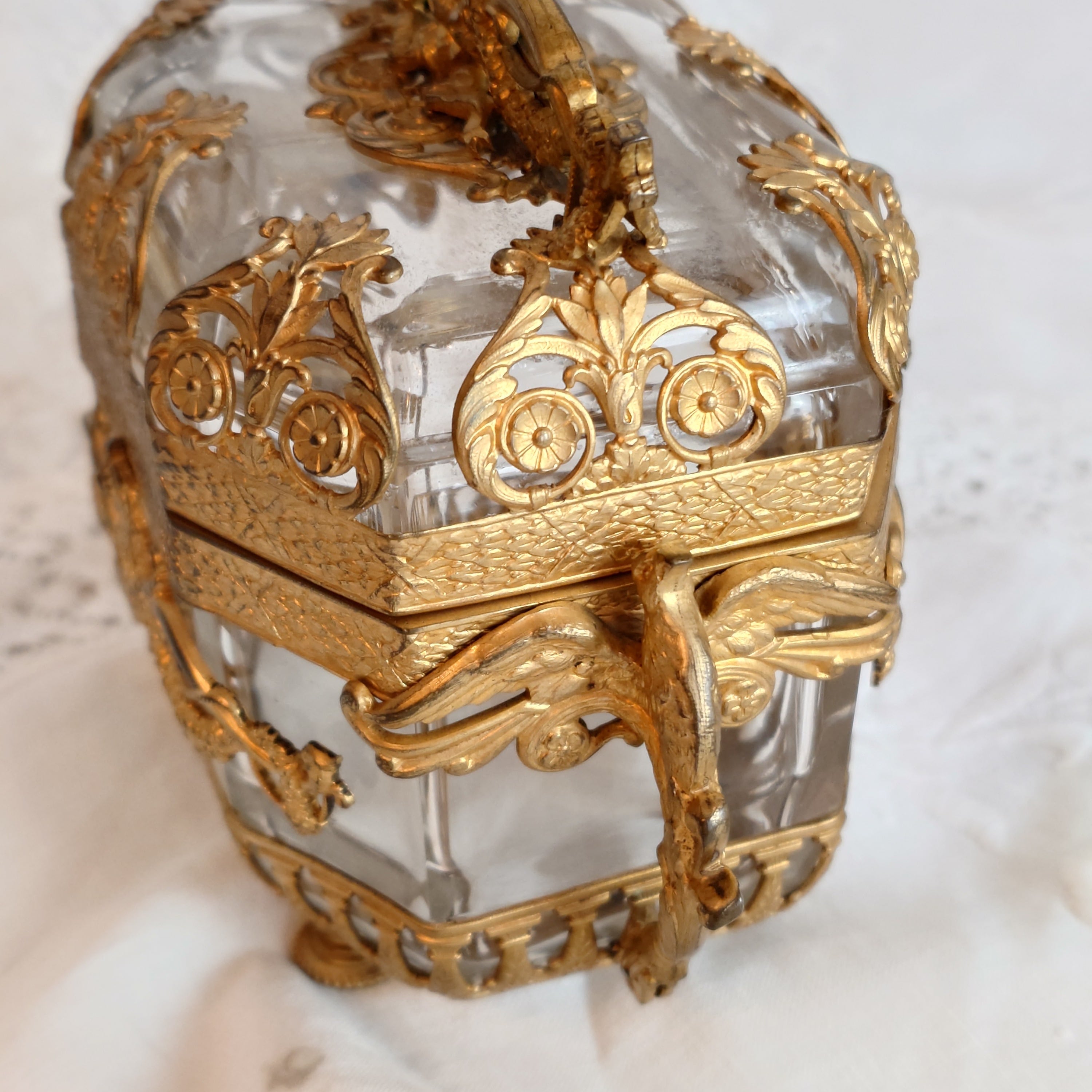 美しいオルモル装飾のフレームに包まれた、フランス製アンティークのジュエリーケースです。このお品はオルモル(Ormolu)と呼ばれる技術によって仕上げられており、金メッキの美しい光沢と、細やかな装飾が特徴となっています。