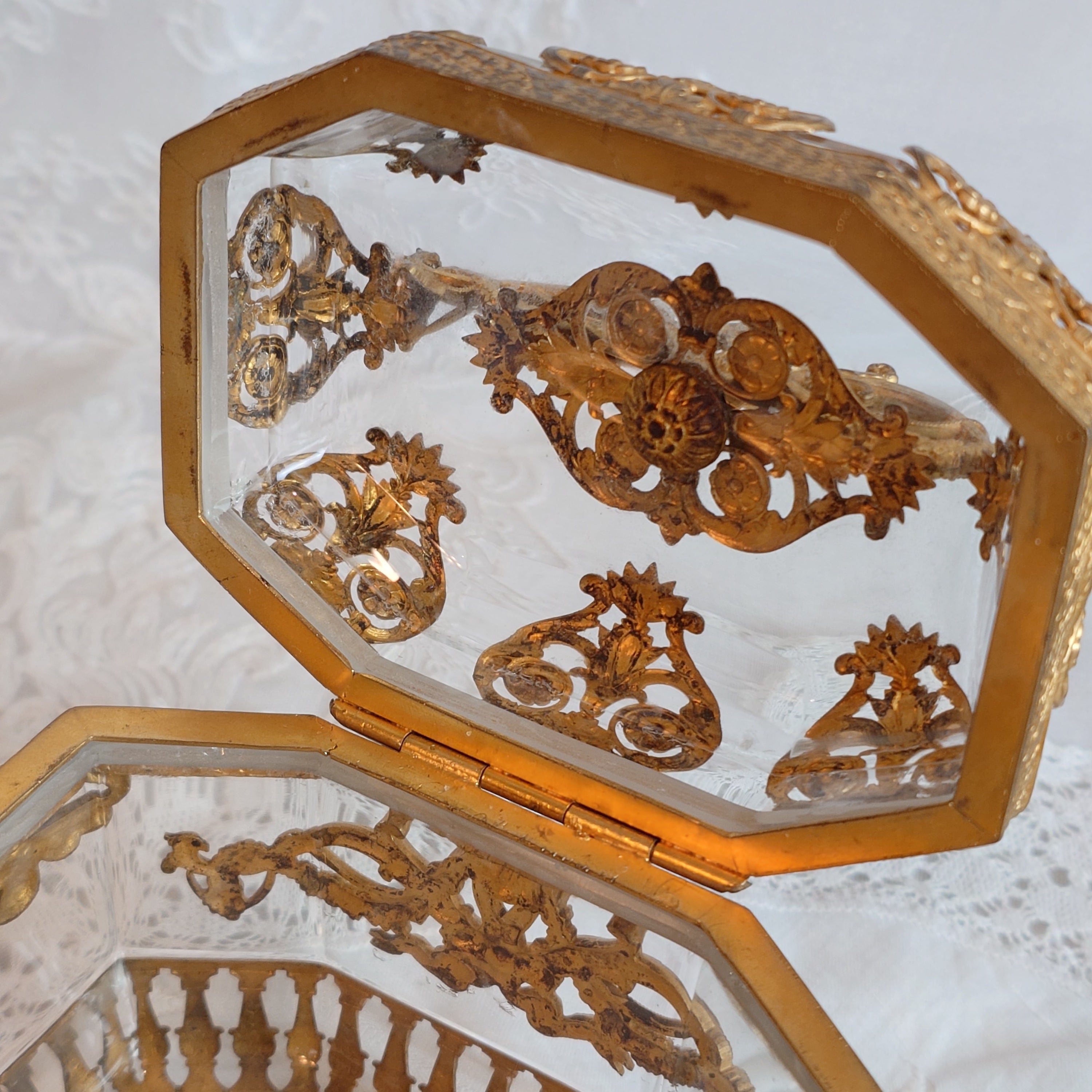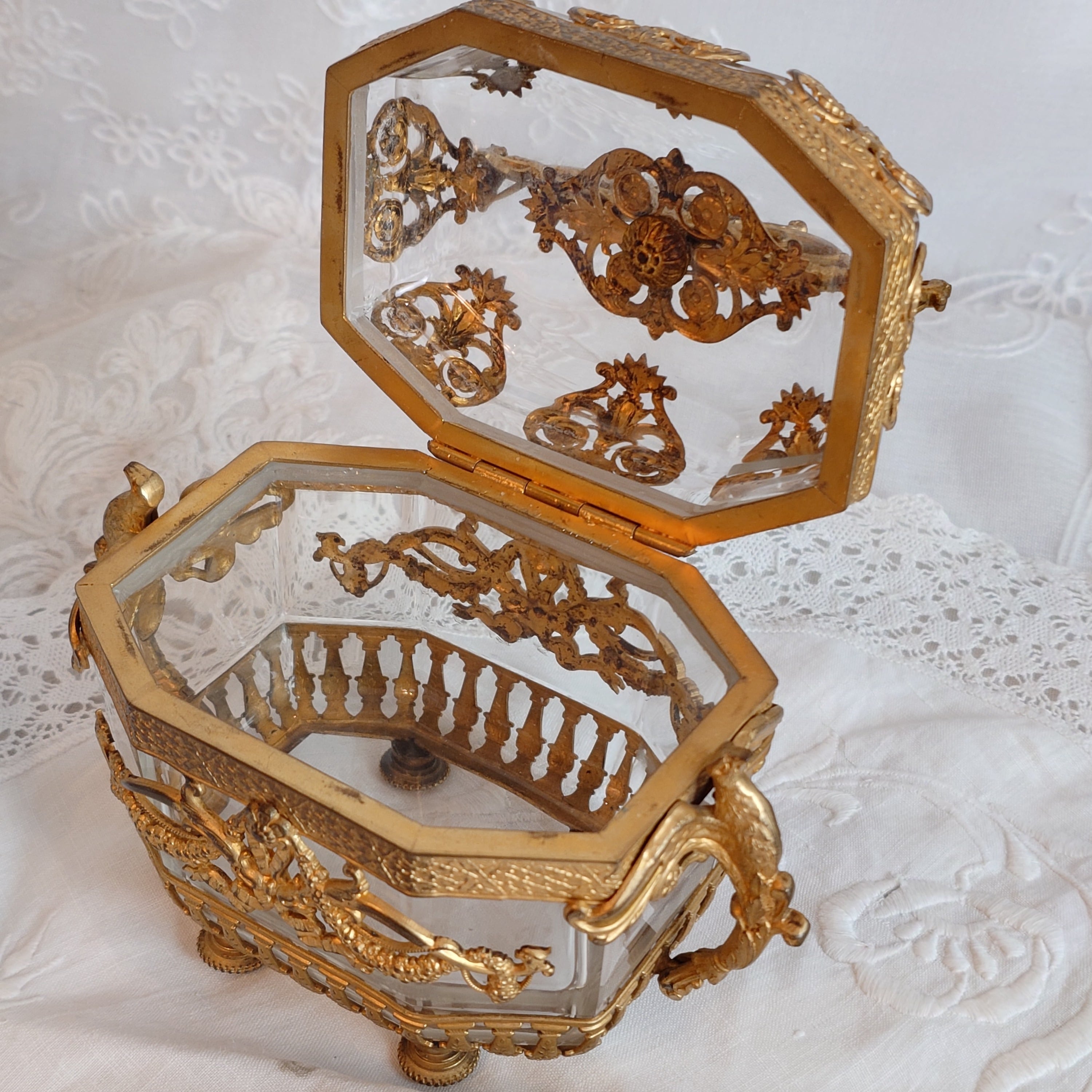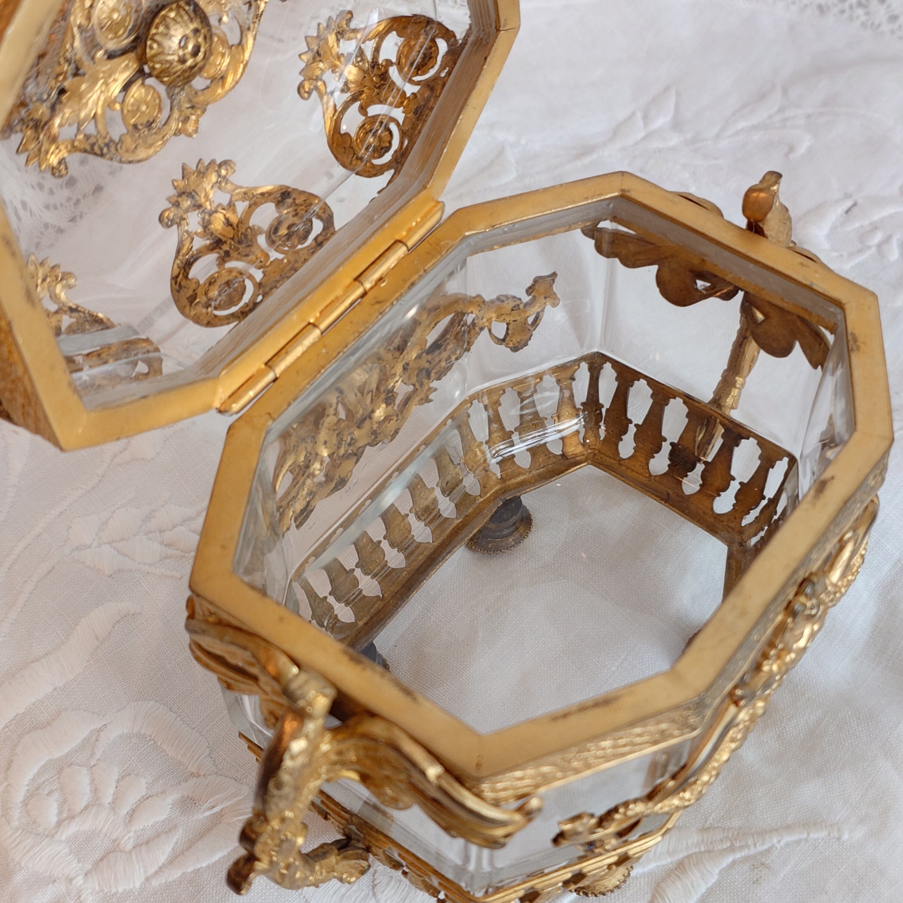 アンティークのお品になりますので、細かなスレや金属の黒ずみ等が見られますが、むしろ、このジュエリーケースの歴史を物語っております。