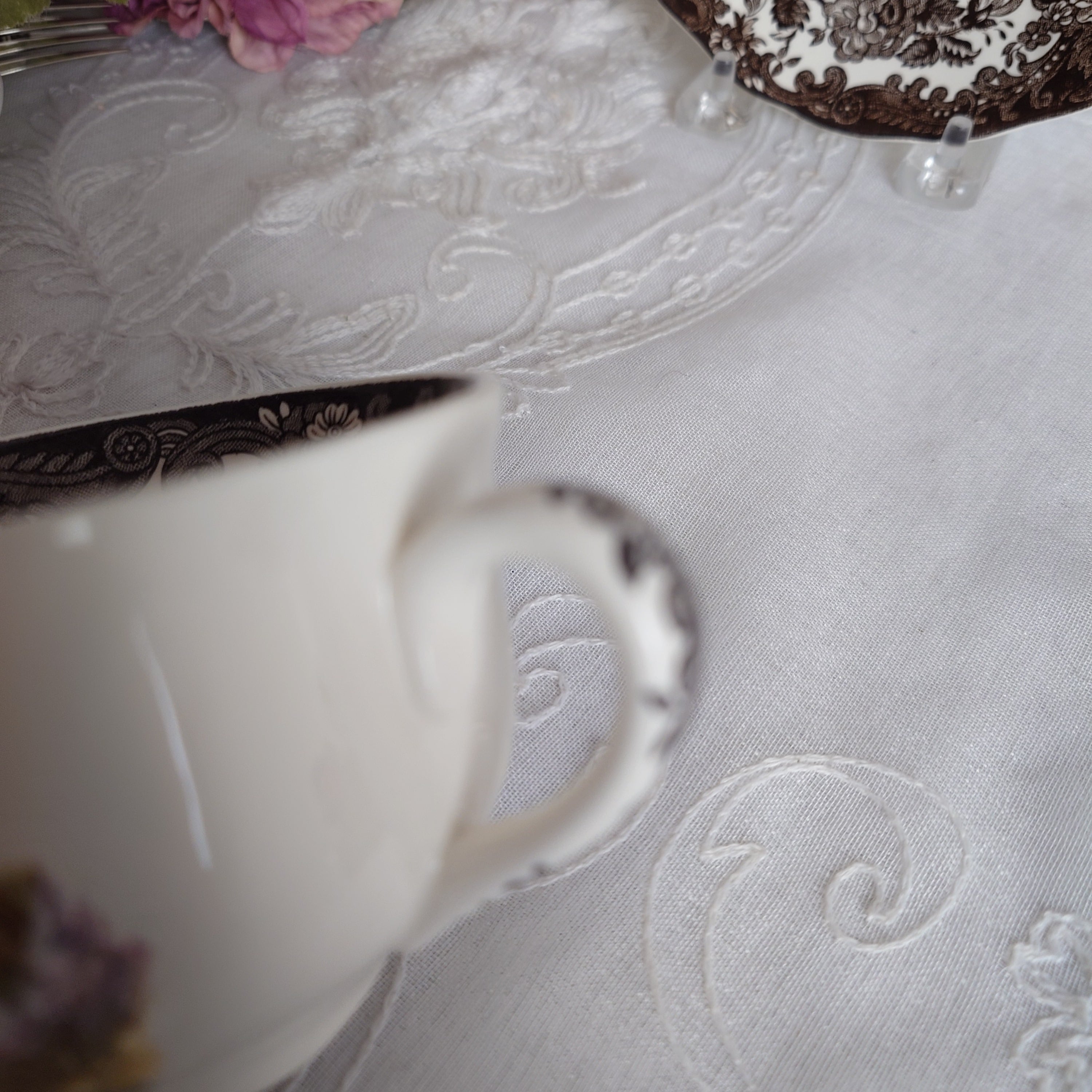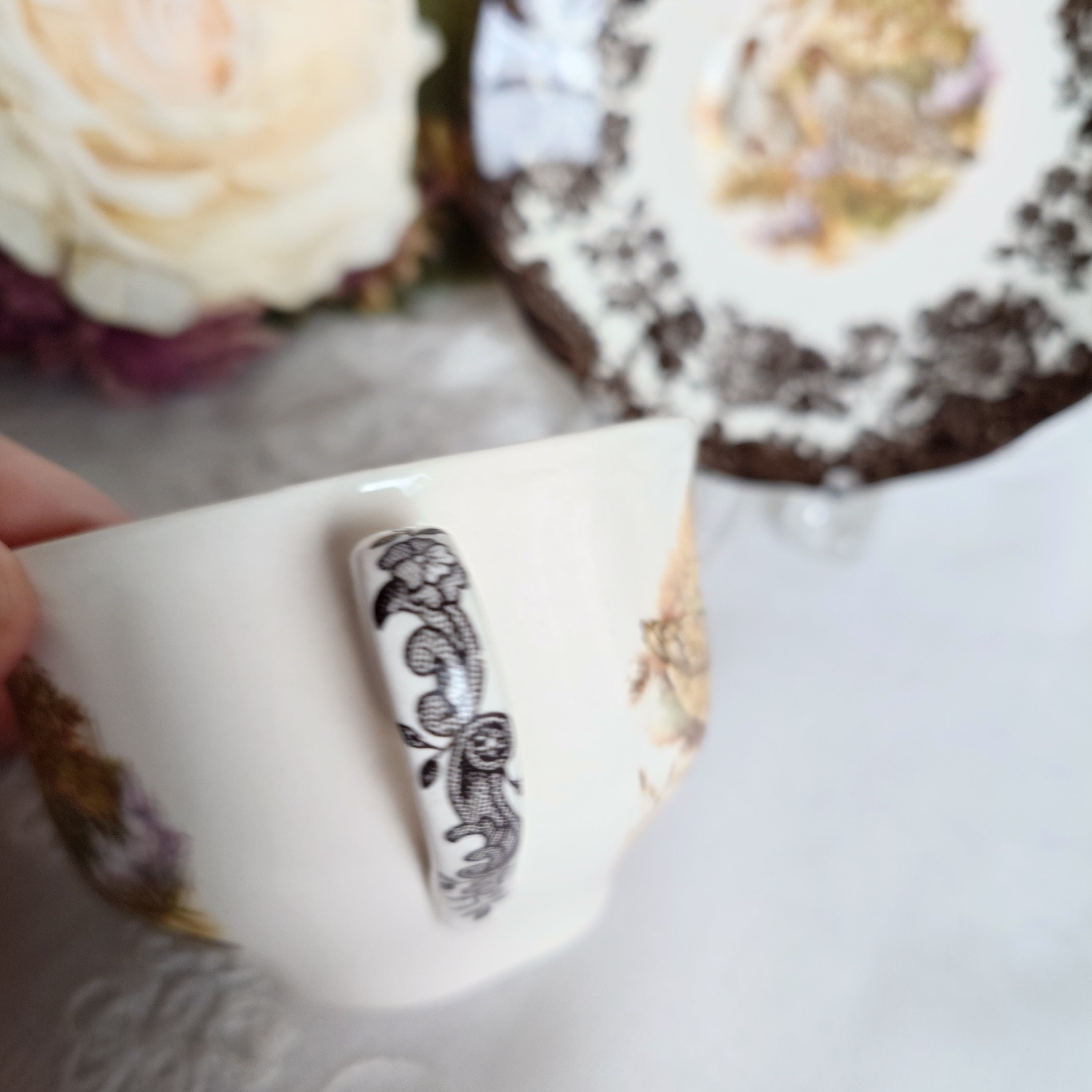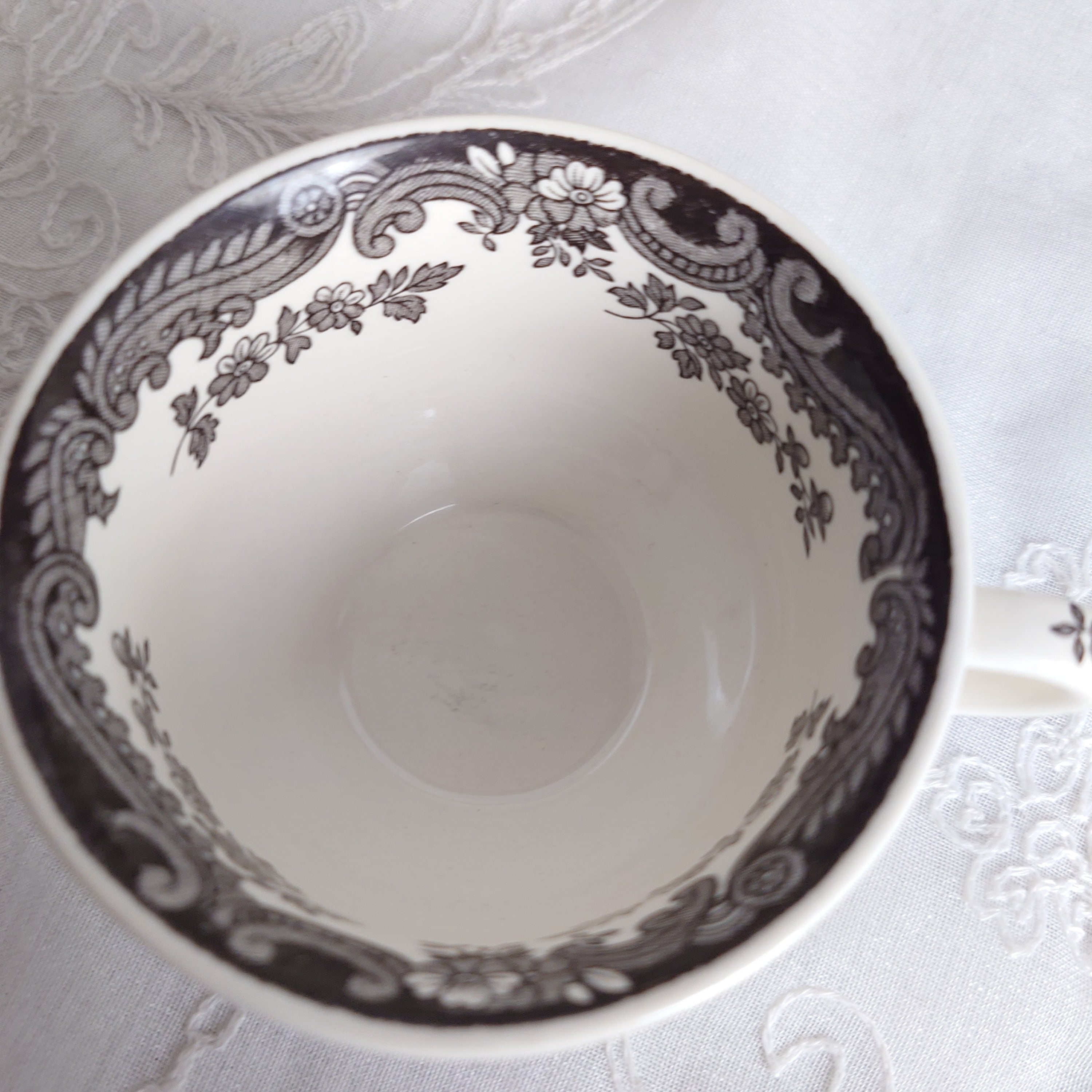 ソーサーとカップ内側の縁にはシックな黒に近い濃ブラウンの花模様が施されており、クラシックで落ち着いた英国らしいデザインが魅力です。
