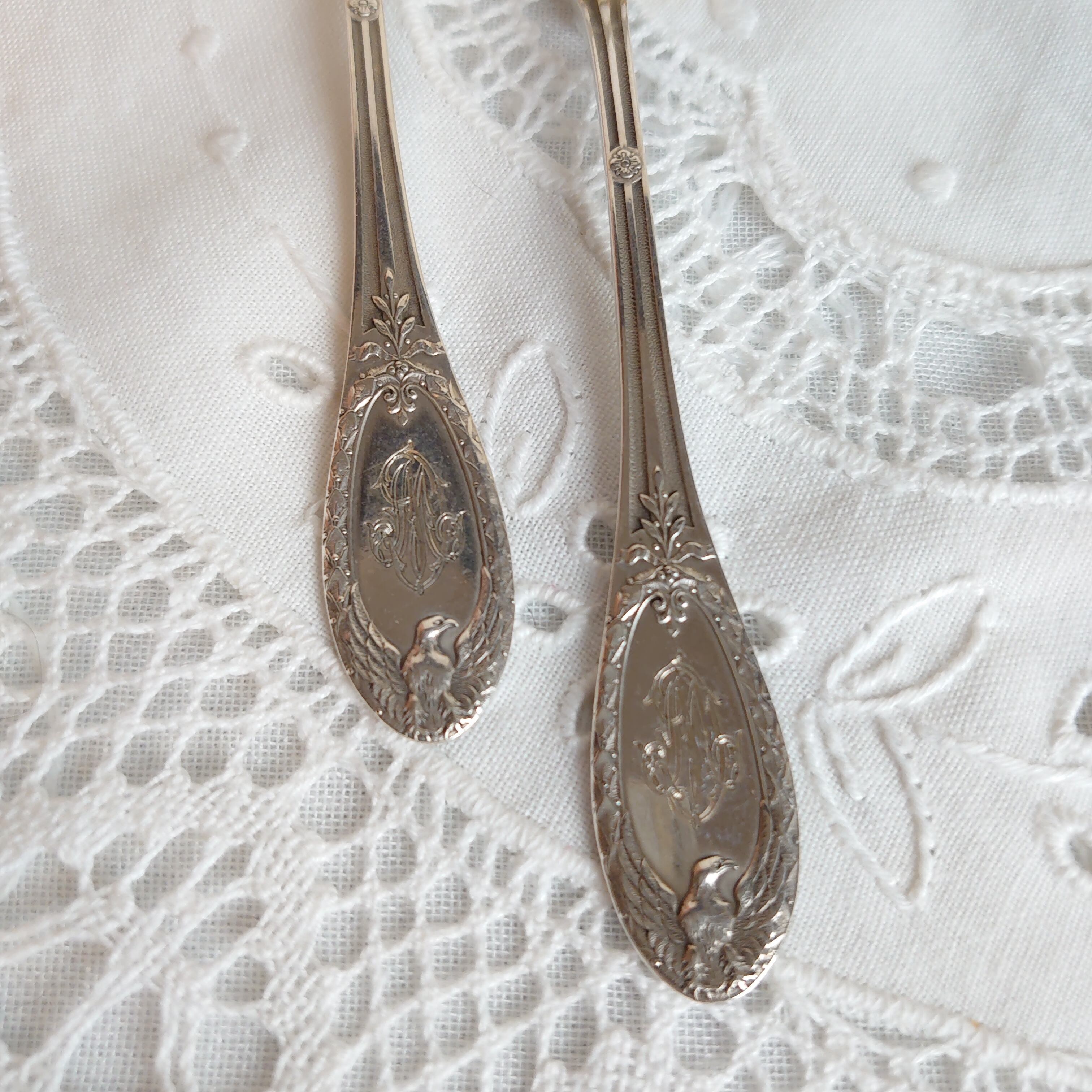 ハンドルに施されたモノグラムと鳥の羽ばたくモチーフがとても素敵なデザートカトラリーです