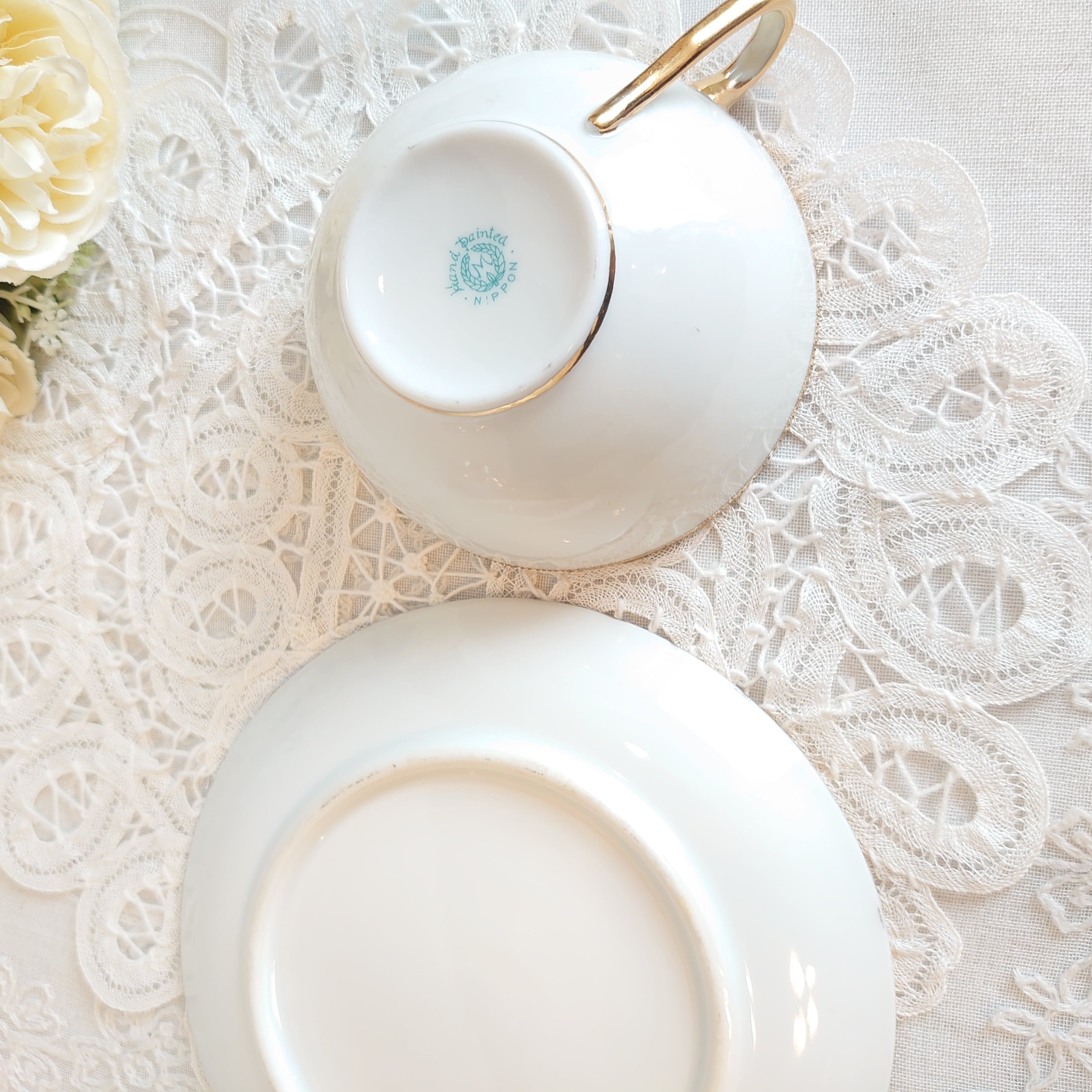 カップやソーサーの縁に金盛装飾と可憐なローズがリボン状に描かれておりとてもエレガントな絵図です