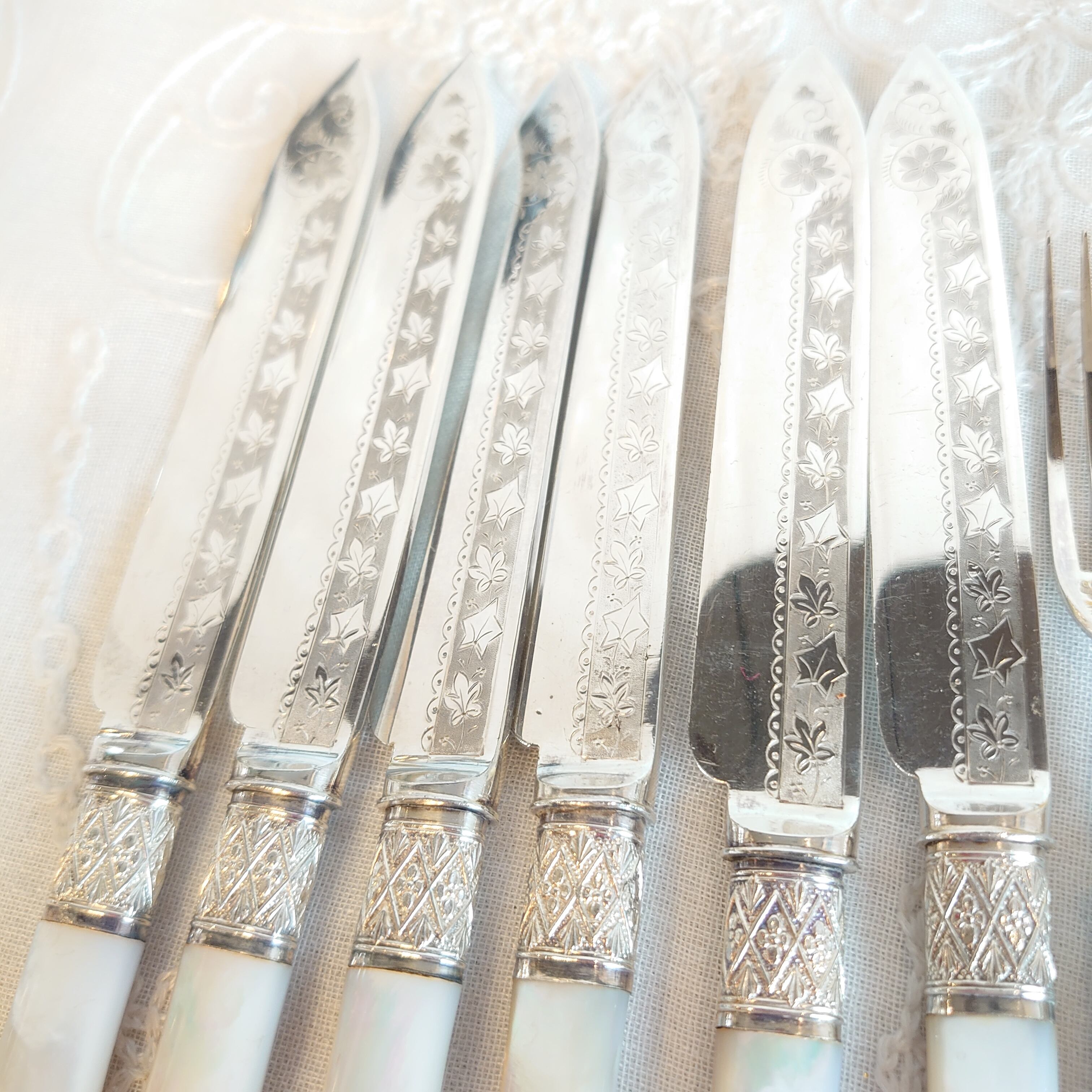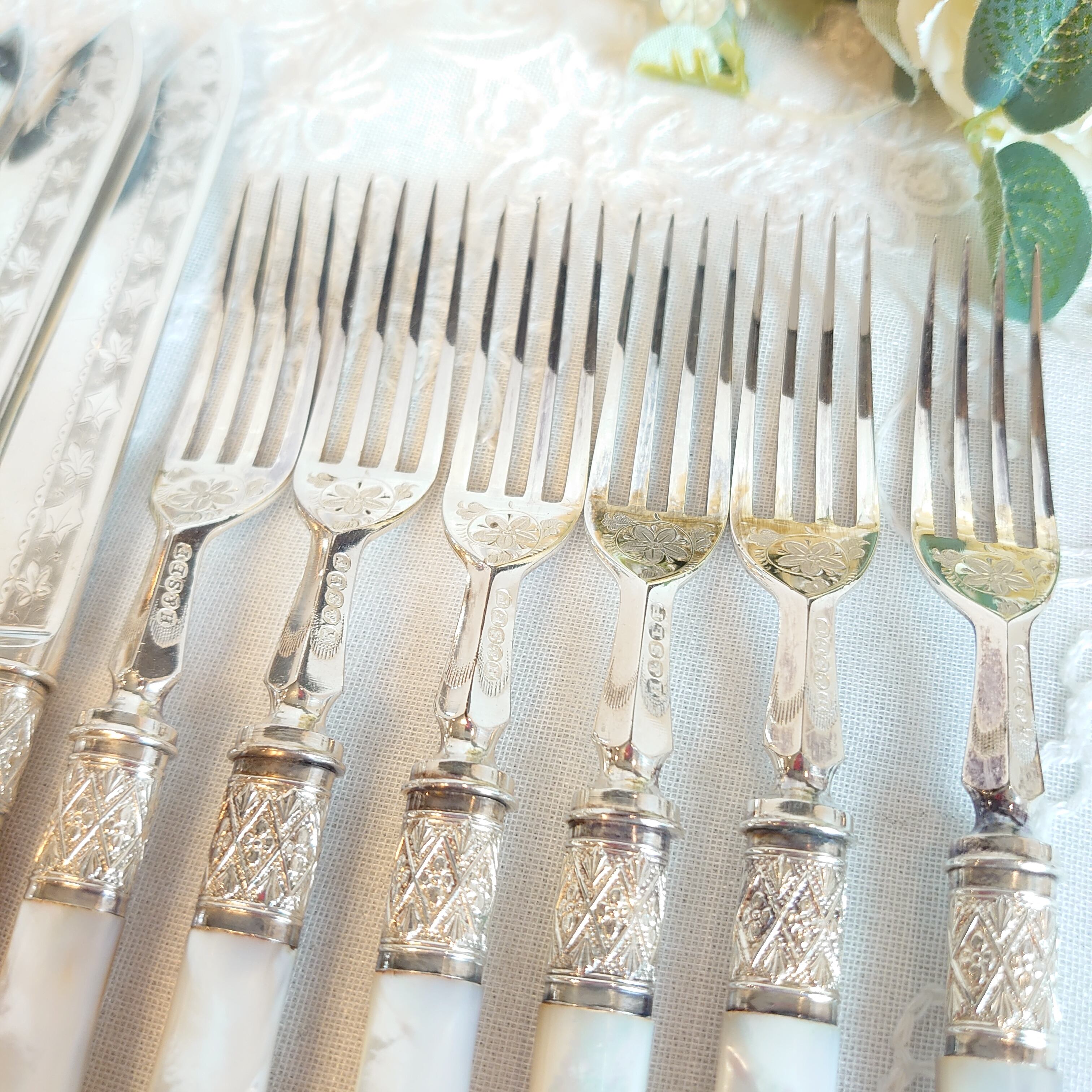 リーフとお花のモチーフがナイフ、フォークの刃先にエングレービングされており、持ち手の白蝶貝もスクロールがデザインされた大変美しいカトラリーセットです