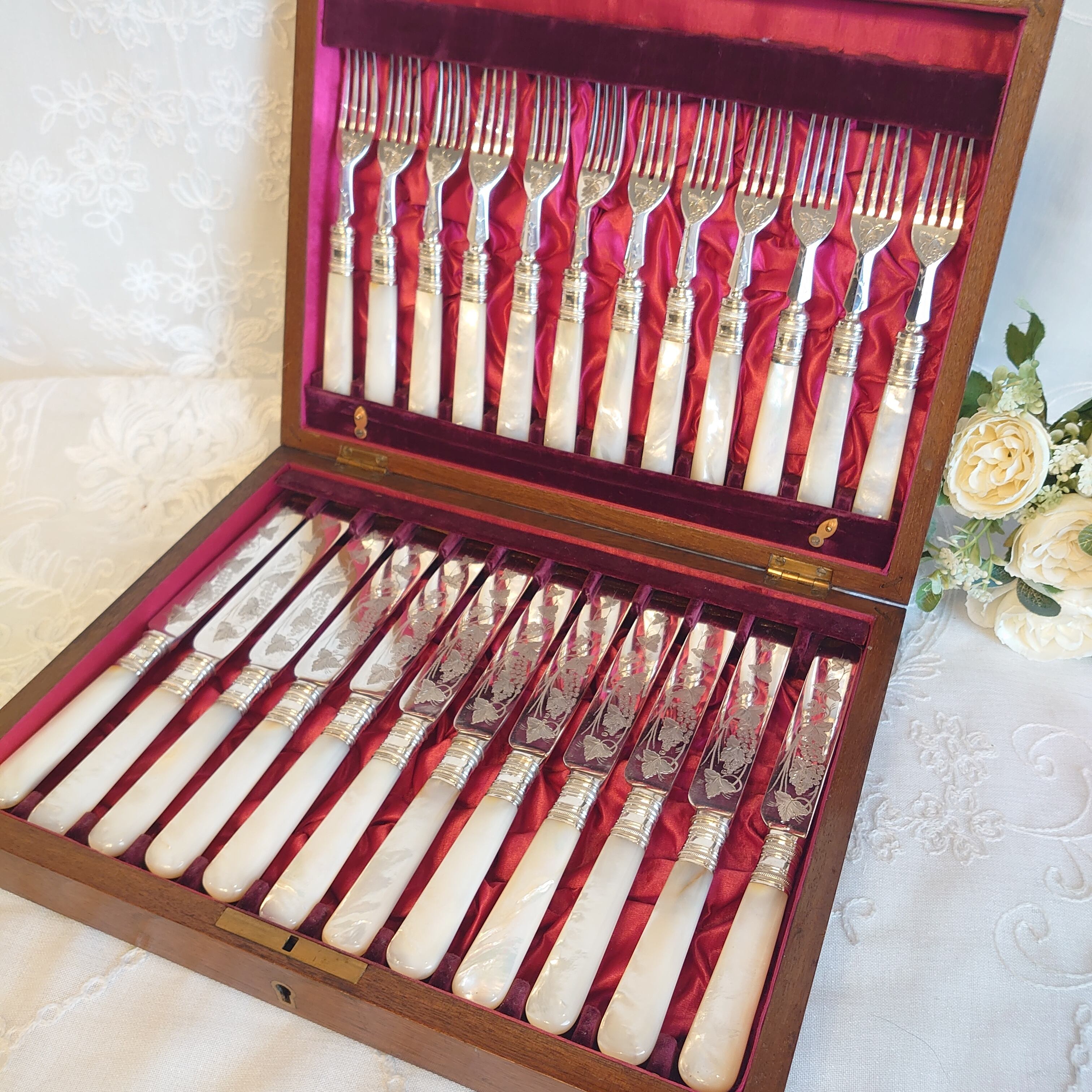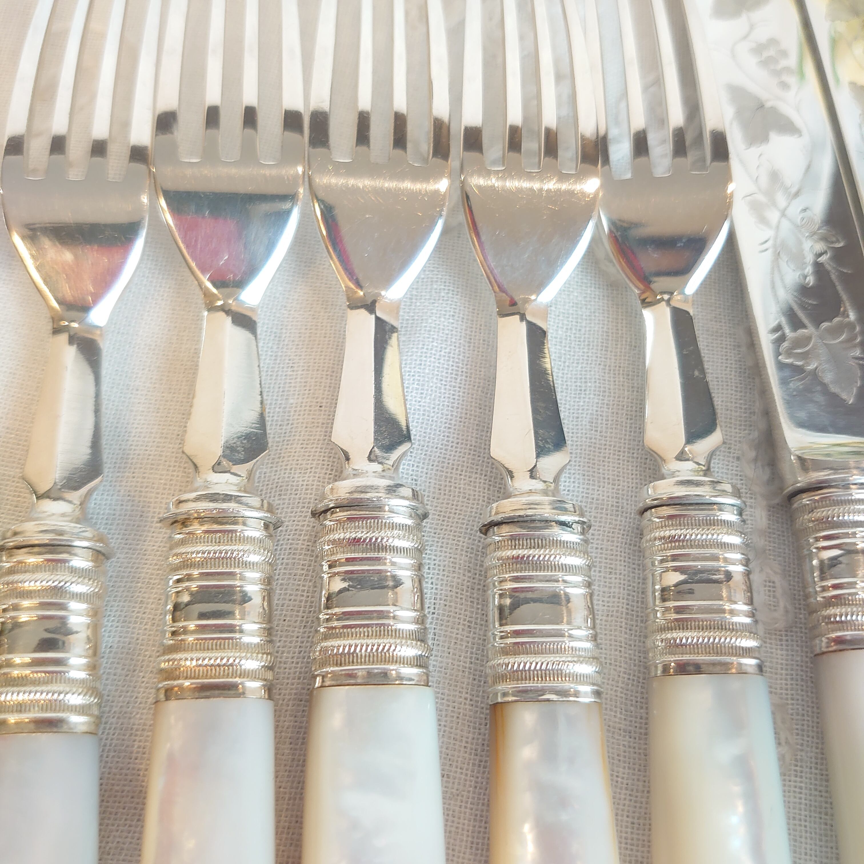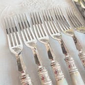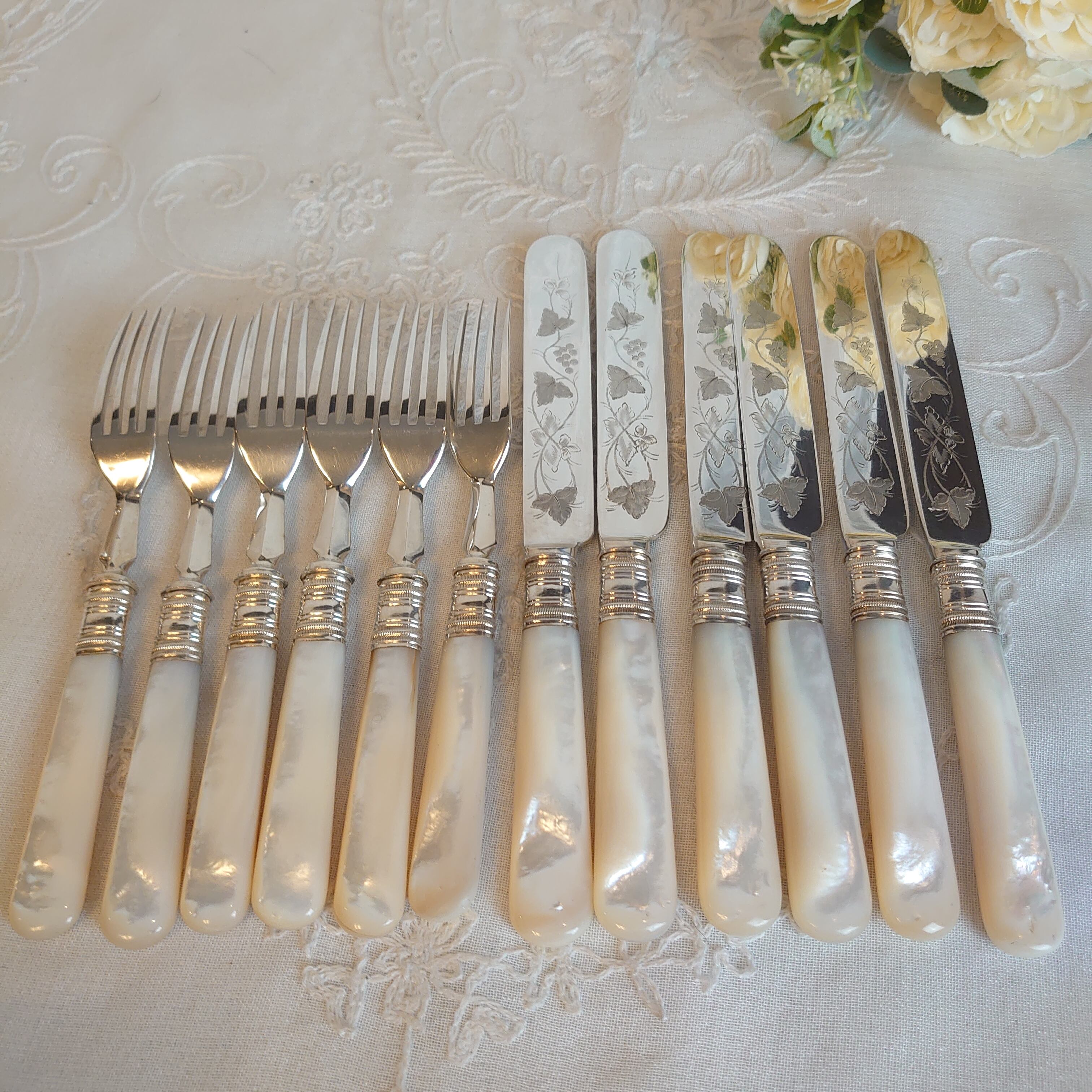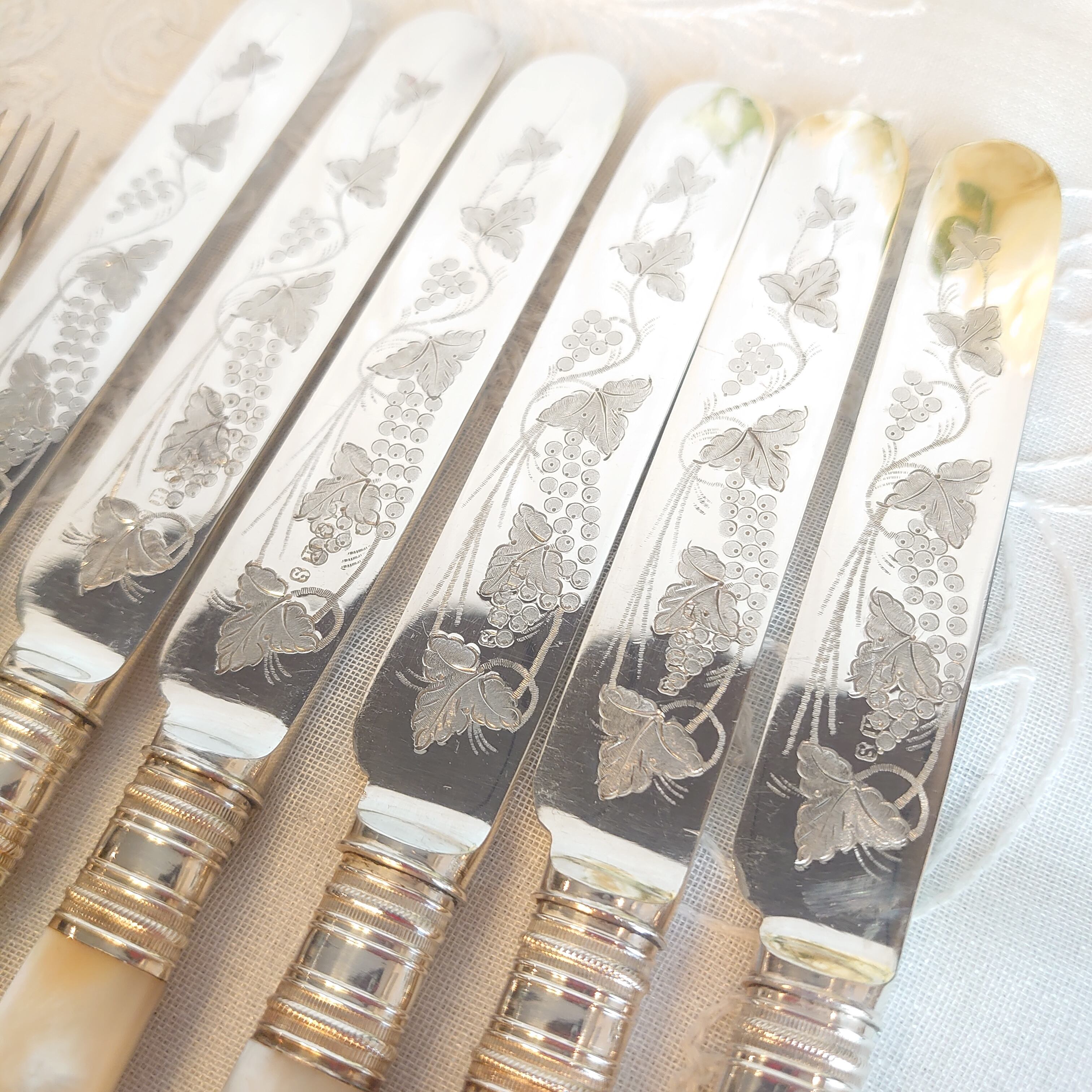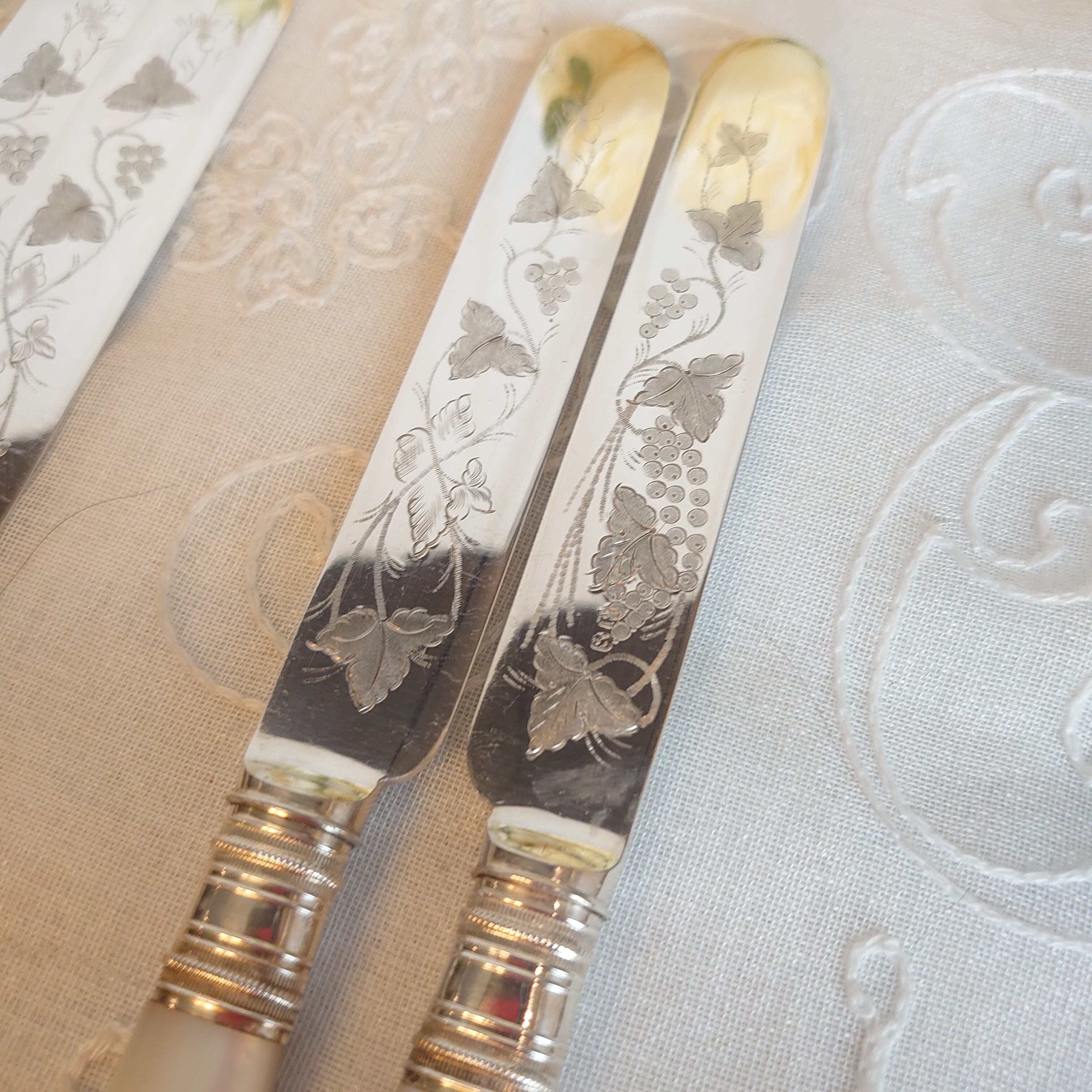 ブドウのモチーフがナイフ、フォークの刃先にエングレービングされており、持ち手の白蝶貝も艶のある光沢を放っており、大変美しいカトラリーセットです