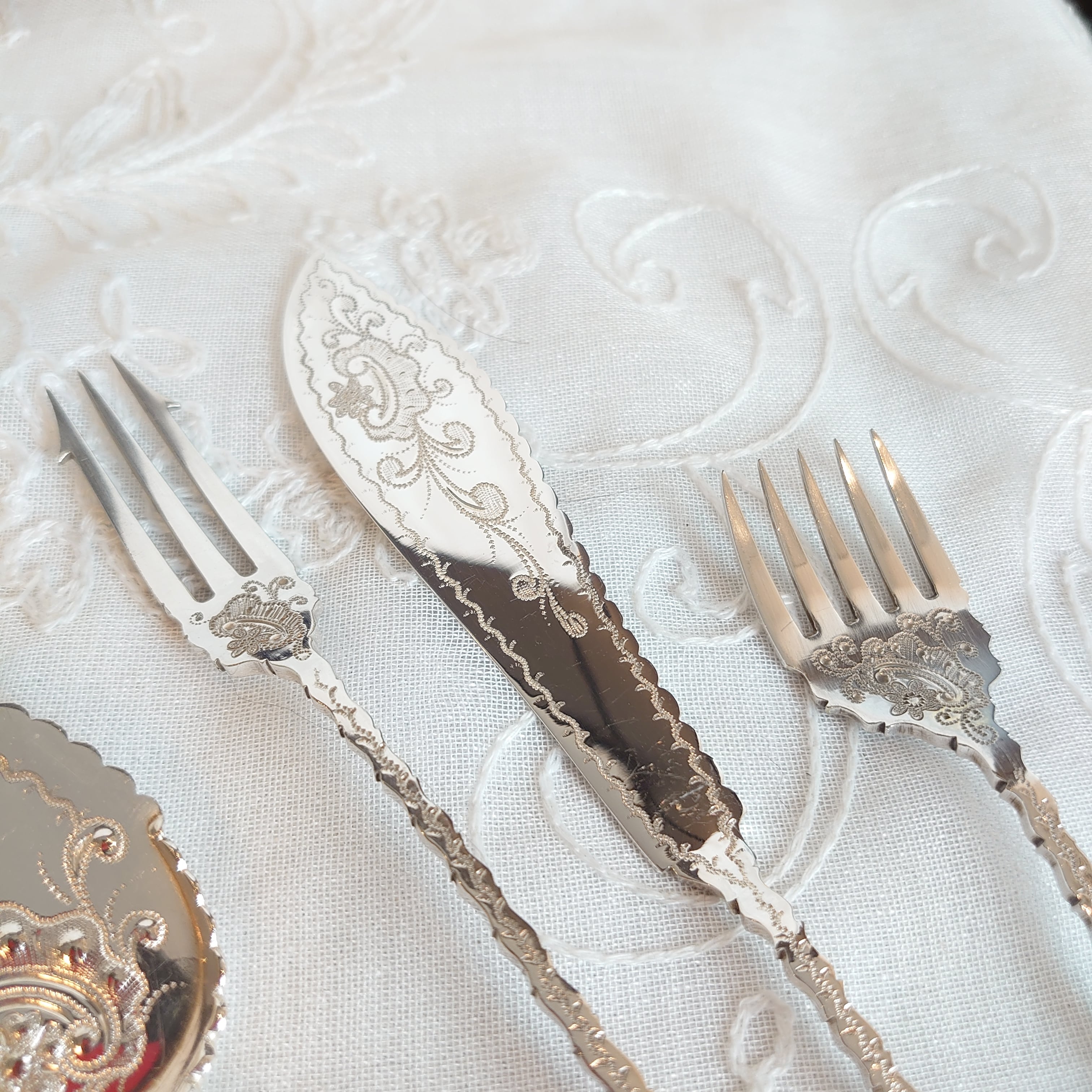 ブライトカットやエンボスなどの技法が施された見た目も美しいサービングカトラリーセットです