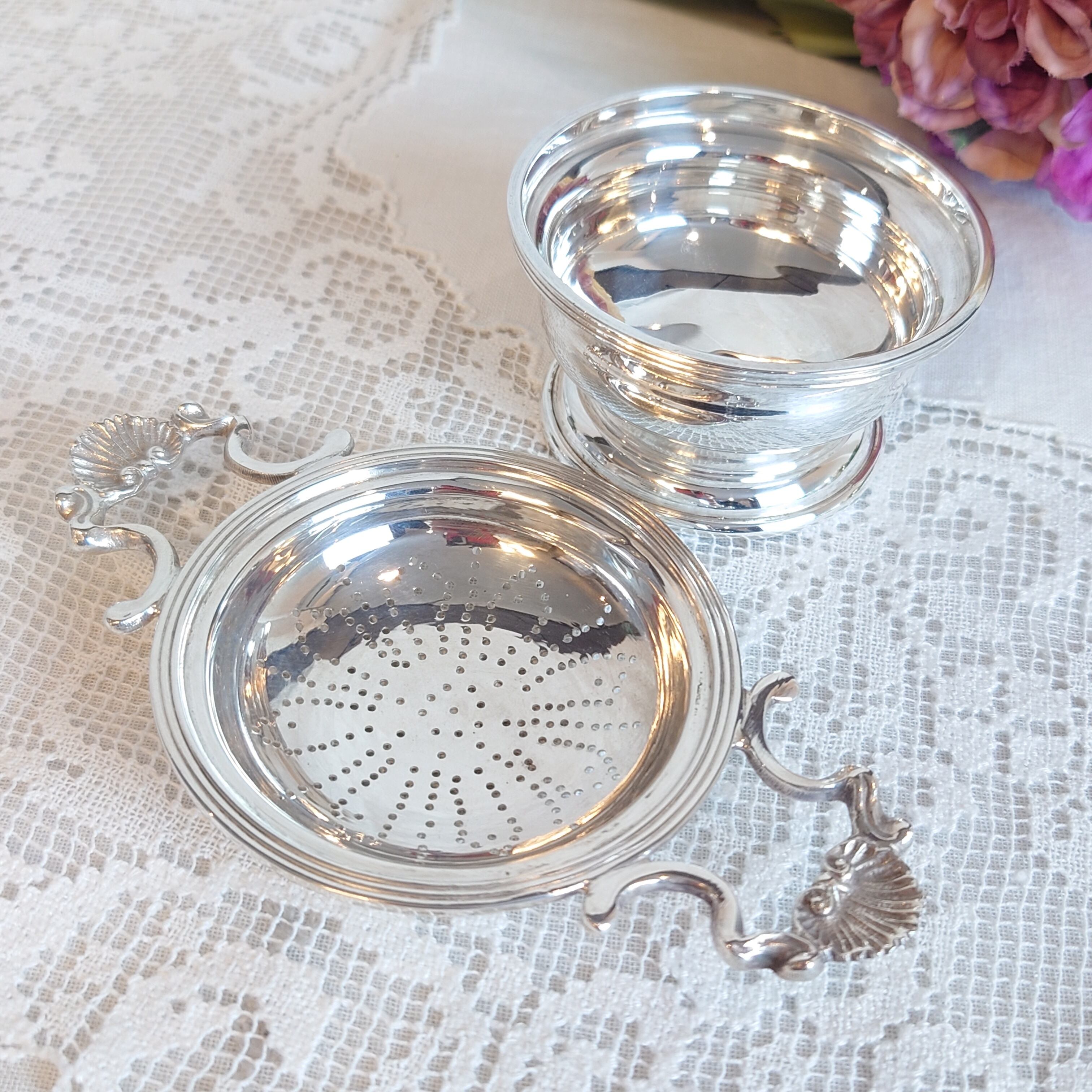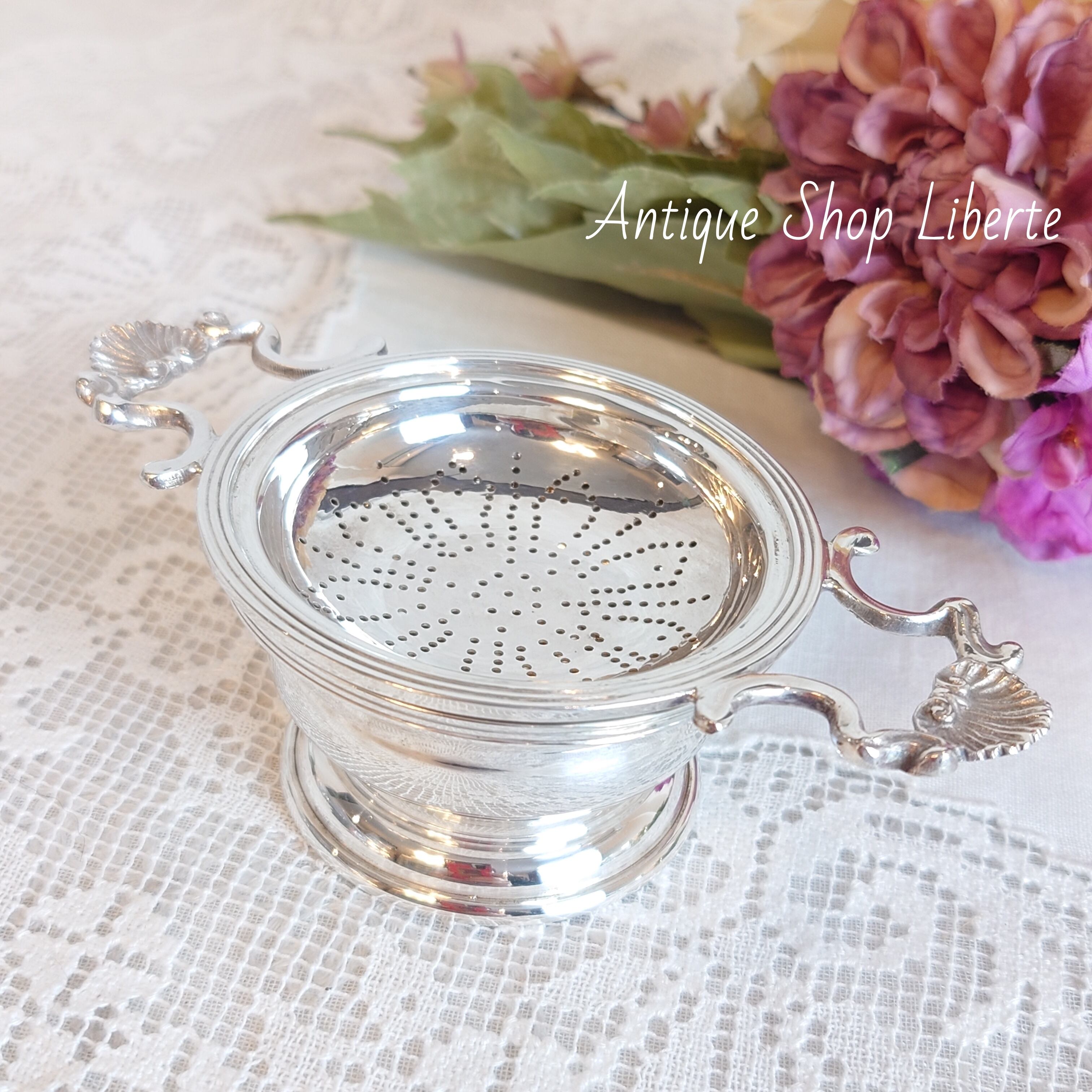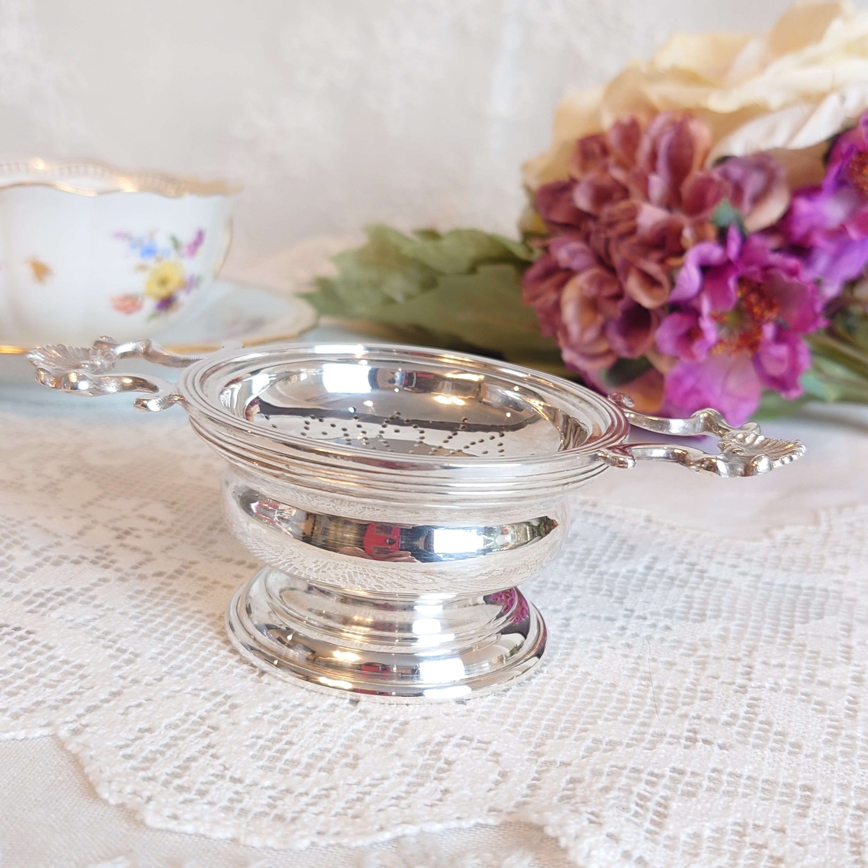 ティーストレーナー シルバープレート Wハンドル受皿付