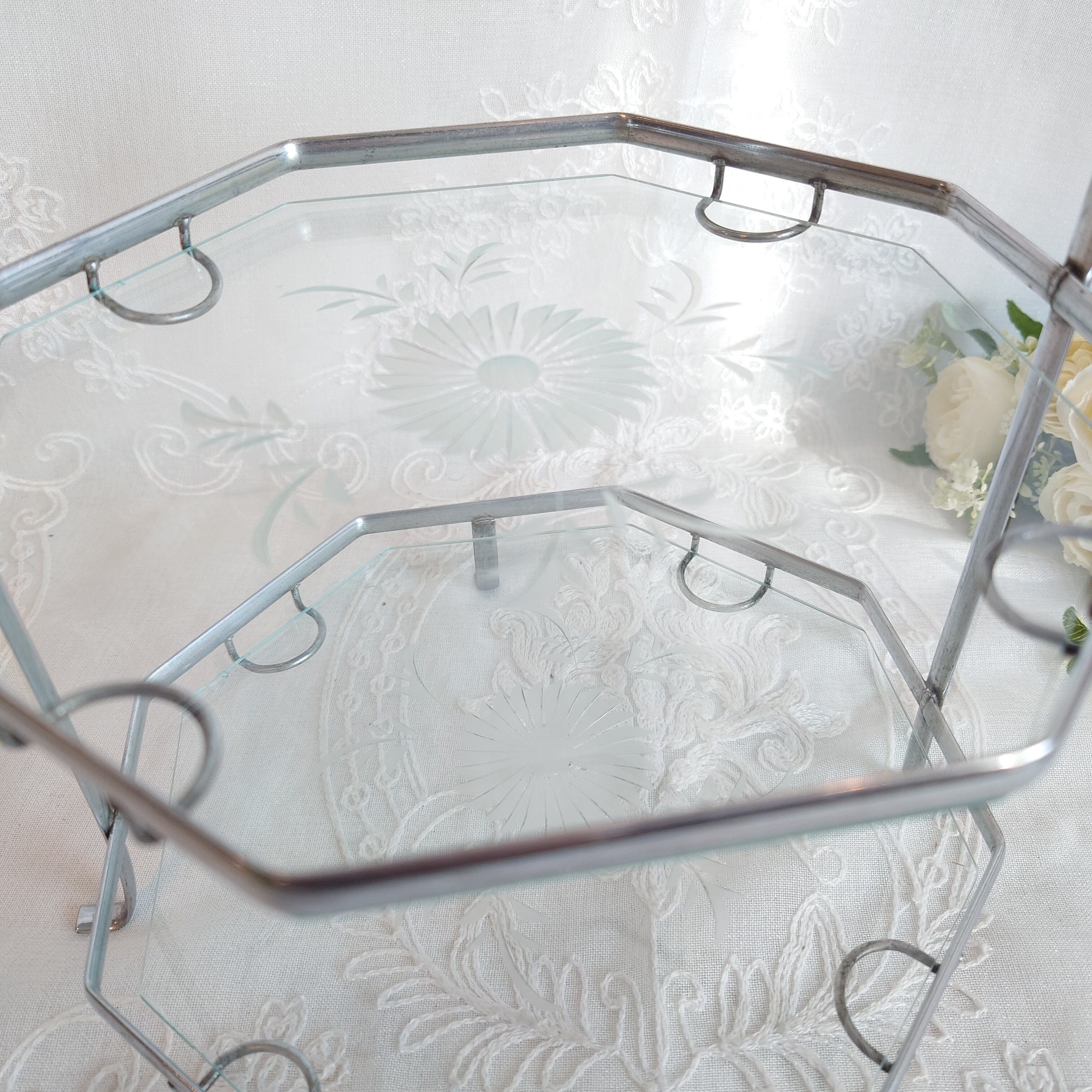 ガラスにはお花のモチーフがエッチングされており、とても可愛いケーキスタンドです