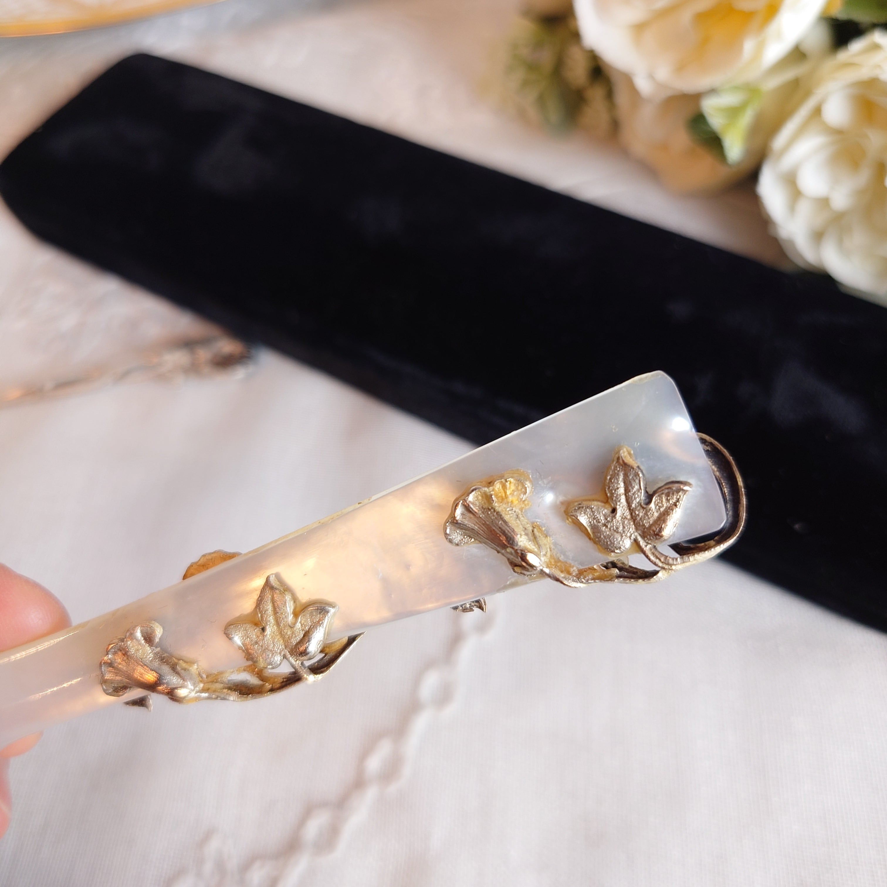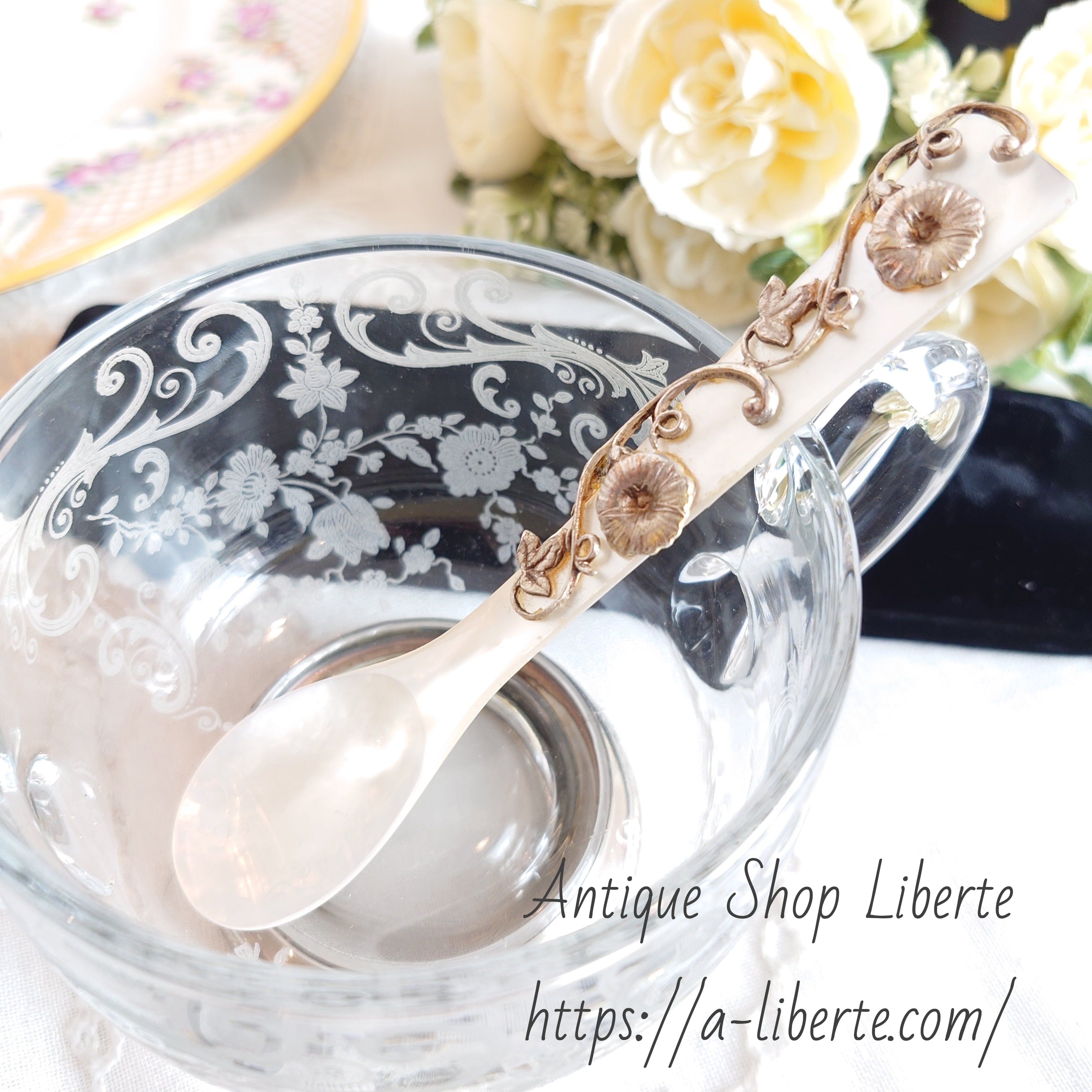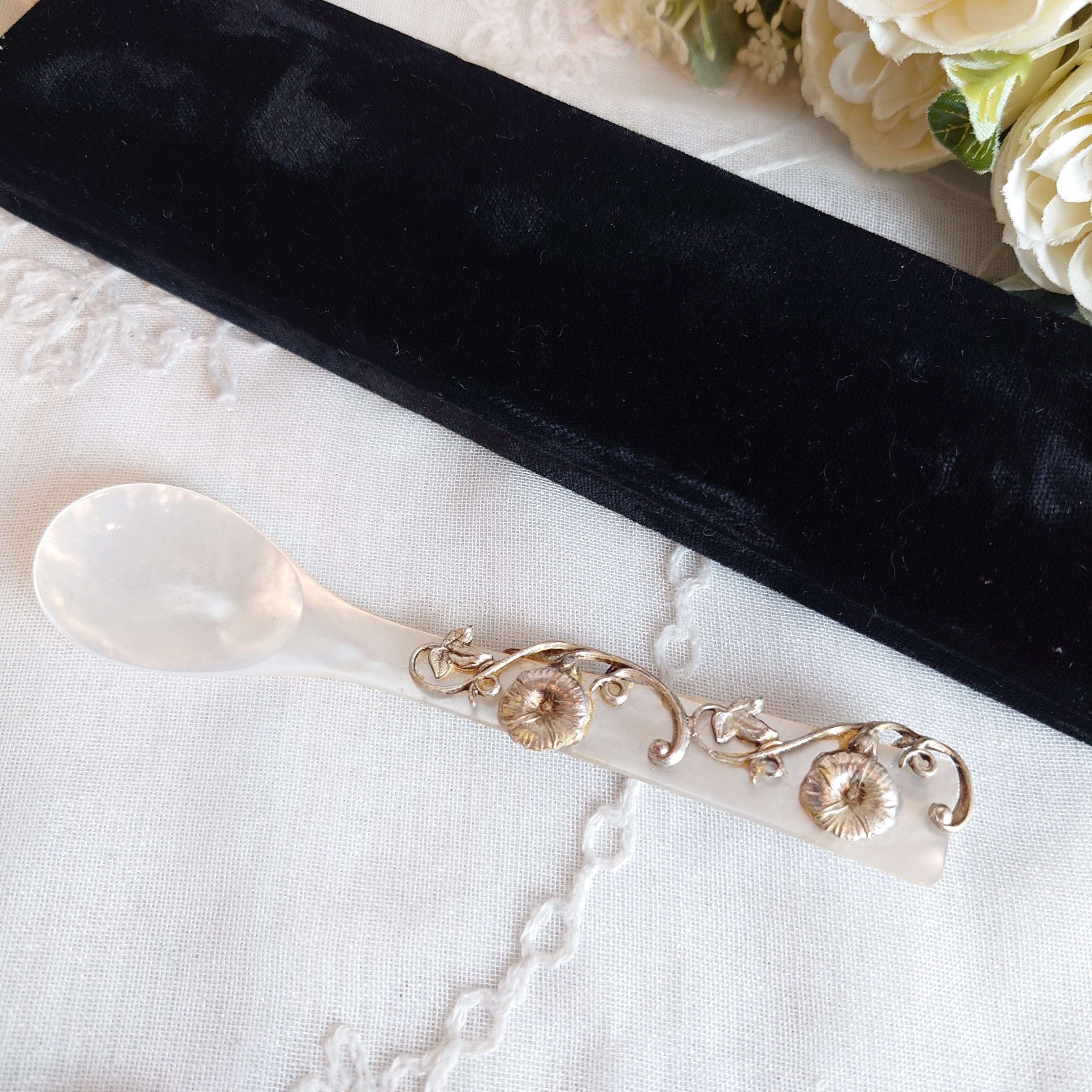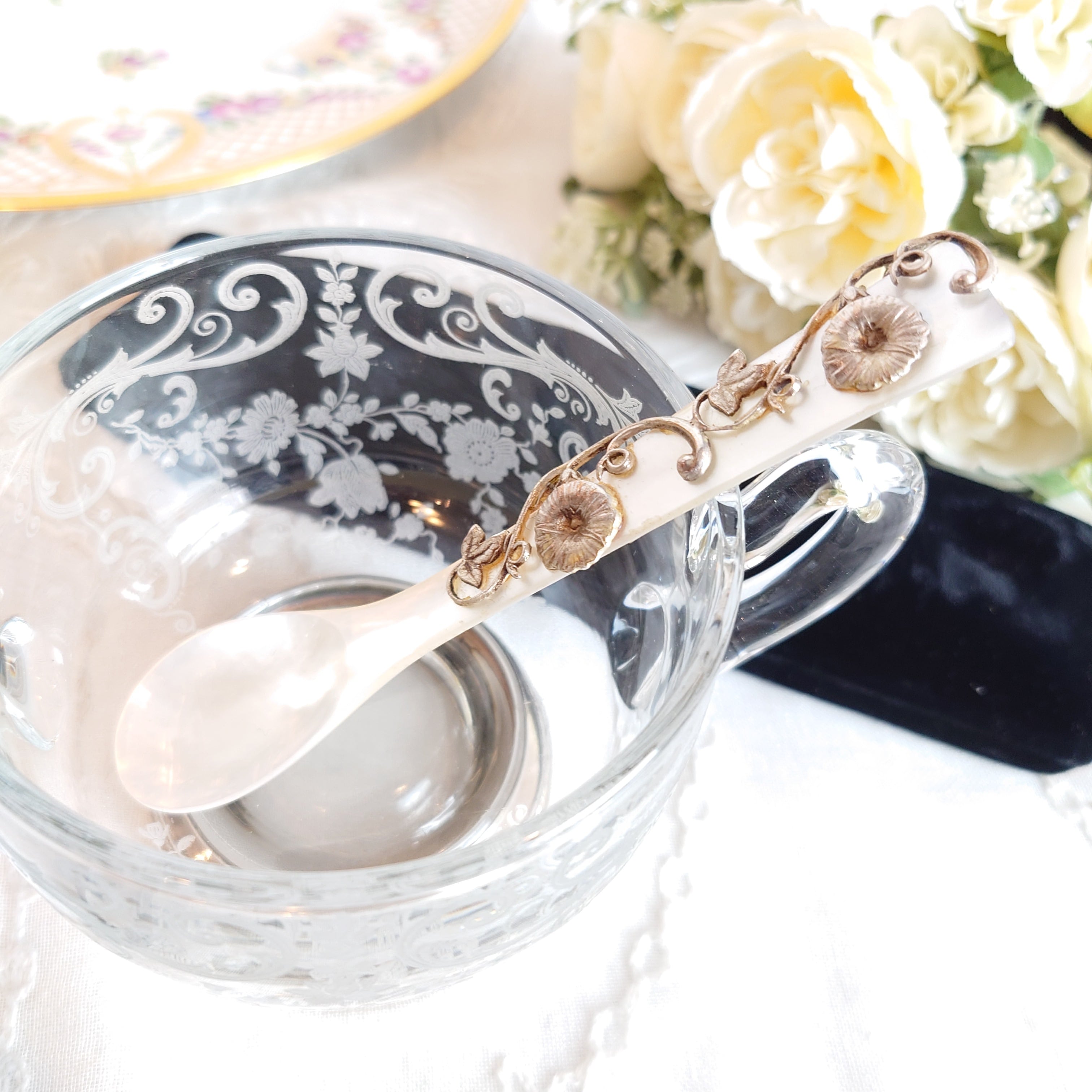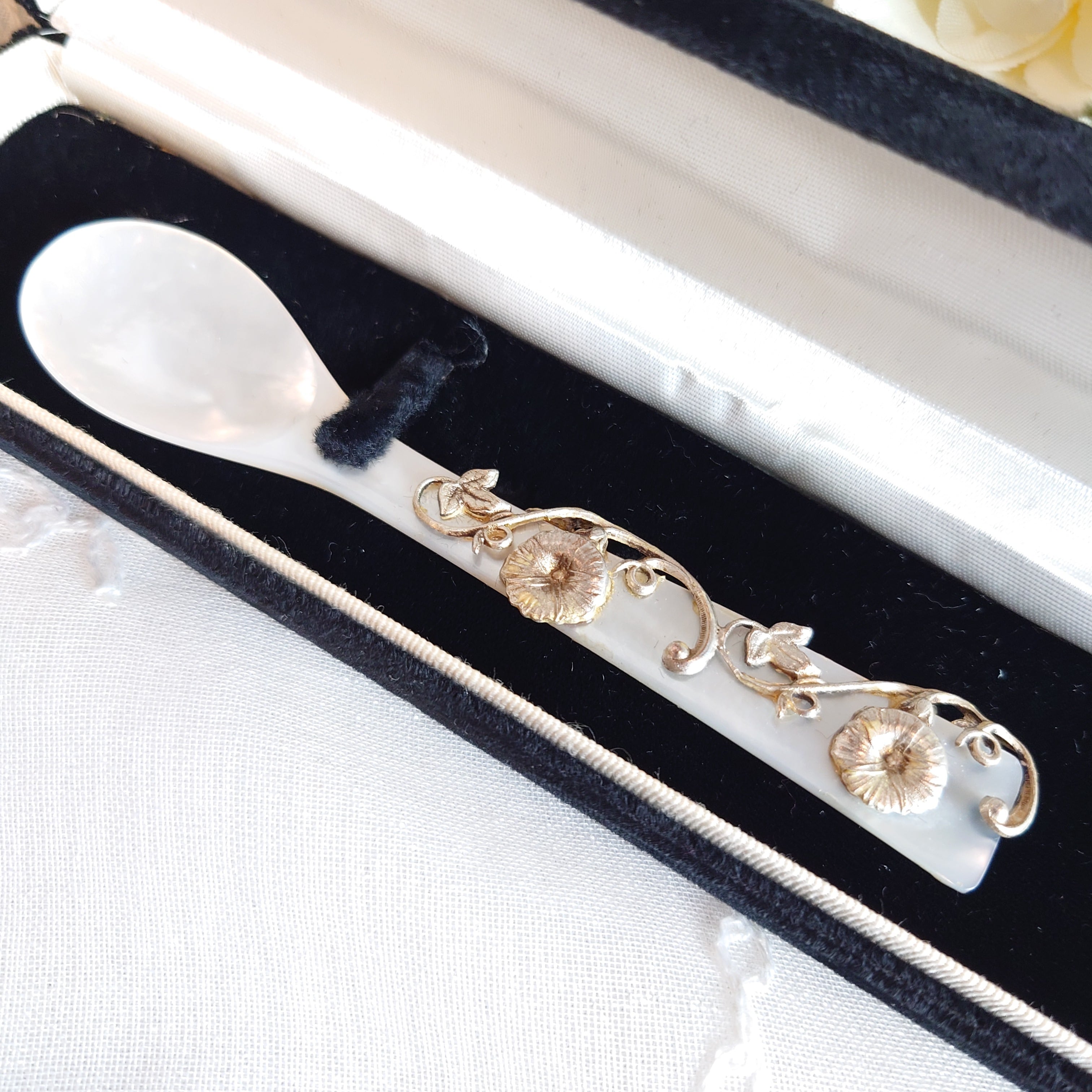 モーニンググローリーの銀装飾が施された白蝶貝のスプーンでとても可愛らしいデザインです
