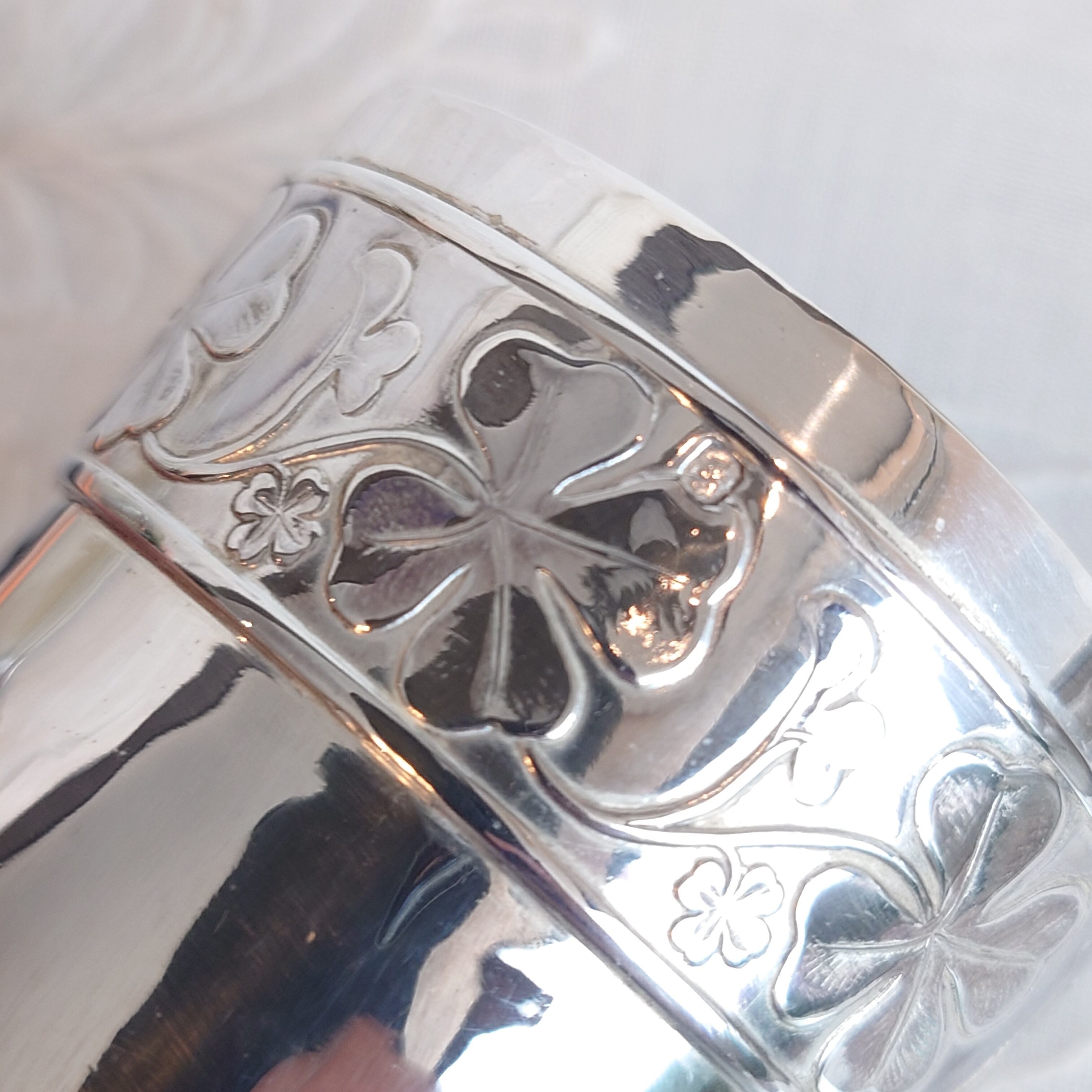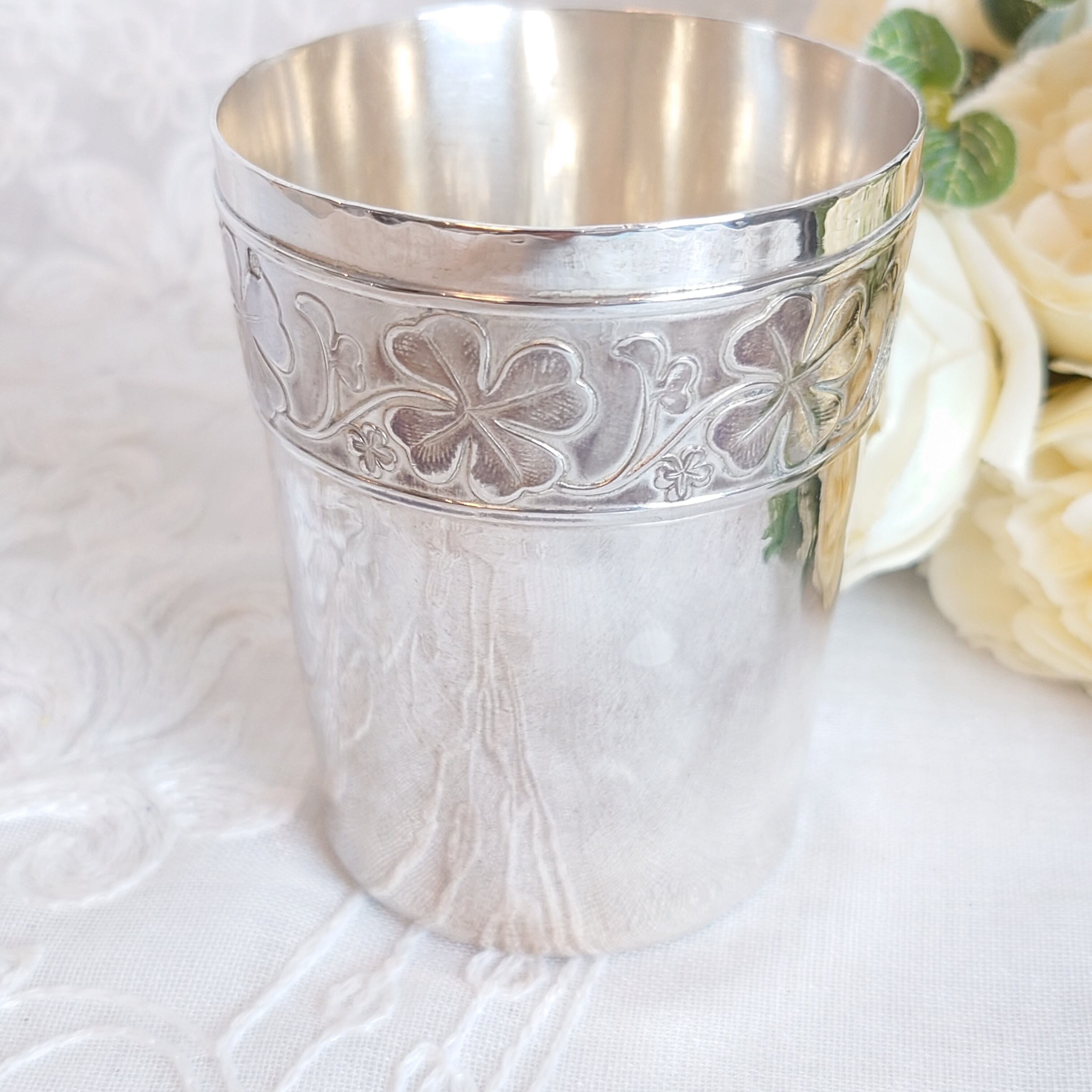 クローバーのデザインが施された美しい仕上がりのタンブラーカップです