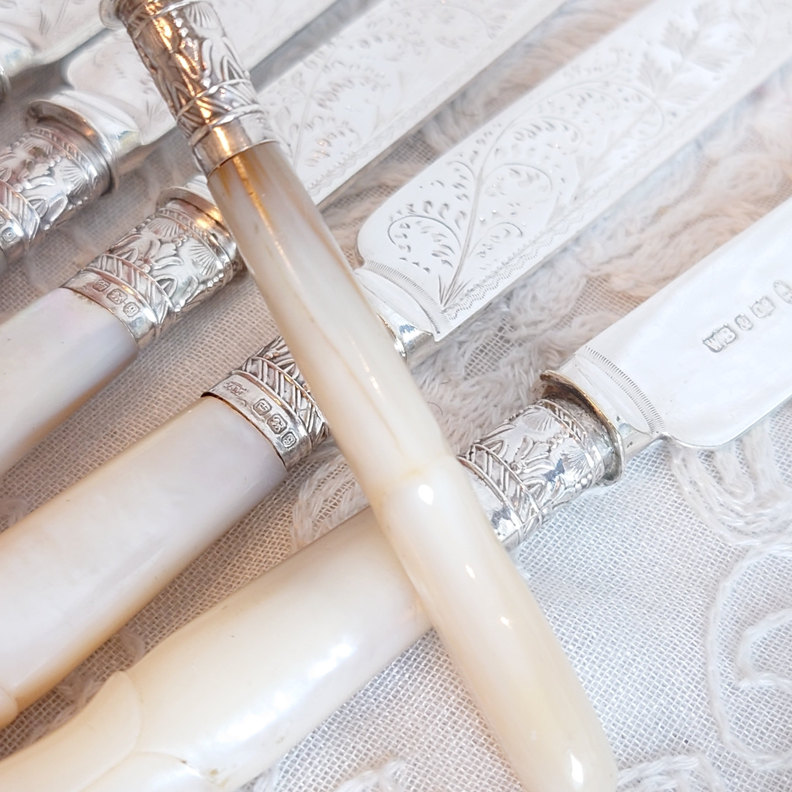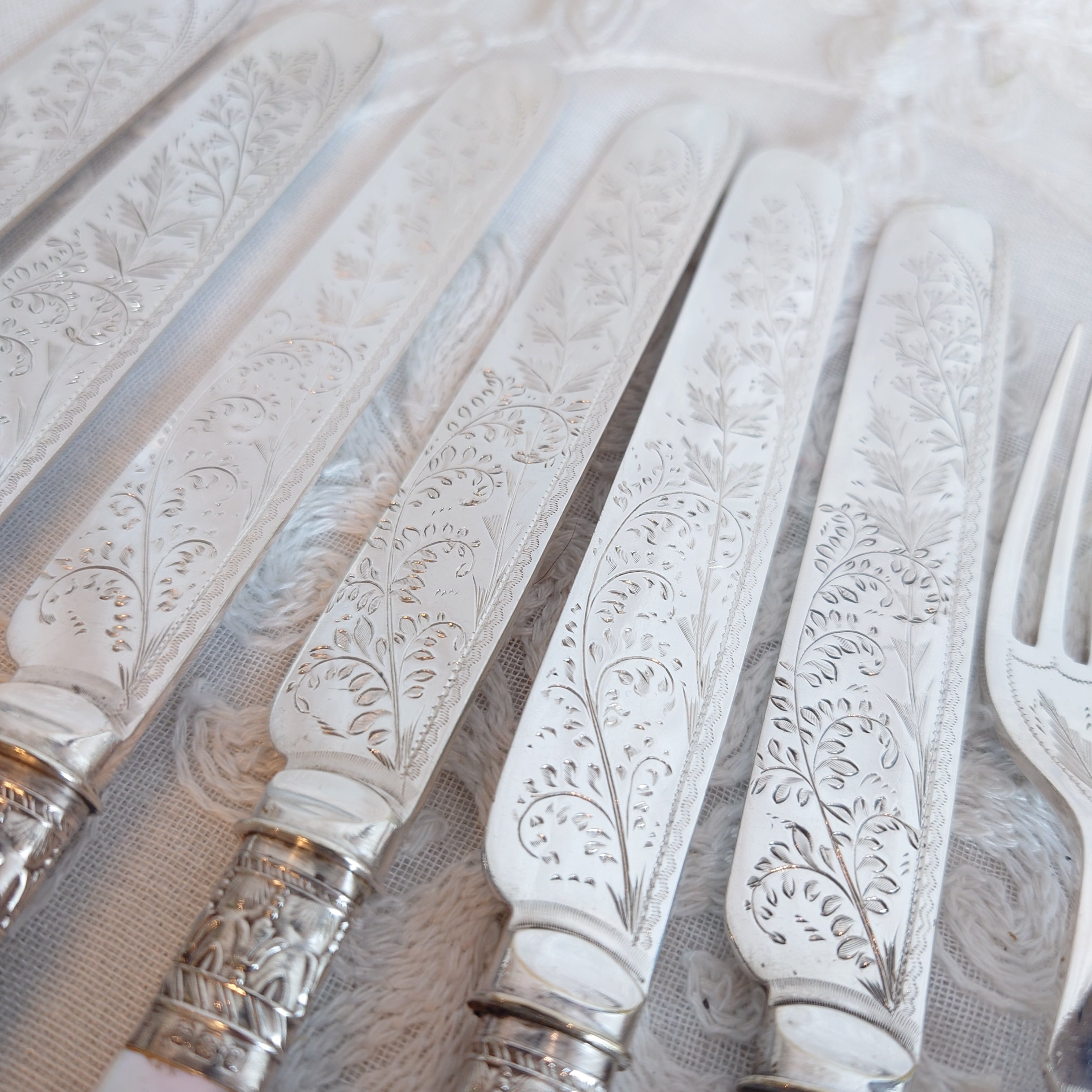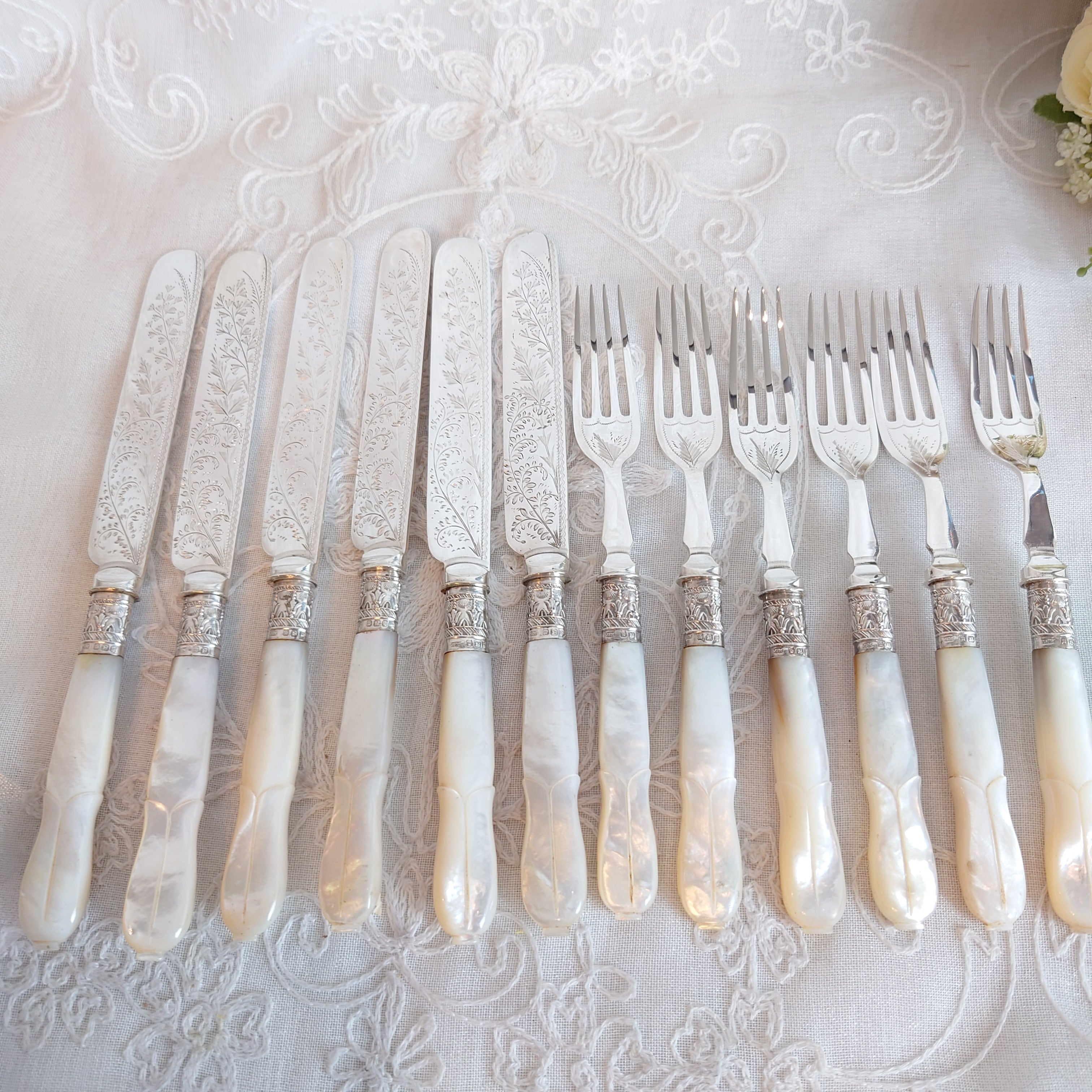 リーフモチーフがナイフの刃先にエングレービングされており、持ち手の白蝶貝も艶のある光沢を放っており、大変美しいカトラリーセットです