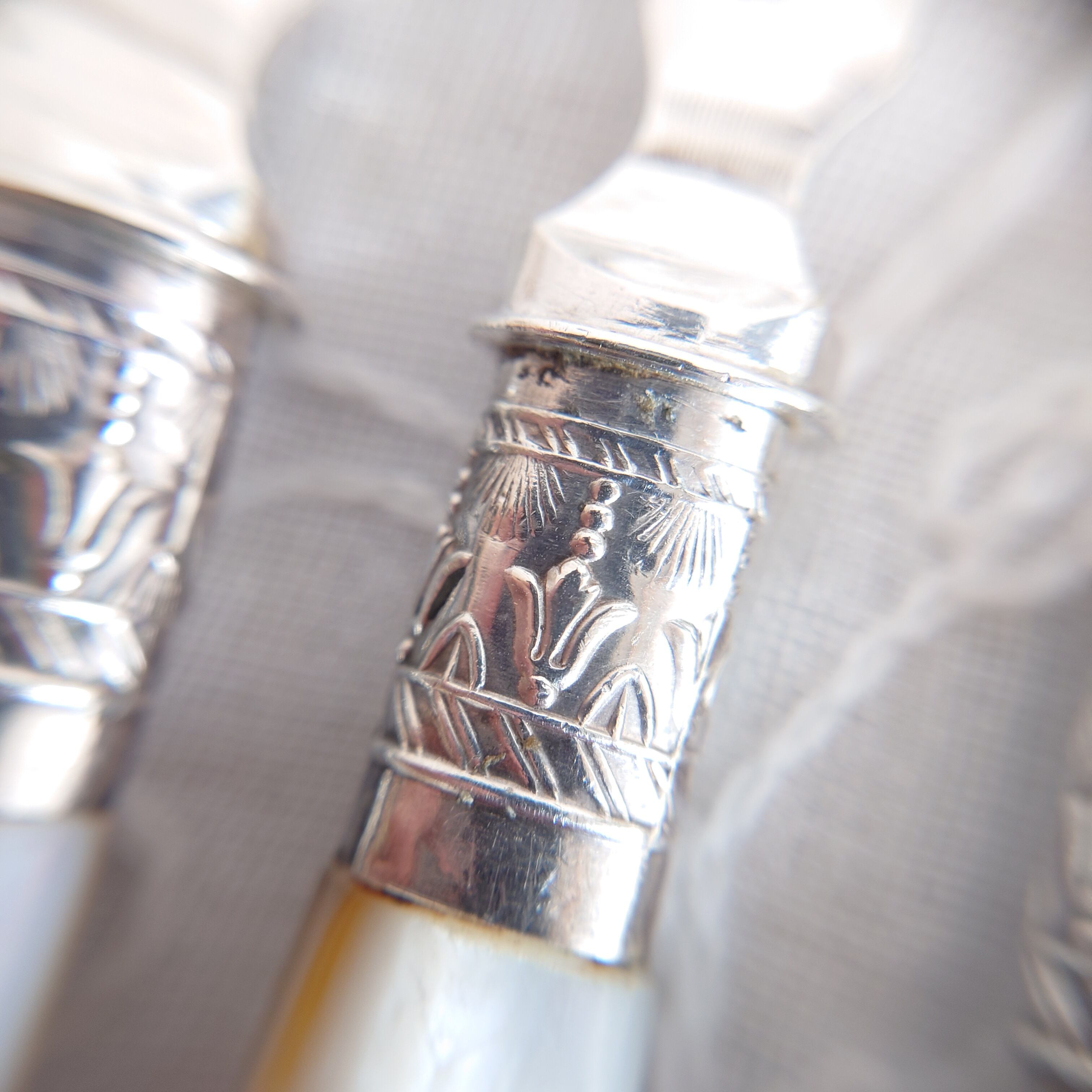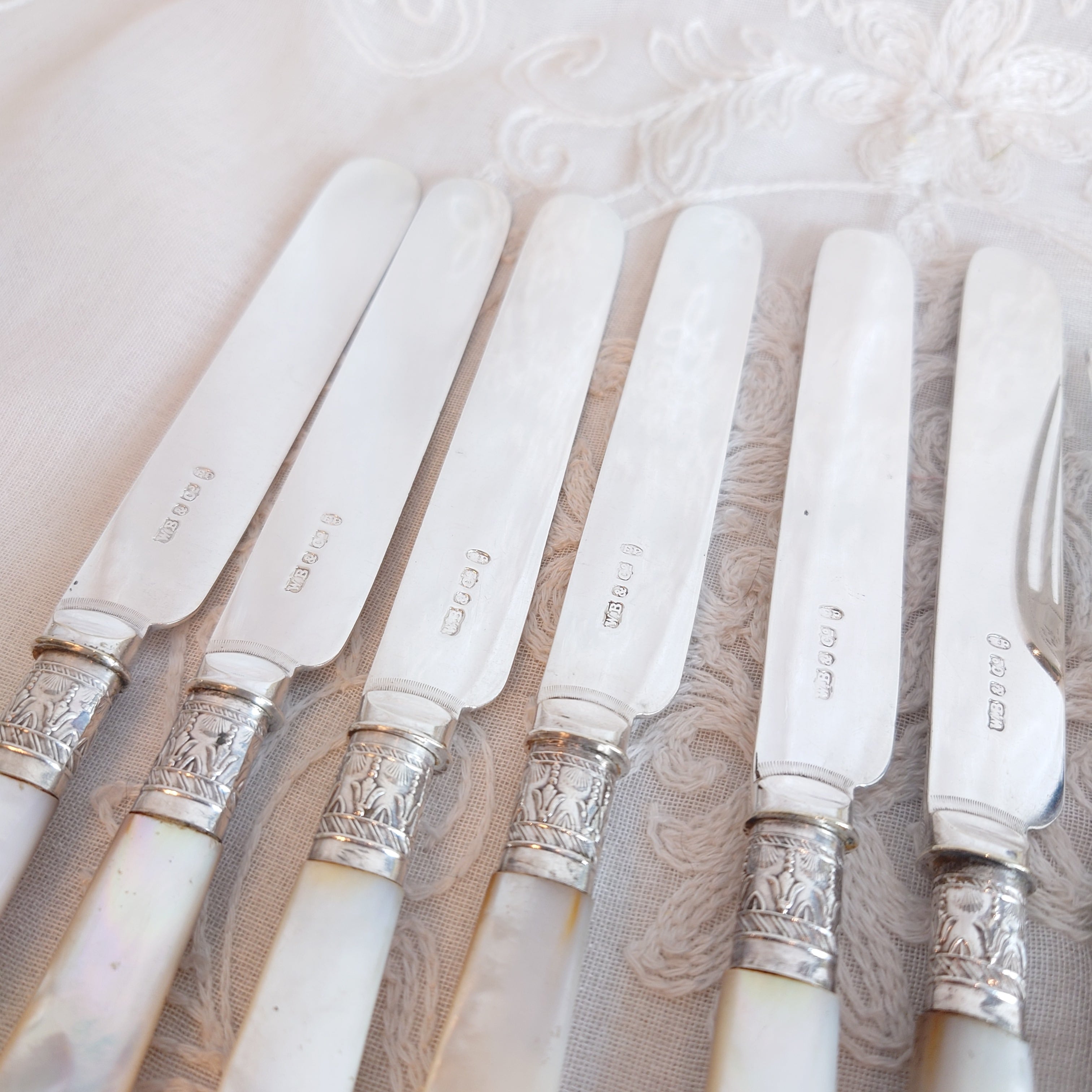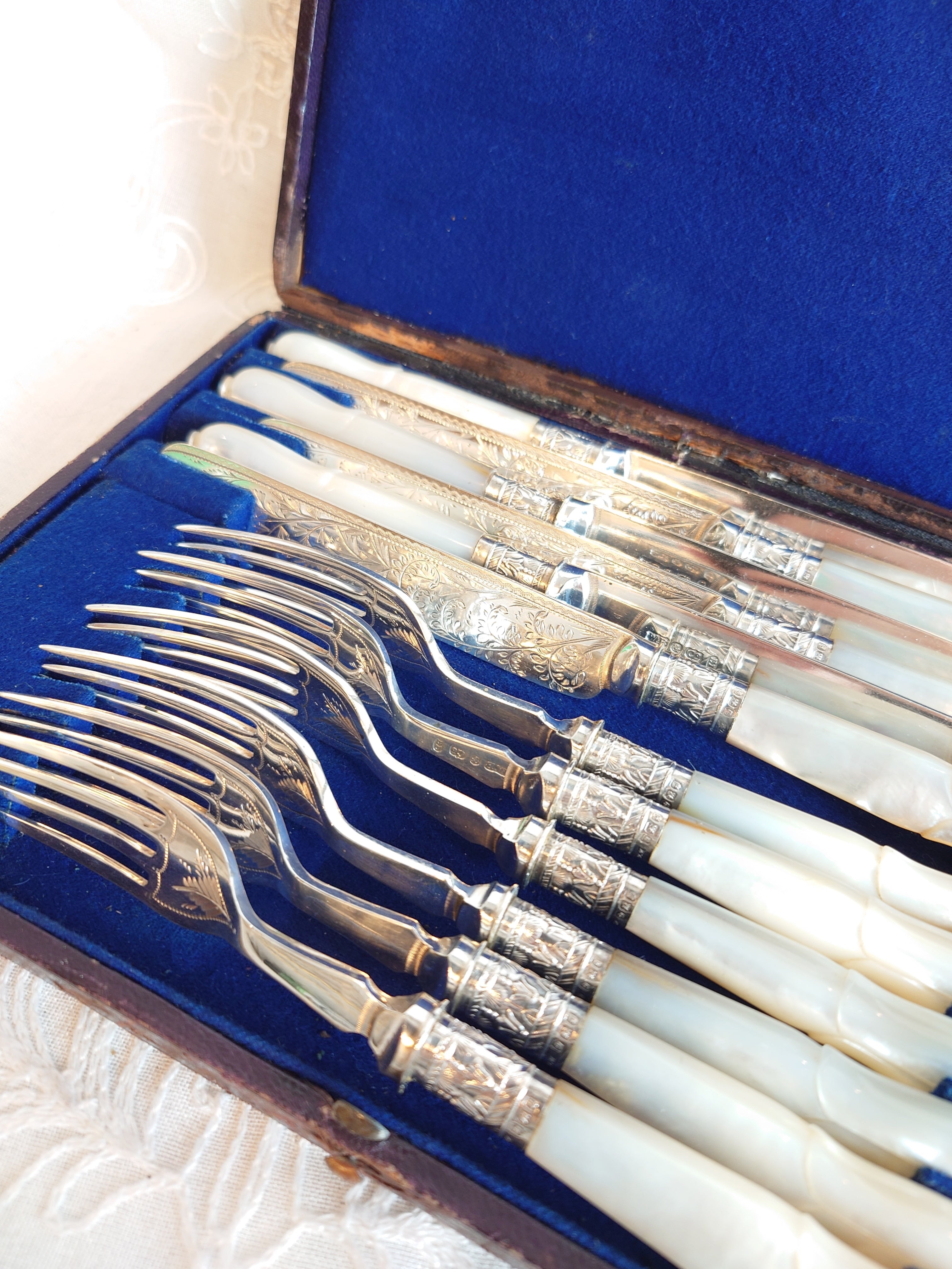 リーフモチーフがナイフの刃先にエングレービングされており、持ち手の白蝶貝も艶のある光沢を放っており、大変美しいカトラリーセットです