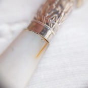 白蝶貝も美しく一部スレや黒ずみが見られますが、概ね真っ白で真珠のような光沢を放っております。白蝶貝ハンドルには凹みやエクボが生じでいるものもございますが天然素材によるものですので、その点はご理解頂けますと幸いです