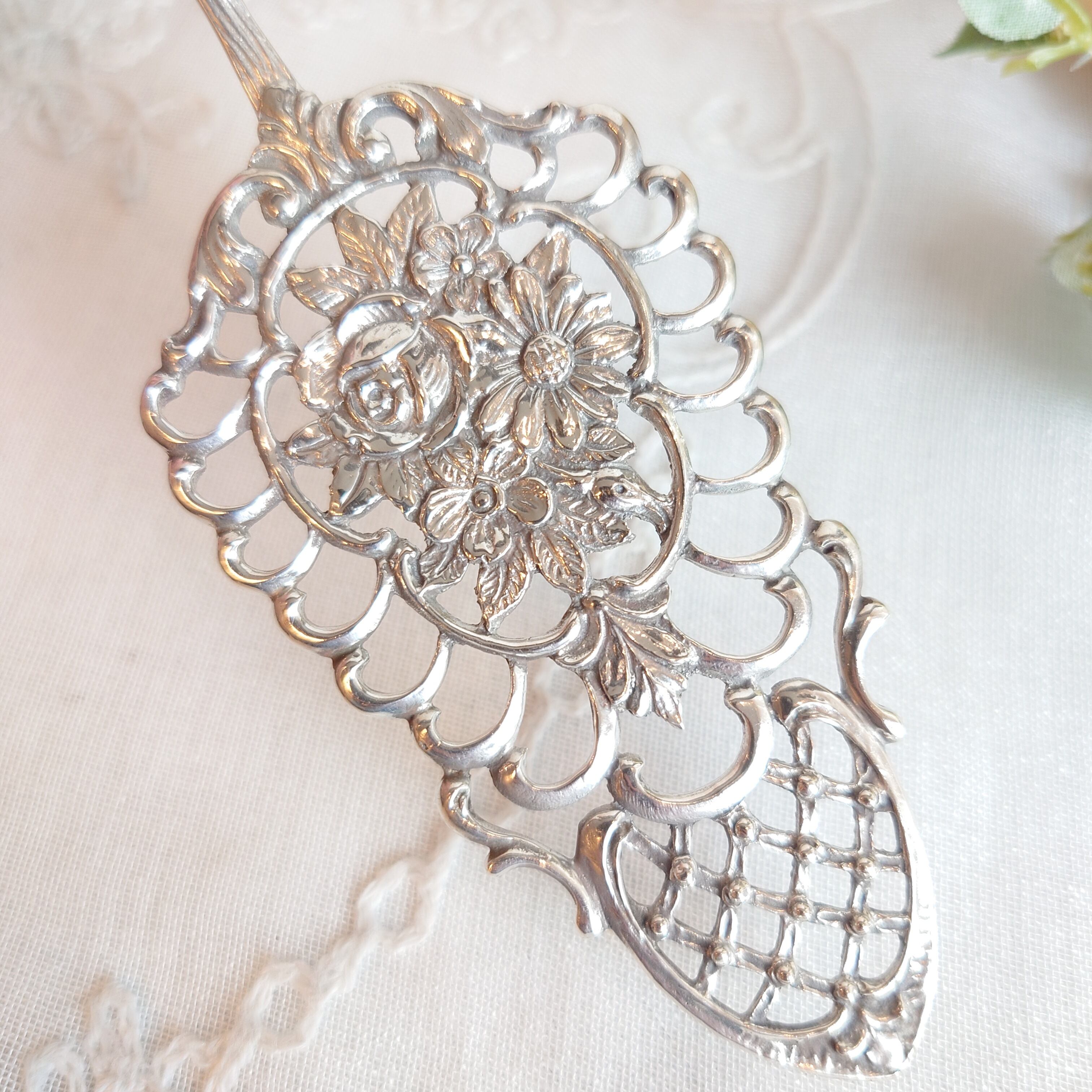ラティスのデザインとデイジーや薔薇などのお花のモチーフがとっても可愛らしいケーキサーバーです