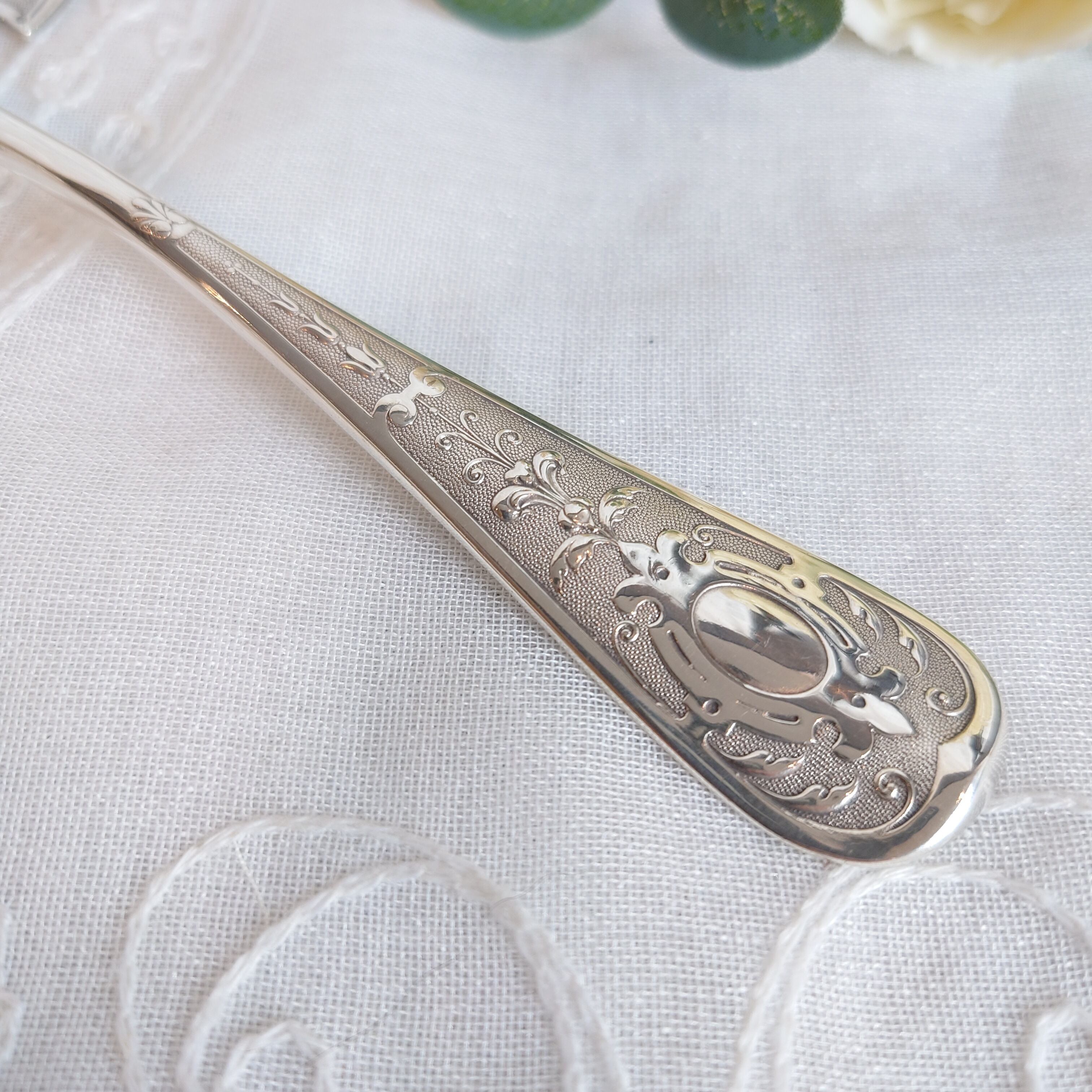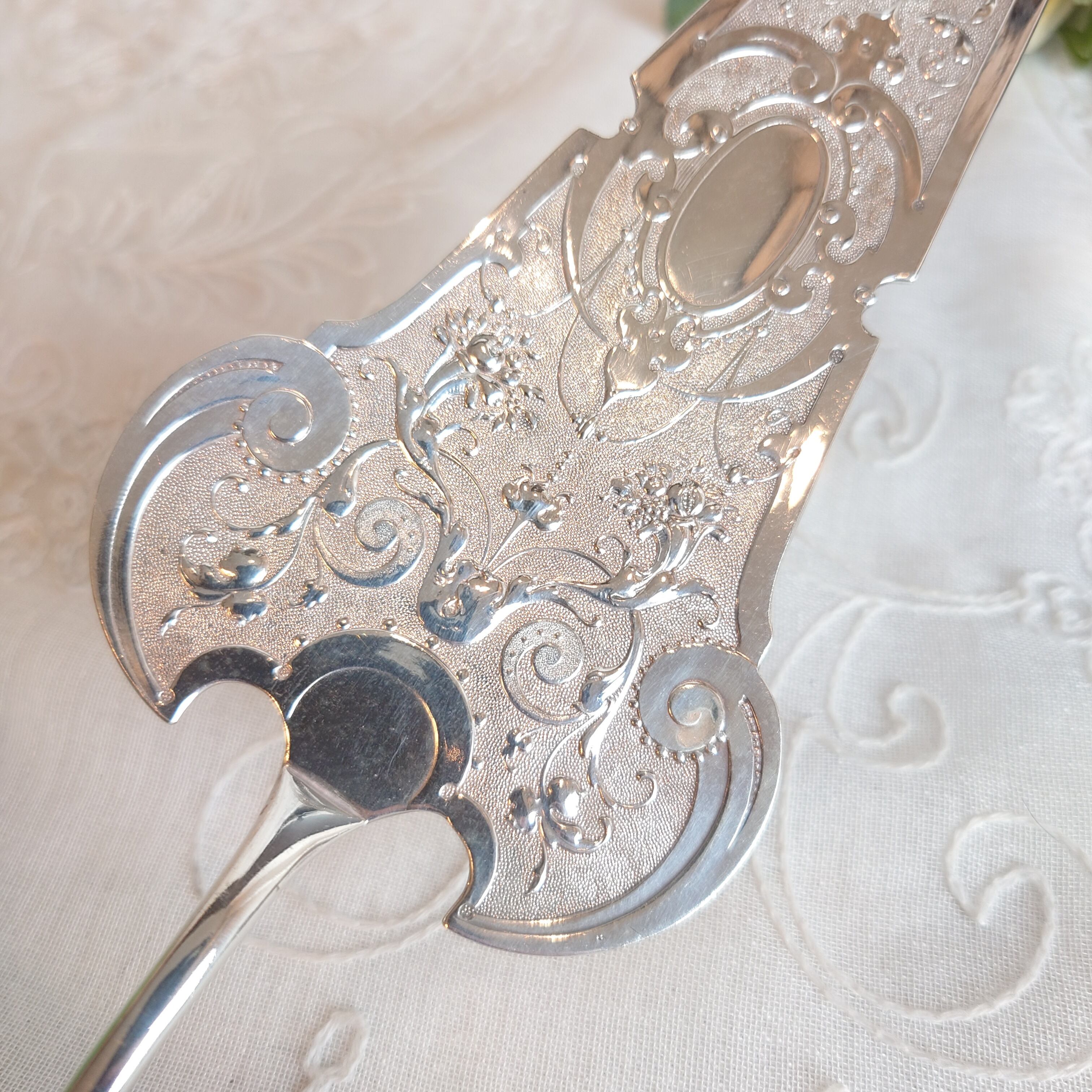 蝶や草花のモチーフが浮き彫りのように表現されており、とても美しいケーキサーバーです